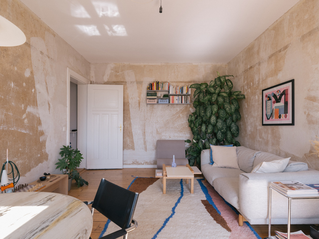 This designer-owned altbau apartment in Neukölln melds mid-century aesthetics, Italian Memphis design, and Japandi elements, creating a vibrant and stylish living space.
