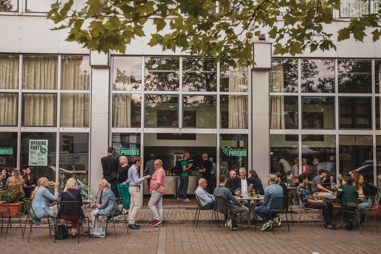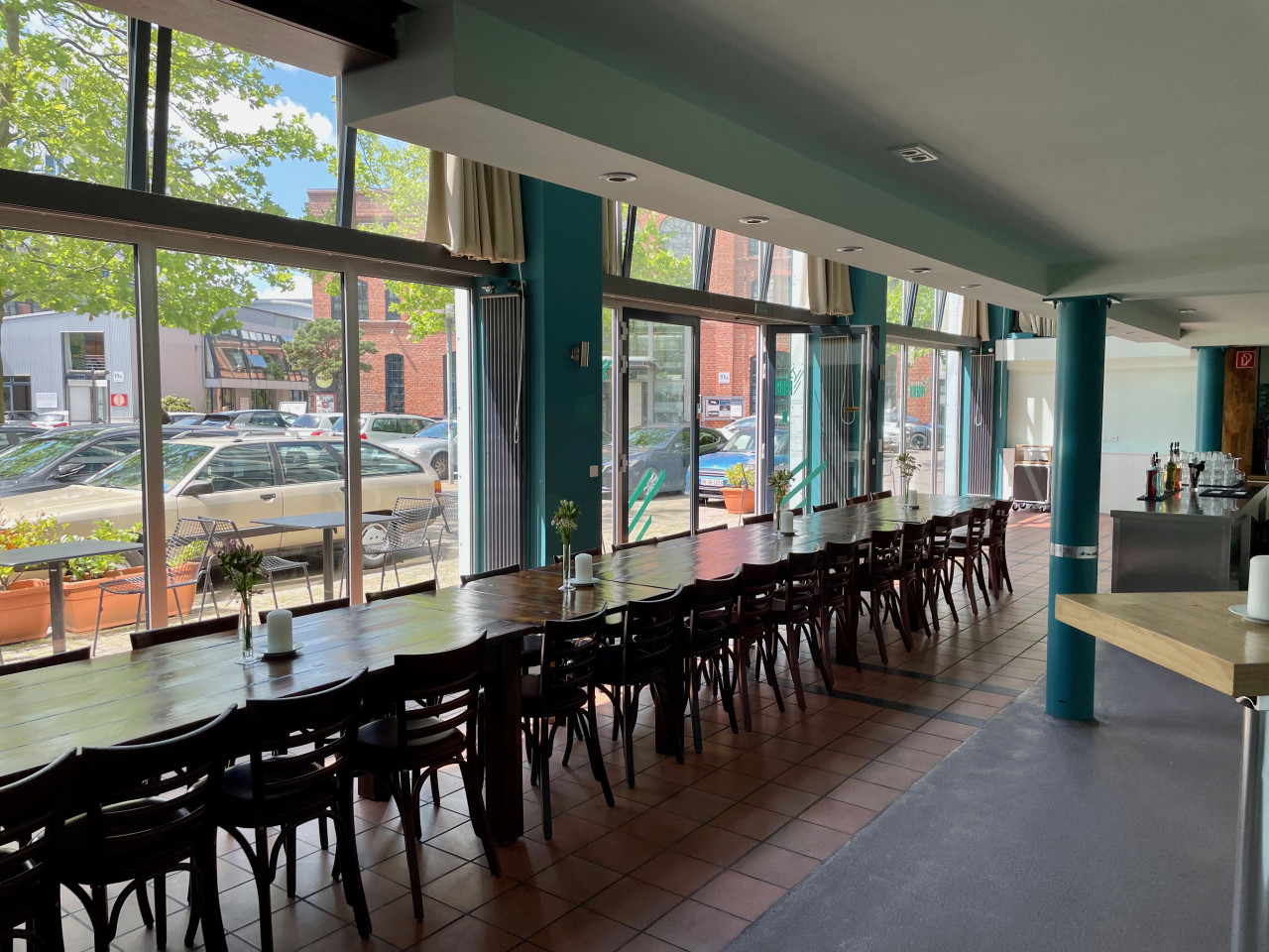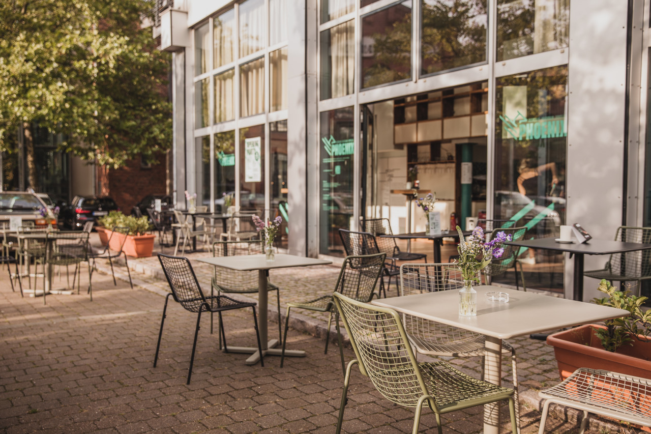 Transcending the indoors, a sunlit bar interior captivates with its elegant spiral staircase, metallic finishes, and sculptural use of glass and stone. Windows and glass doors frame transitions to a leafy, urban café terrace, where iron chairs and mosaic paving invite scenes of relaxed social engagement under umbrellas and verdant trees. The patio’s thoughtful layout, complemented by reflective surfaces and vibrant plantings, offers a naturally lit, metropolitan backdrop—perfect for film, photography, or brand immersion events. Throughout, a sense of cultivated serenity and modern romance makes this address distinctly versatile and visually resonant.