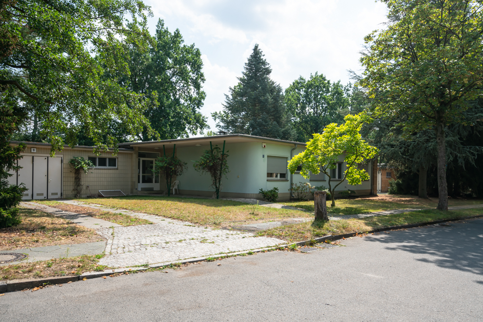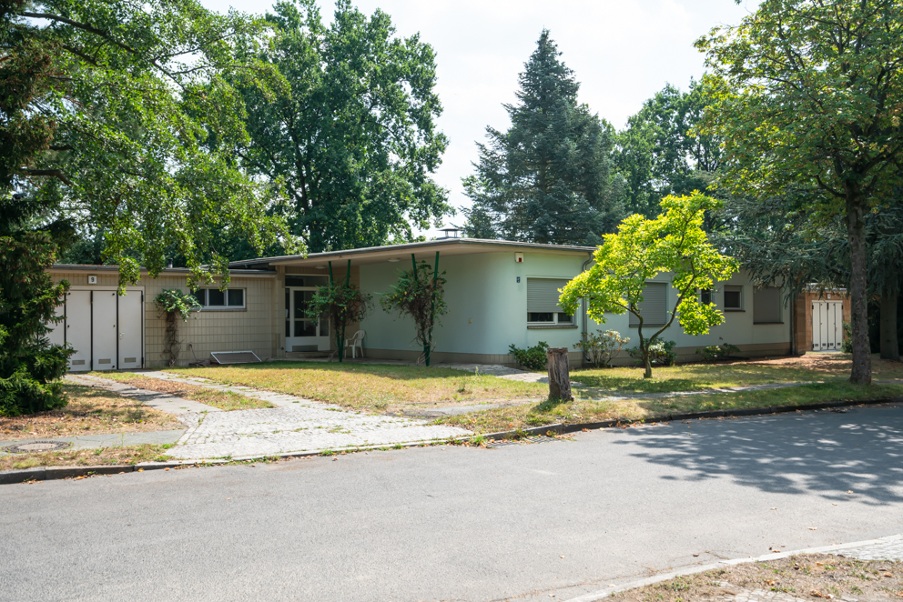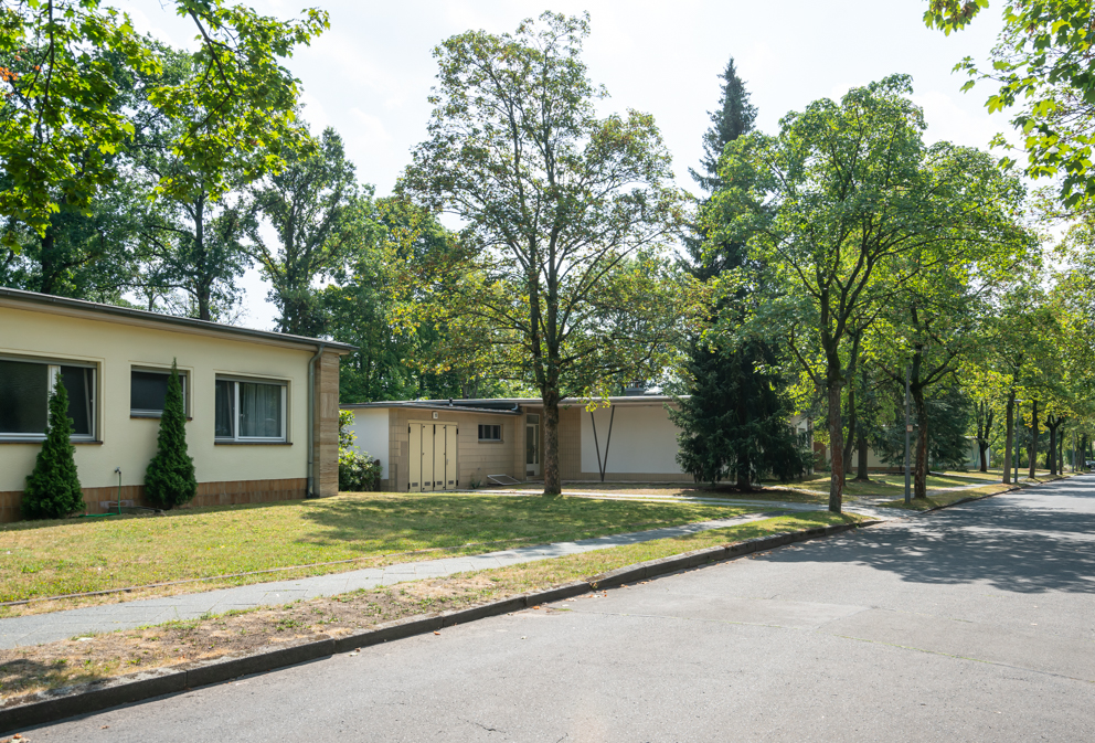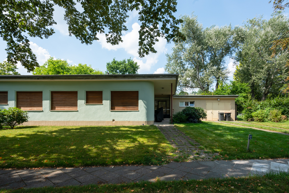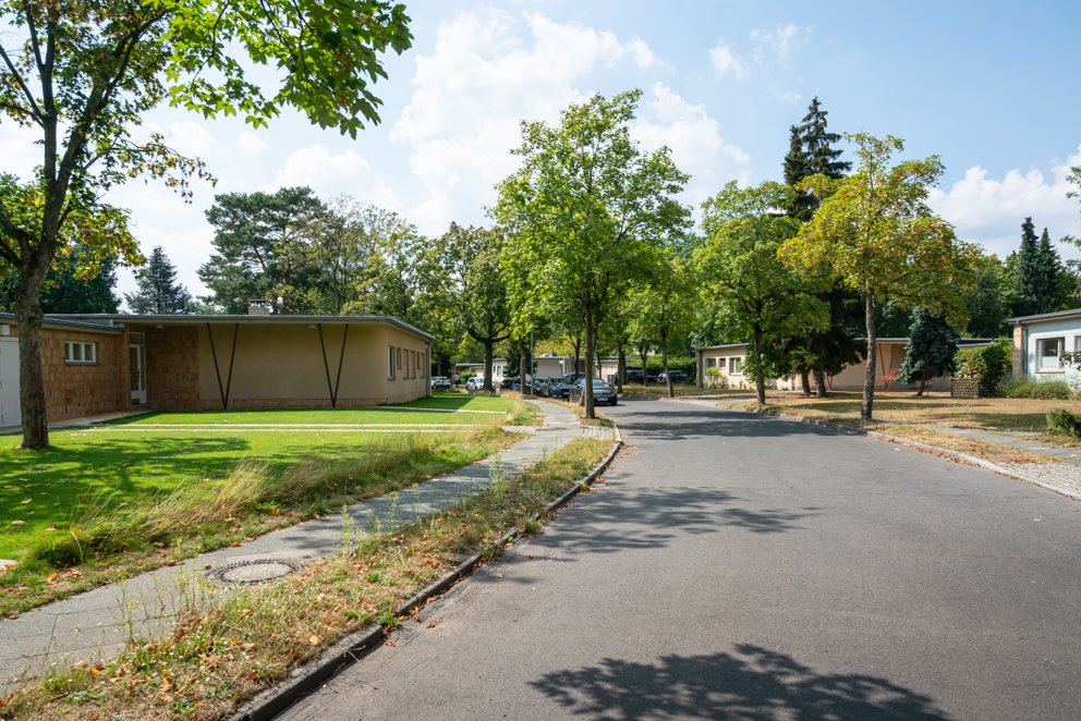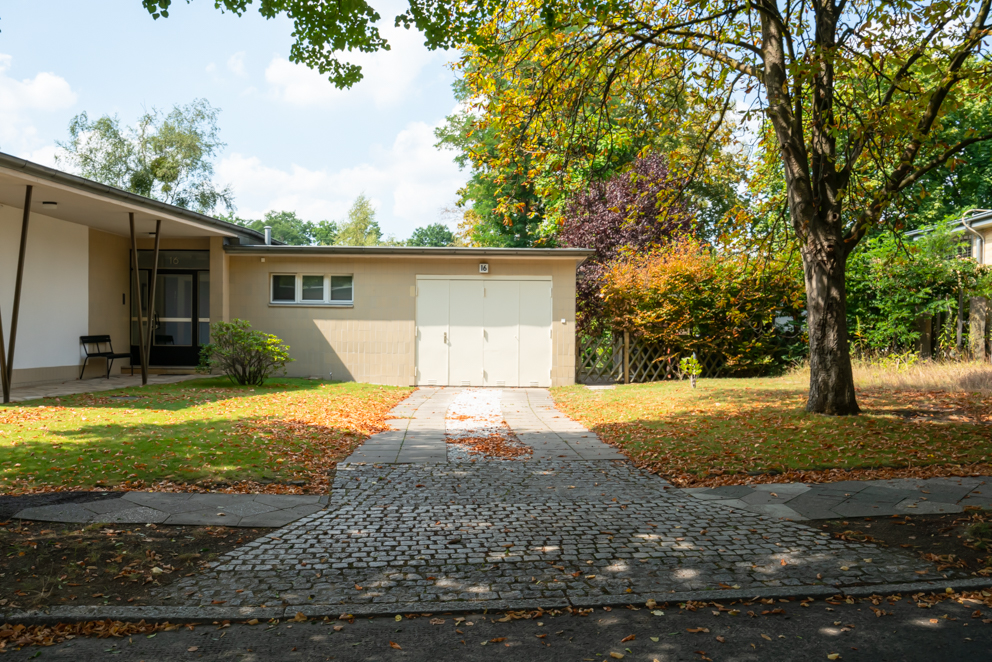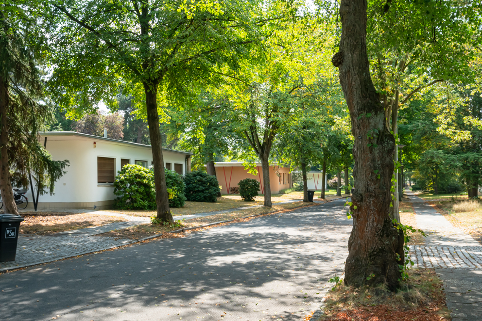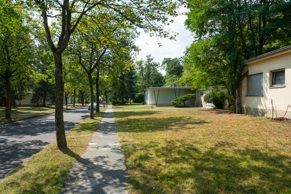 The bungalows built around the park are flat-covered, ground-level type buildings with typical wide driveways and open front gardens designed according to the American model and by the Berlin architect Willy Ehrlichmann.