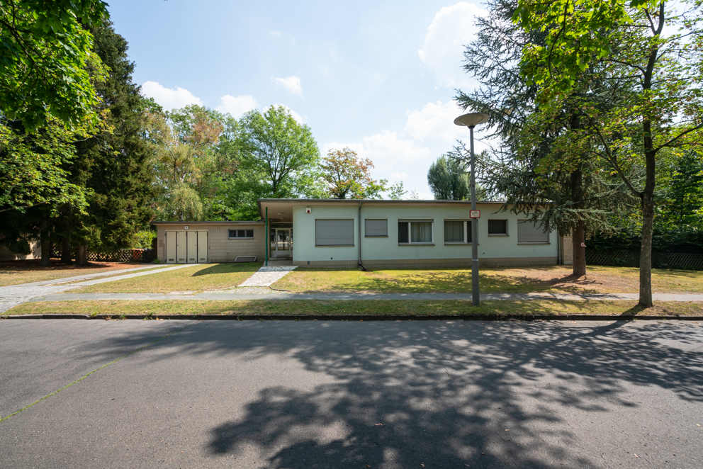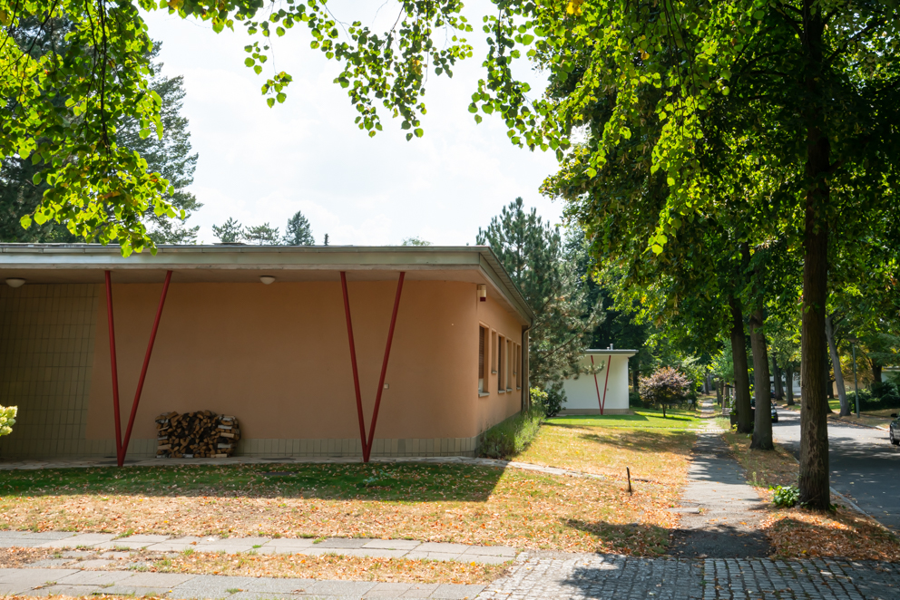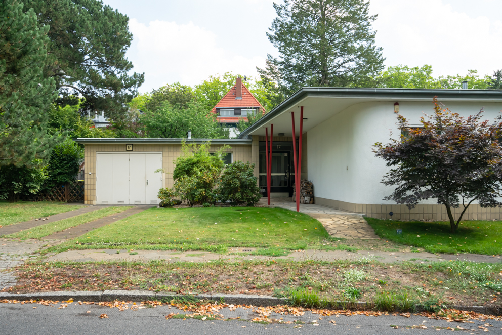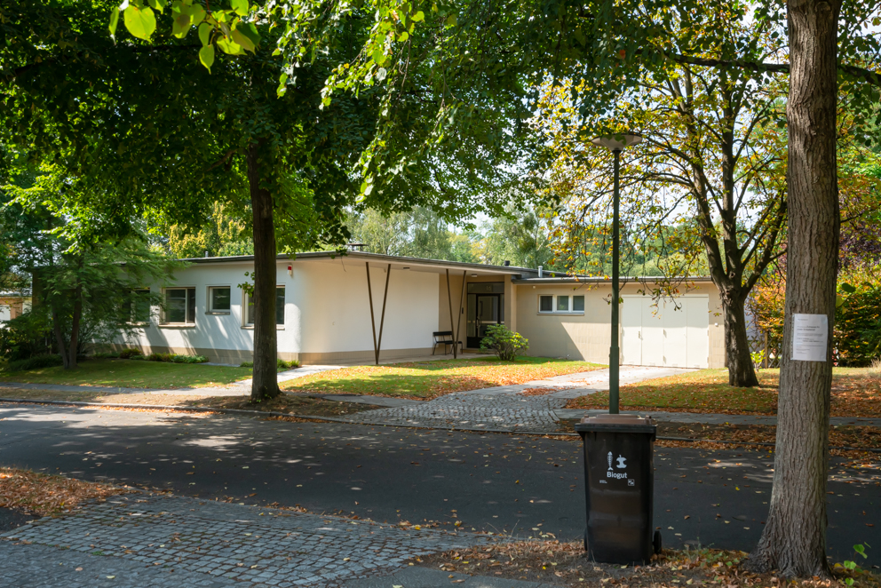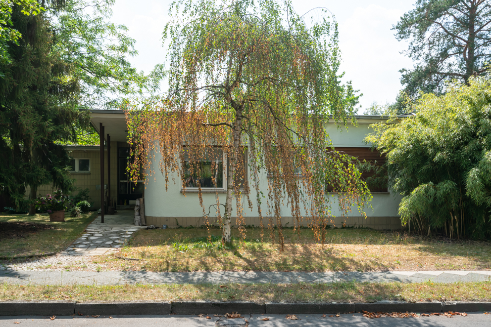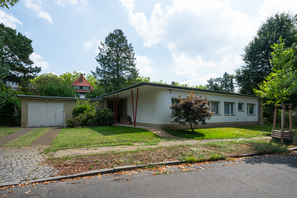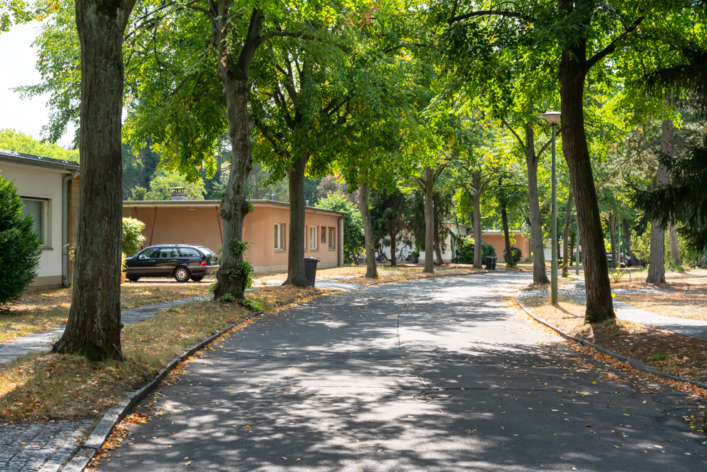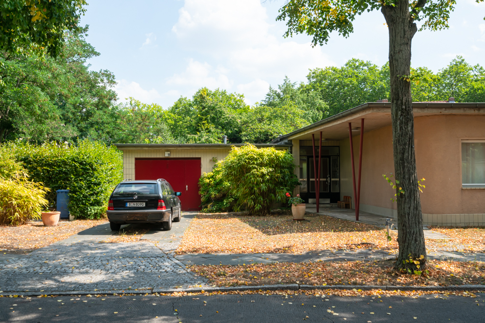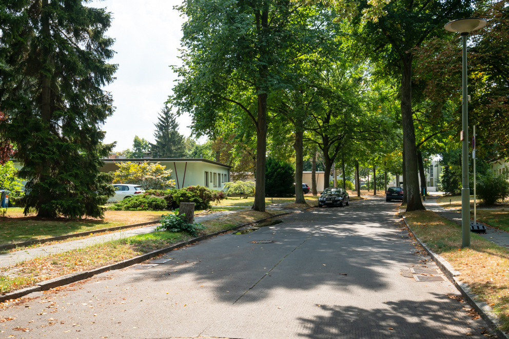 The bungalows built around the park are flat-covered, ground-level type buildings with typical wide driveways and open front gardens designed according to the American model and by the Berlin architect Willy Ehrlichmann.