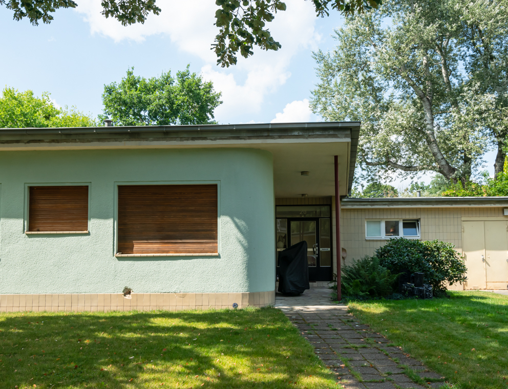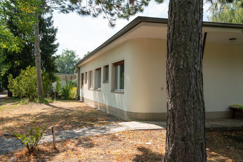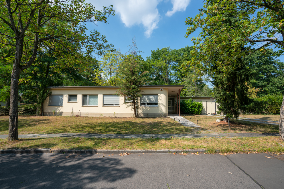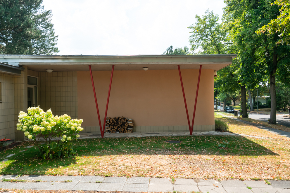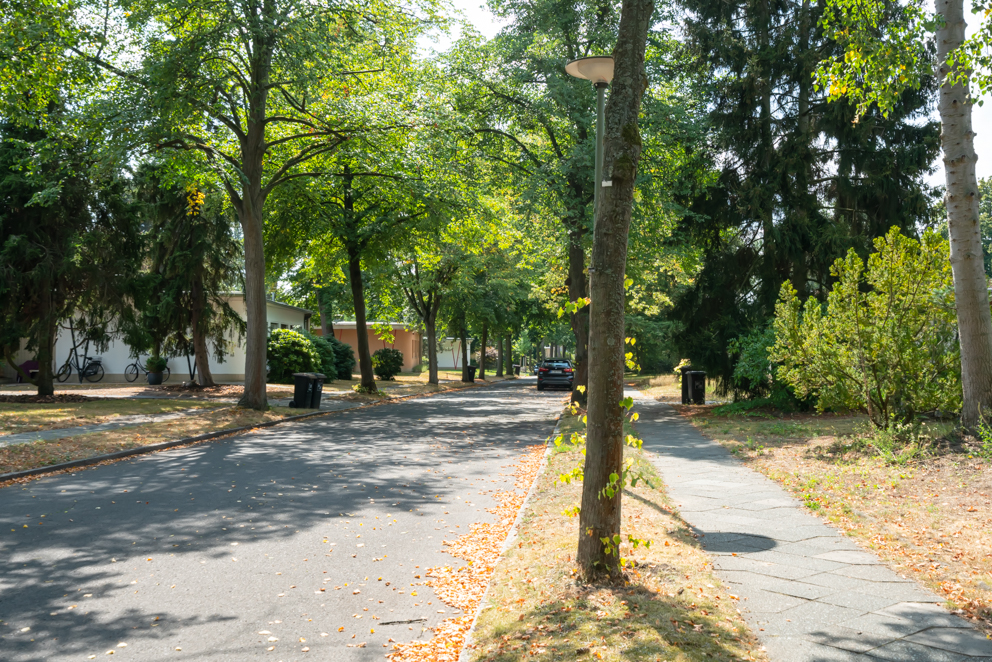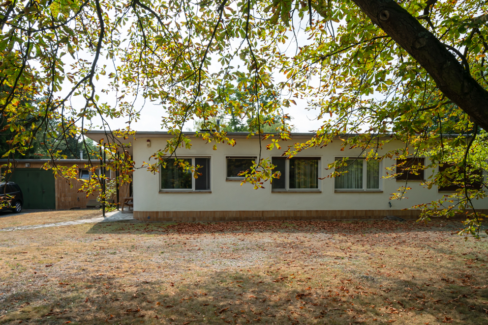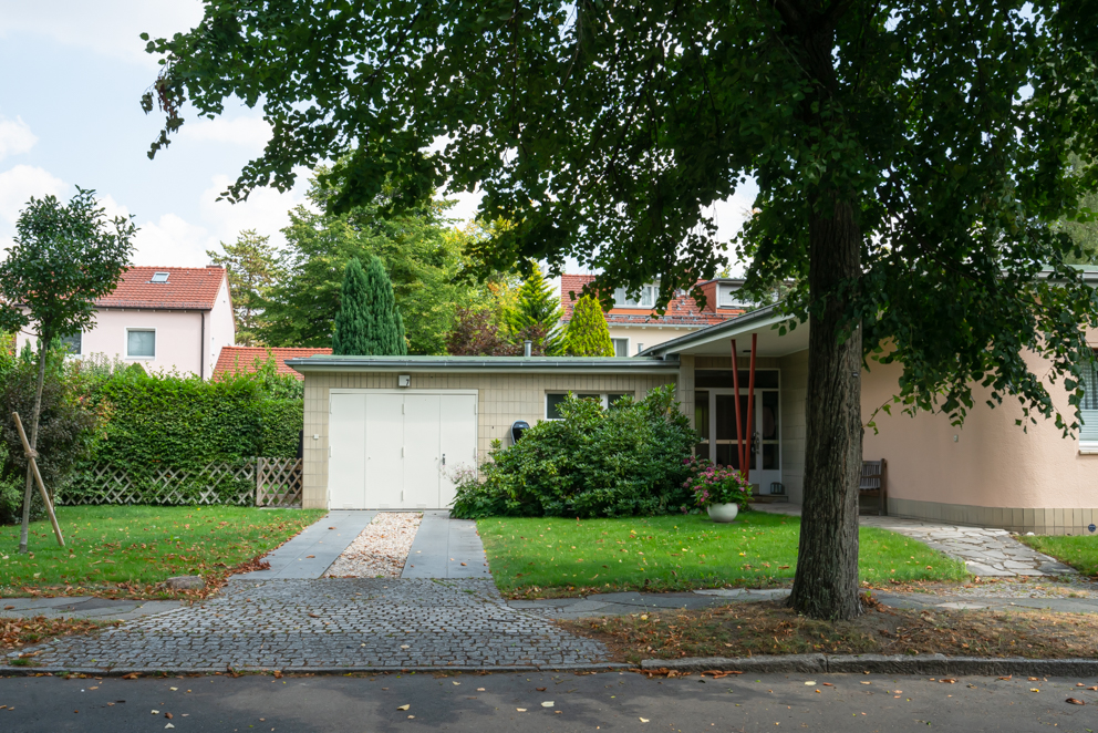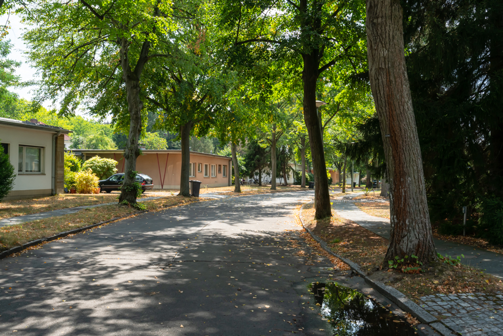 The bungalows built around the park are flat-covered, ground-level type buildings with typical wide driveways and open front gardens designed according to the American model and by the Berlin architect Willy Ehrlichmann.