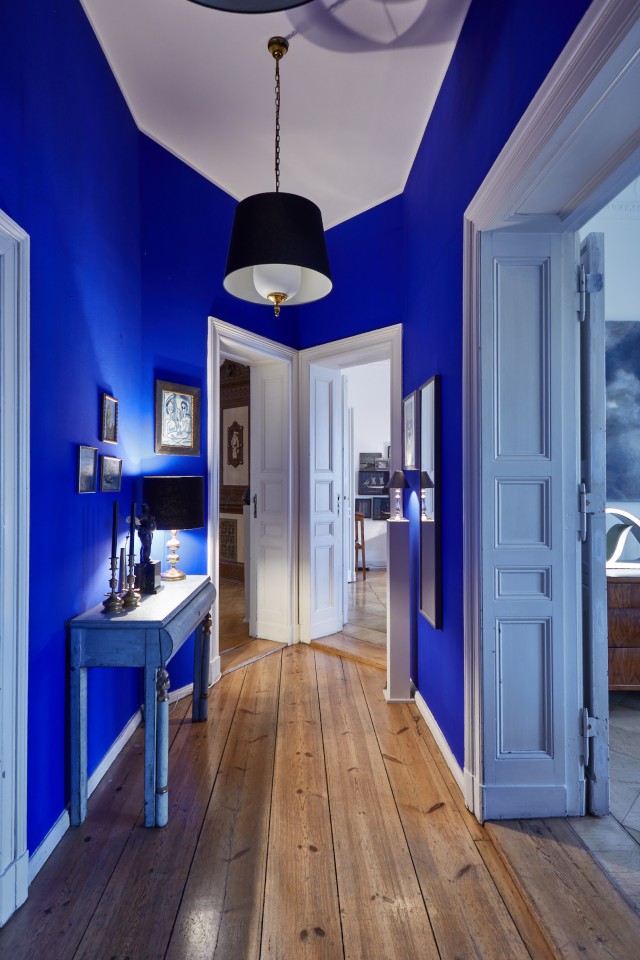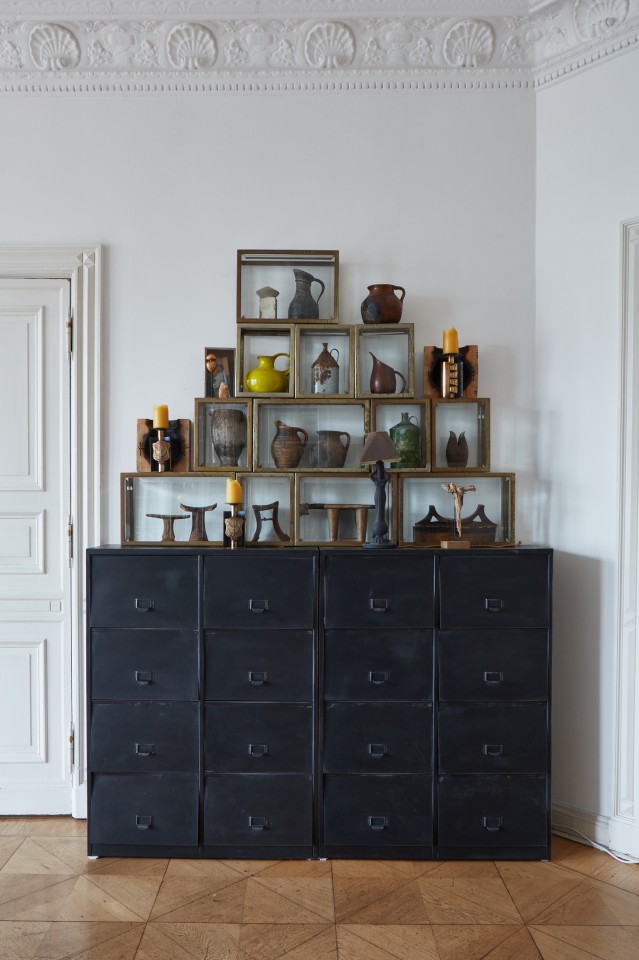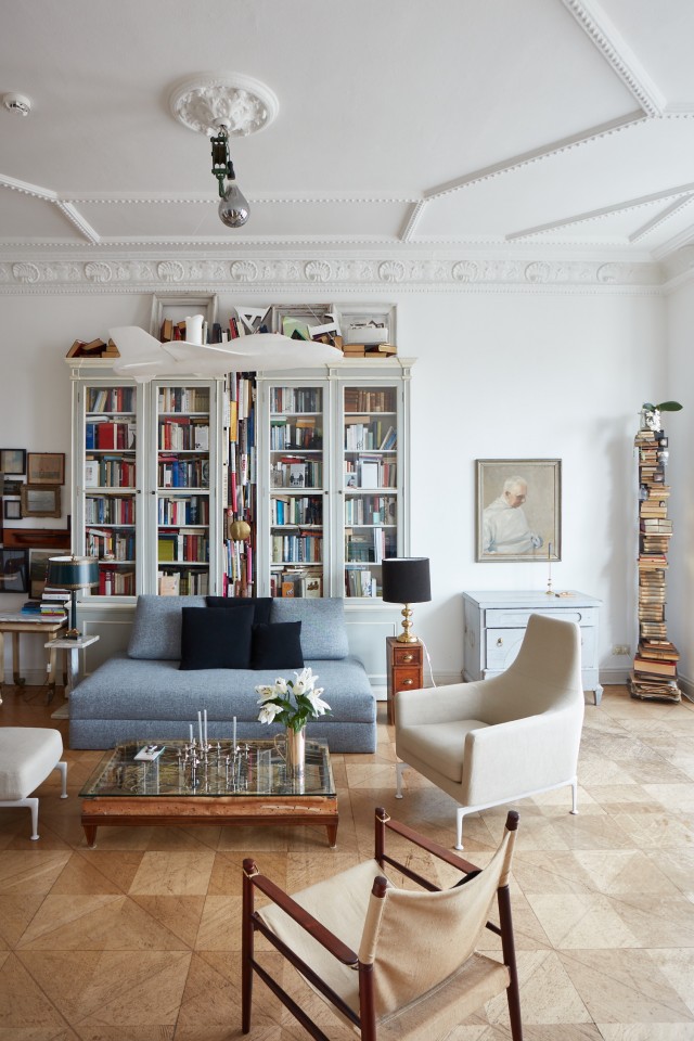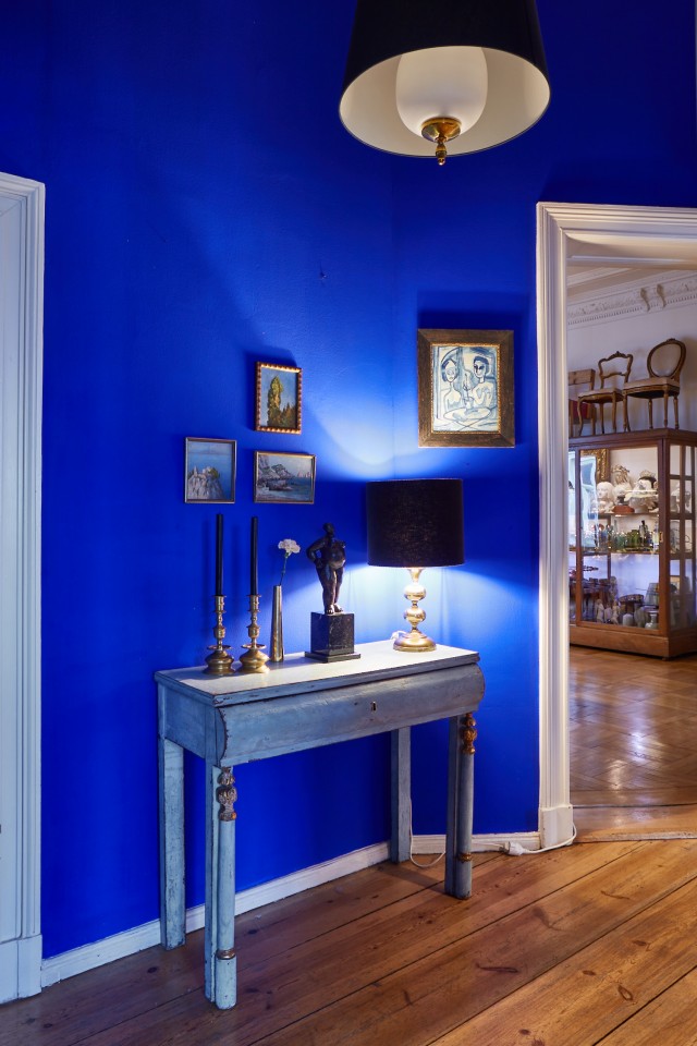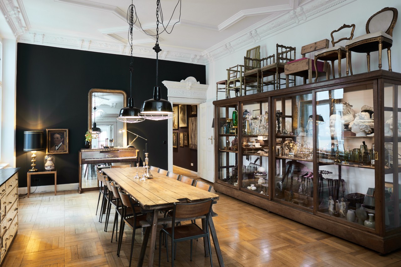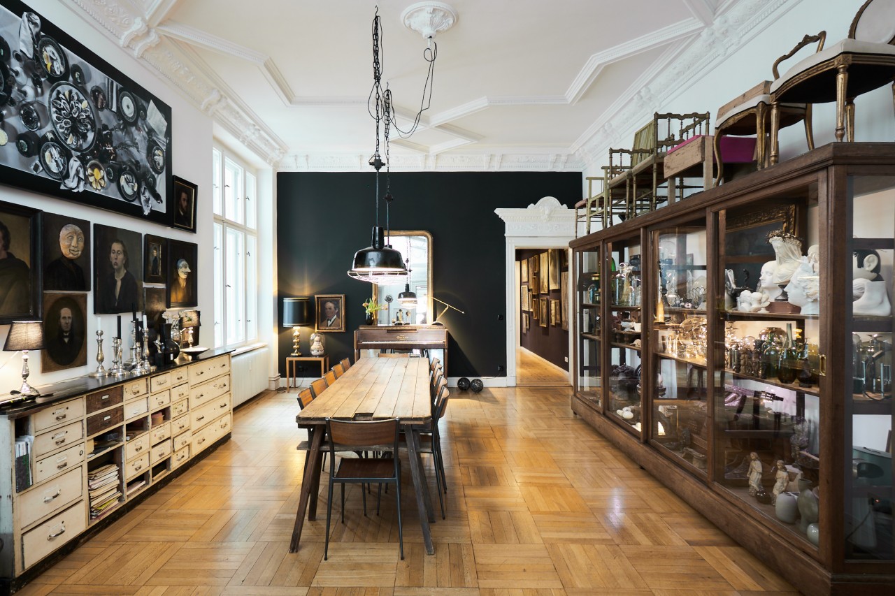 The ambience breathes history: things gathered from many corners of the world, fished out of the stream of time with an inspired eye and a sure hand. African sculptures; secretive portraits of unknown women and men; picture islands of island pictures, cloud pictures, water pictures; fragile folding chairs from a Roman palazzo; seating furniture by Vitra, cool and comfortable; a heavy baroque chest; shimmering giant trays and dining tables that were once market stalls. Four oak display case metres from a Hanseatic trading office as working storage and fundus; another: the audacious book installation. For the sake of sound, a Steinway grand piano from New York, a piano by Gaveau from Paris, underscoring subversive gatherings of pale blue and ultramarine. A variety of found objects and modernity is brought into a unique creative dramaturgy with intervals of spaciousness and emptiness. Well-calculated correspondences emerge at the temporal, stylistic and functional breaking points: things are made to speak and harmonise in unexpected ways. A cosmos of surprises awaits the visitor, right down to the smallest details. You can explore it more or less deeply - or simply enjoy it.