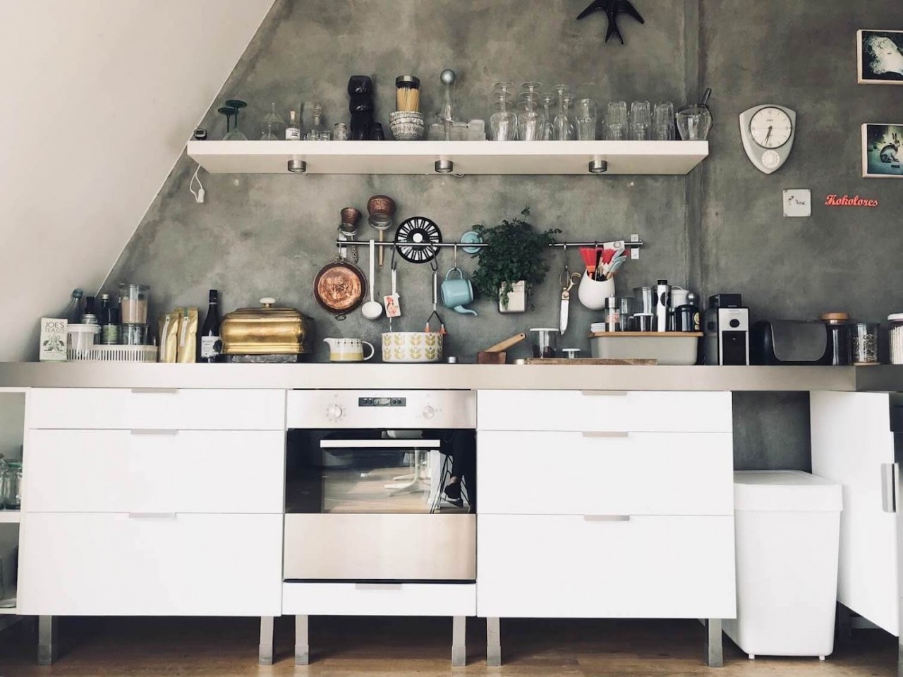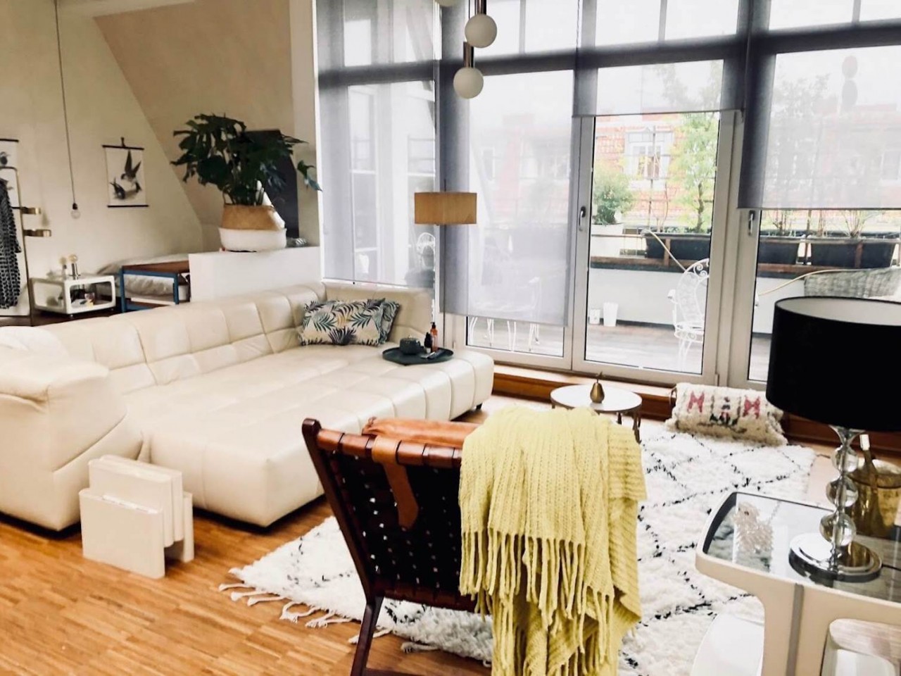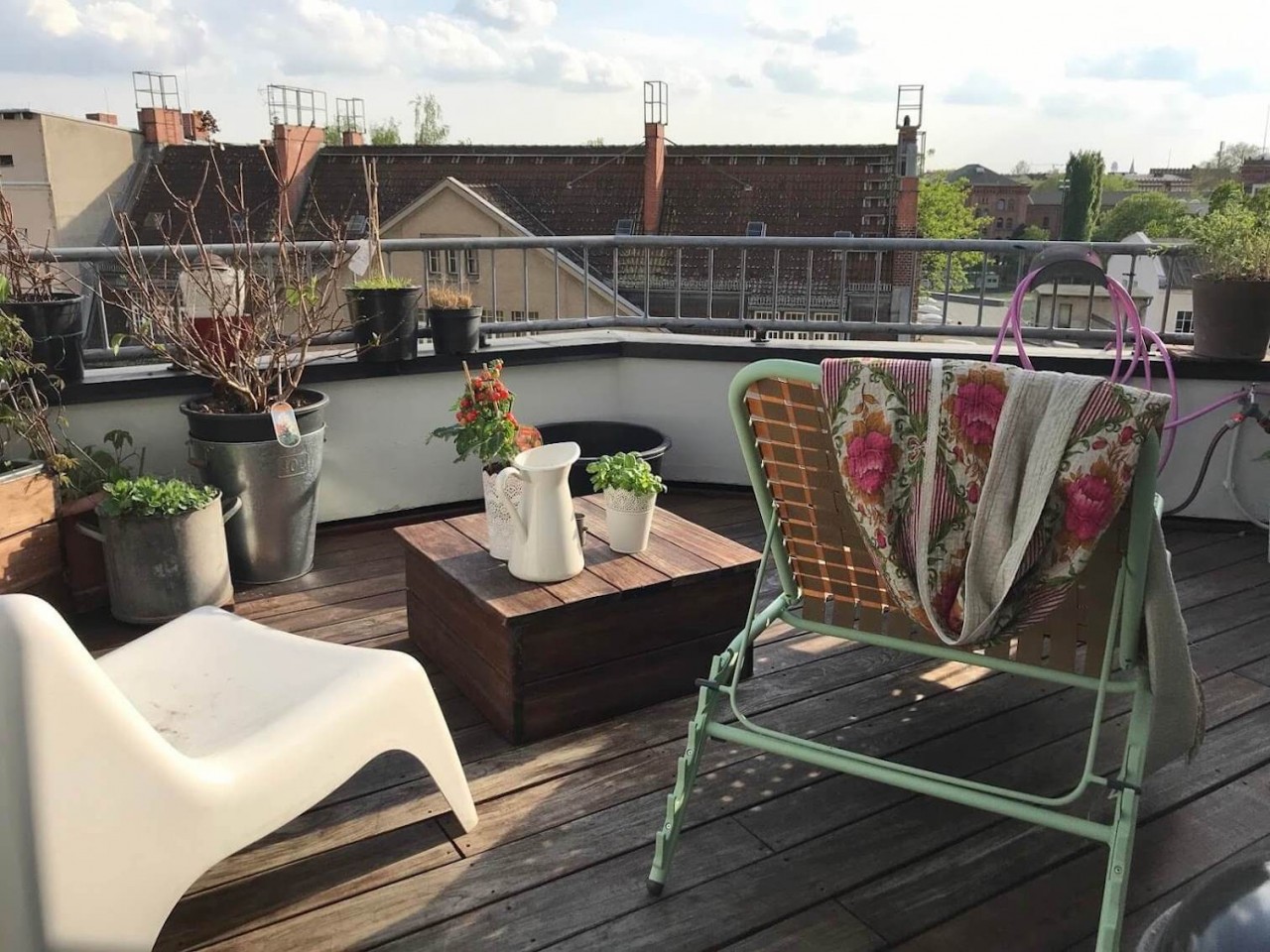 The private quarters are nothing short of luxurious, with an elegantly appointed bedroom that promises rest and relaxation amidst a wooden cabinet, stylish coat rack, and a floral lamp that adds a touch of elegance. The modern bathroom is equally impressive, featuring a glass-enclosed shower, a tranquil bathtub draped with a blue towel, and beige tiled walls that echo the serene and polished feel of the residence. The kitchen does not shy away from modern demands, equipped with white cabinets, sleek gray textured walls, and state-of-the-art appliances, making it perfect for culinary exploits. Completing this remarkable residence is a serene rooftop terrace that offers a breathtaking urban escape, lined with lush greenery and rustic furnishings.