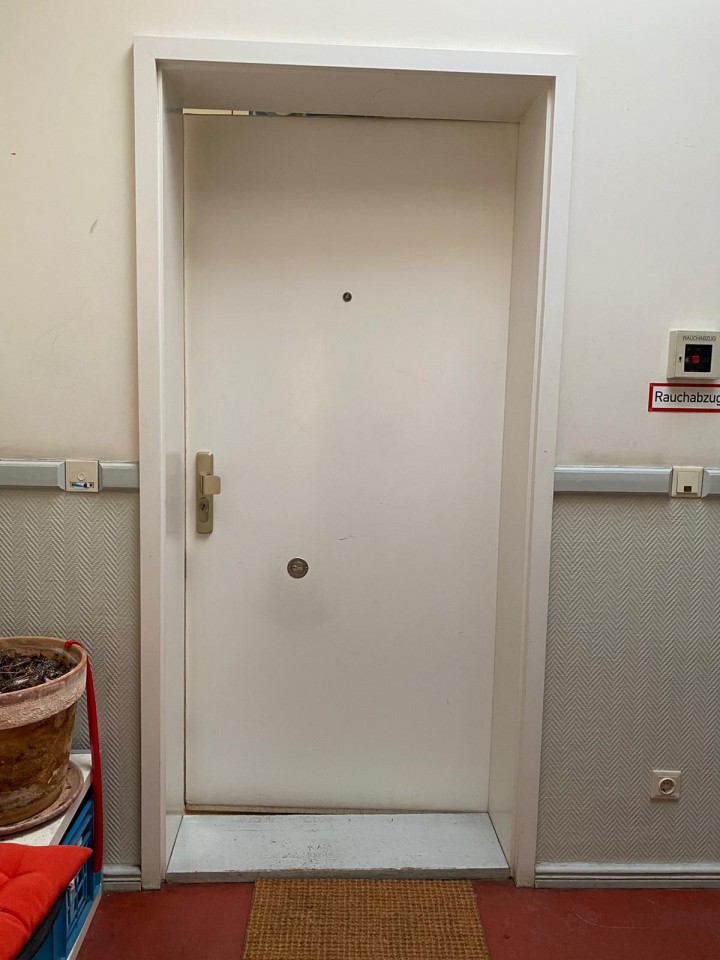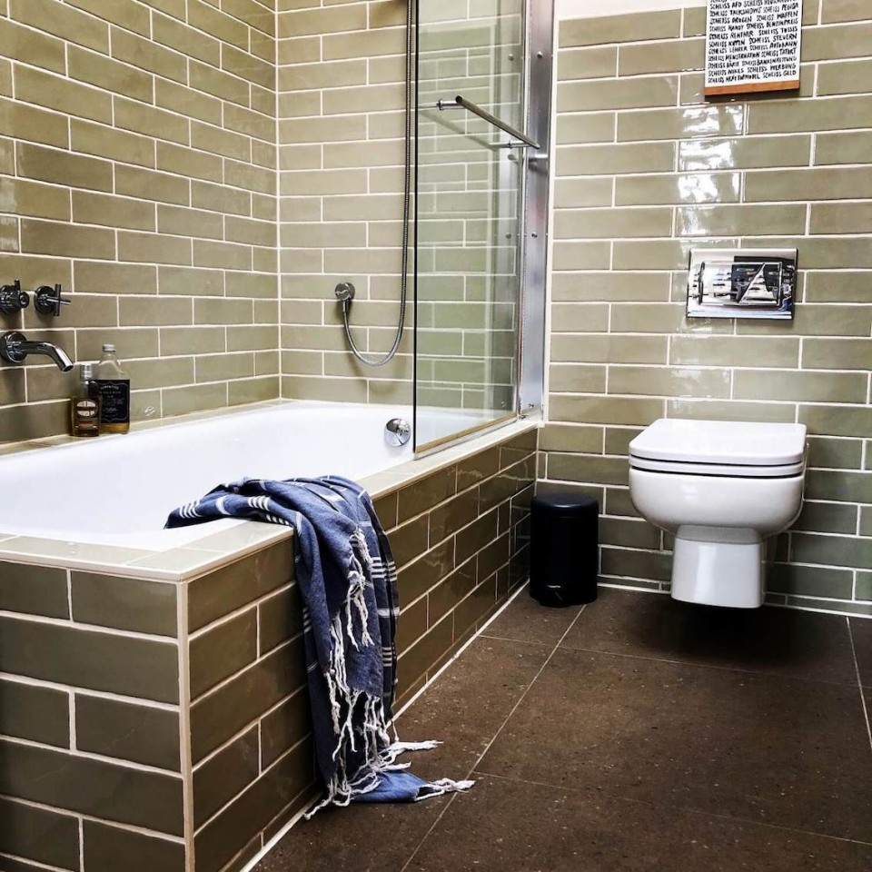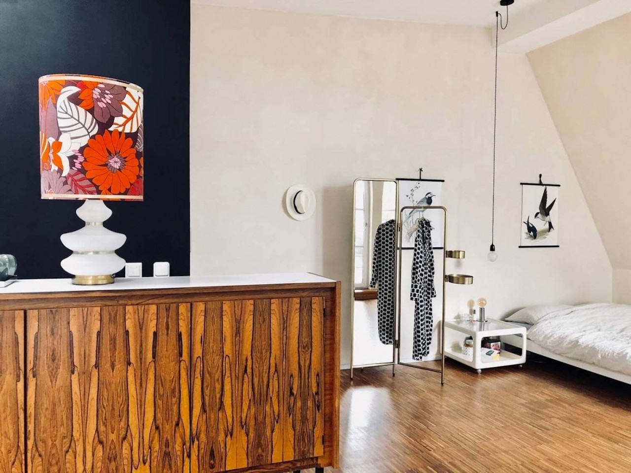 The private quarters are nothing short of luxurious, with an elegantly appointed bedroom that promises rest and relaxation amidst a wooden cabinet, stylish coat rack, and a floral lamp that adds a touch of elegance. The modern bathroom is equally impressive, featuring a glass-enclosed shower, a tranquil bathtub draped with a blue towel, and beige tiled walls that echo the serene and polished feel of the residence. The kitchen does not shy away from modern demands, equipped with white cabinets, sleek gray textured walls, and state-of-the-art appliances, making it perfect for culinary exploits. Completing this remarkable residence is a serene rooftop terrace that offers a breathtaking urban escape, lined with lush greenery and rustic furnishings.