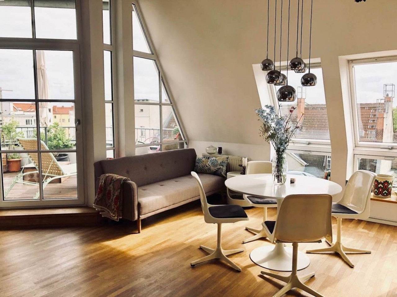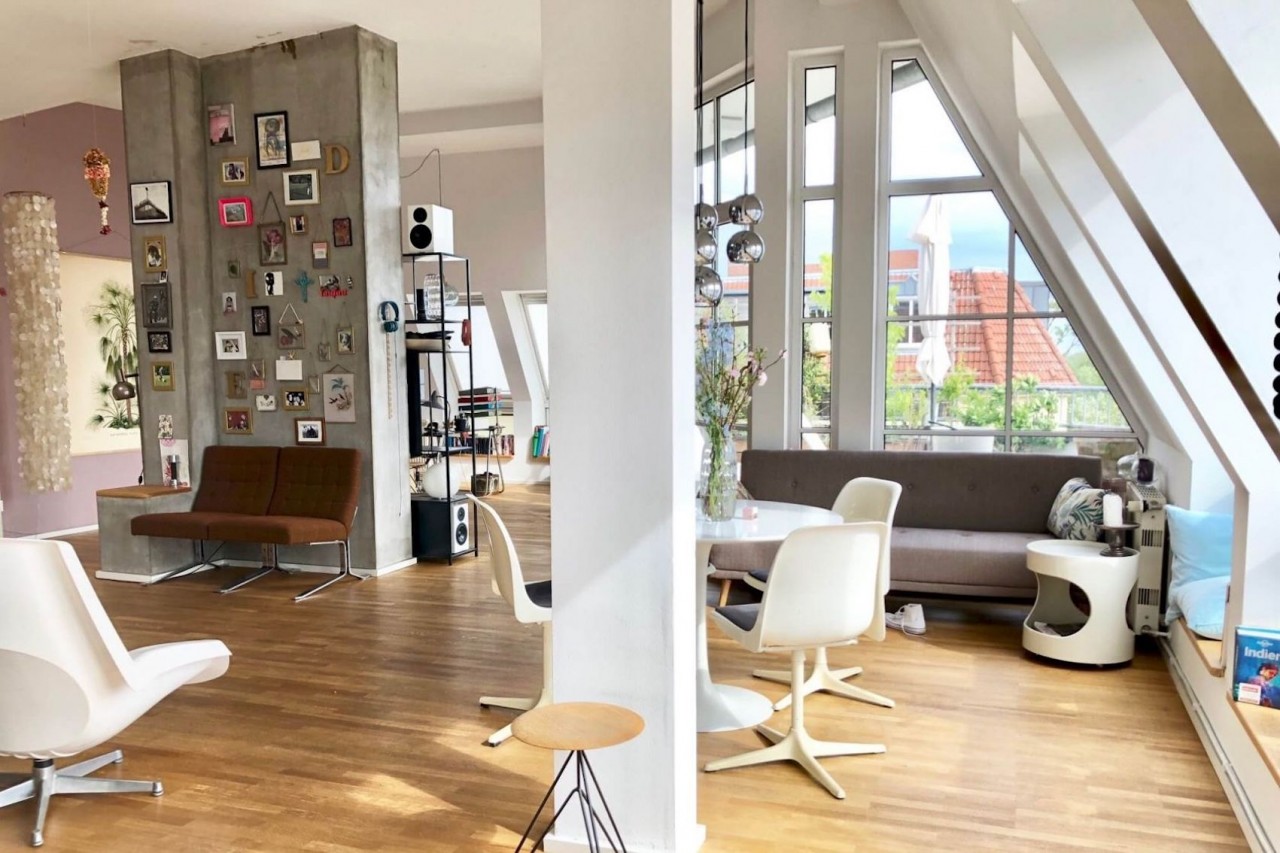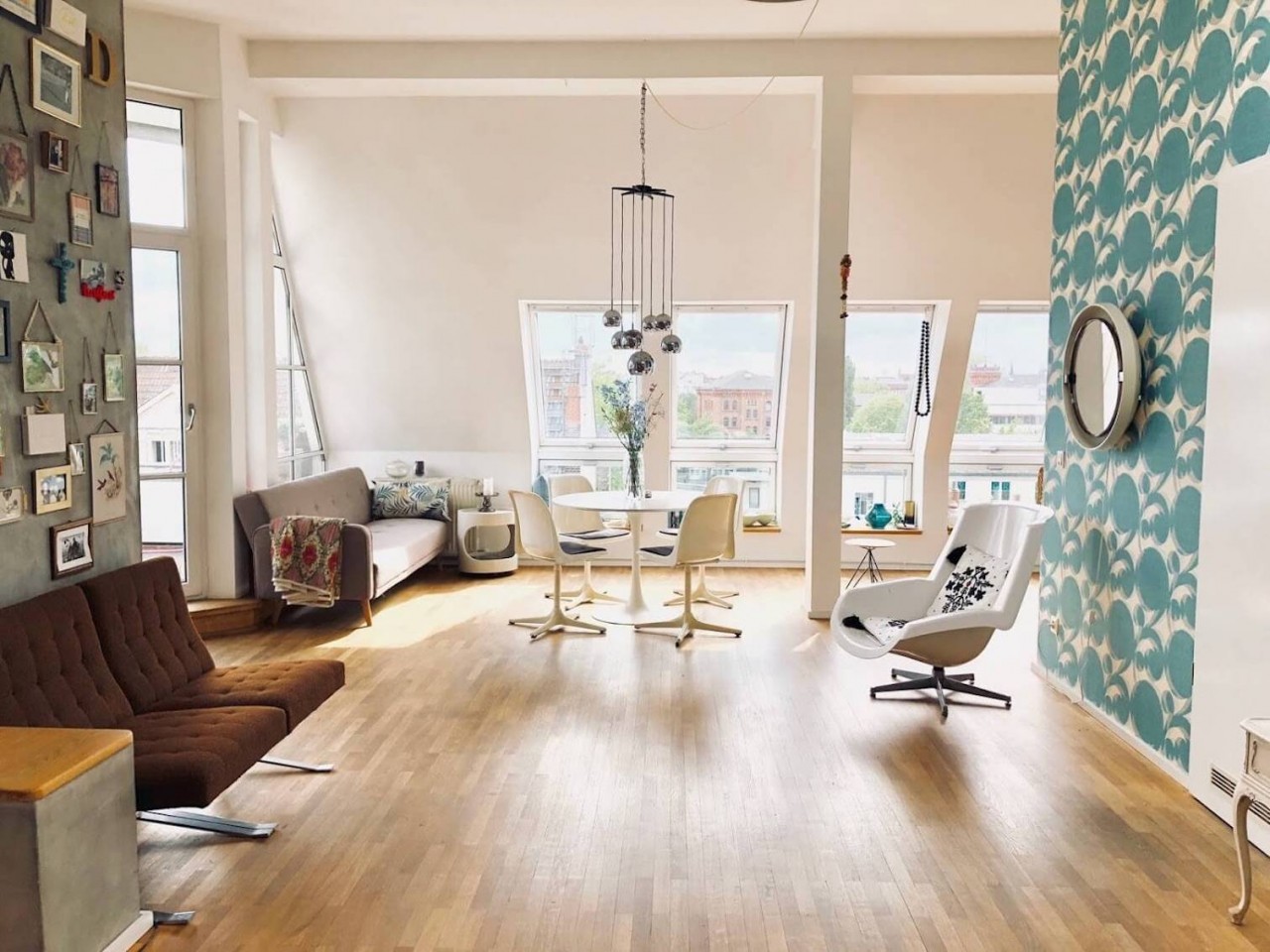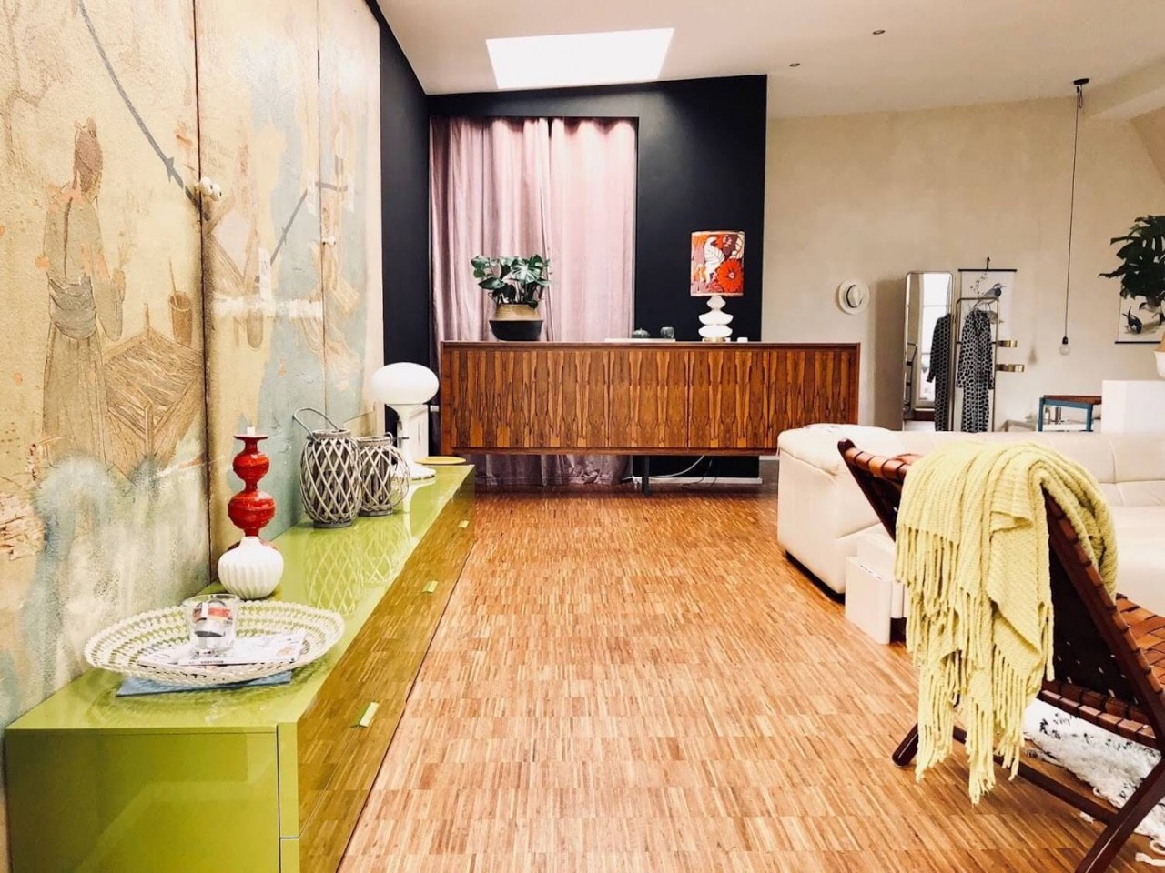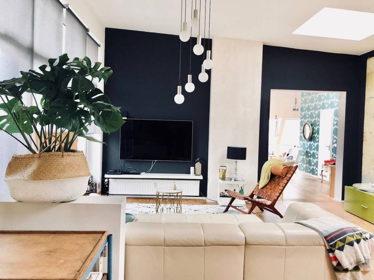 Experience the epitome of urban chic in this modern loft, boasting an assortment of eclectic decor and vast windows that bathe the interiors in natural light. Designed with a keen eye for aesthetics, each living space effortlessly blends comfort with style. The living areas feature navy blue and beige walls, adorned with stylish furniture, decorative vases, and avant-garde hanging lights, creating an atmosphere that is both inviting and sophisticated. The wooden accents, from the reception area to the bookshelves, introduce a warm, earthy balance to the modern palette of grays and whites, ensuring every corner feels like home.
