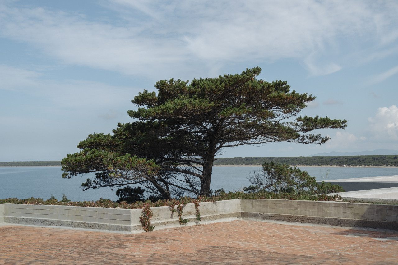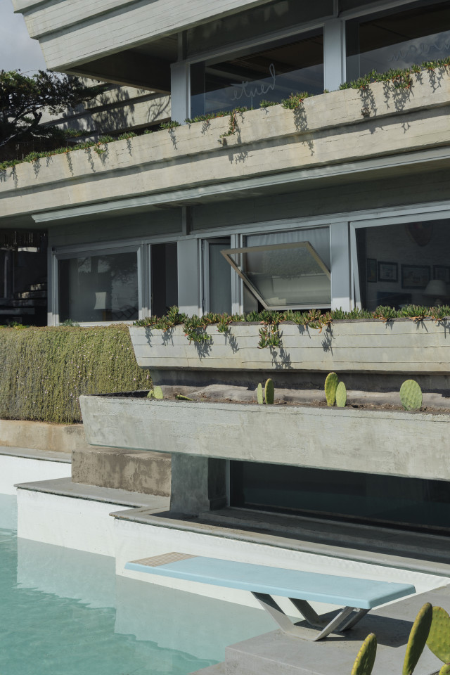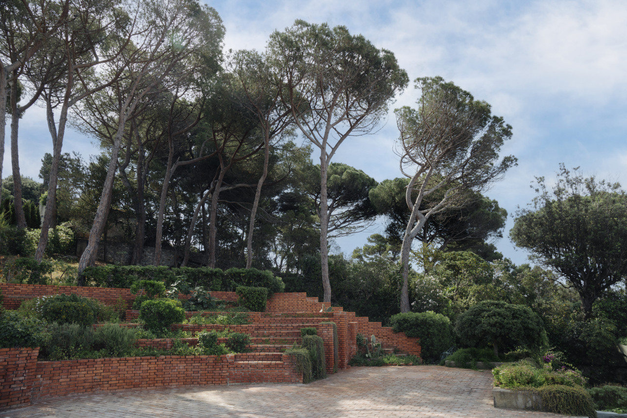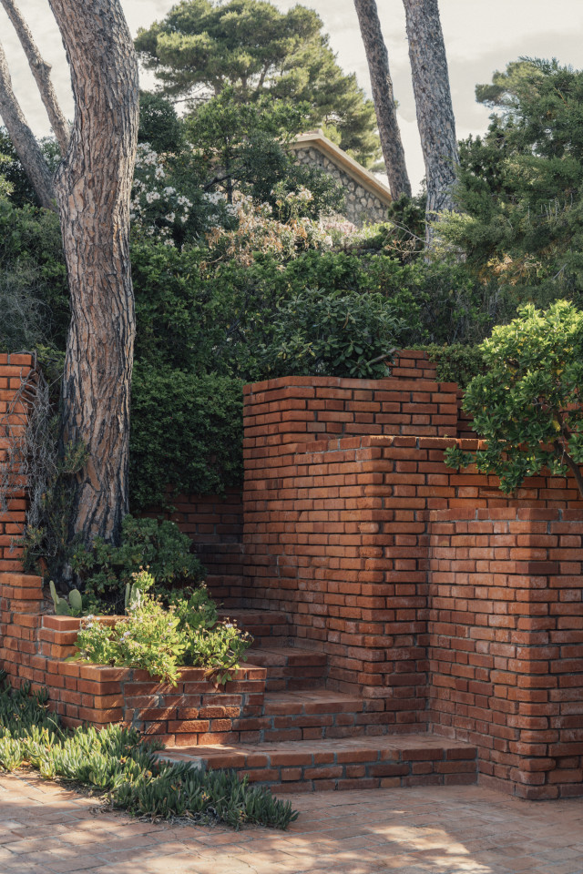 The exterior architecture continues this story—aged plaster façades reveal traces of time and weather, while the surrounding gardens and terraces form a seamless extension of the building’s spatial language. This is a location of sculptural forms and timeless materials, where architecture itself becomes a visual subject.