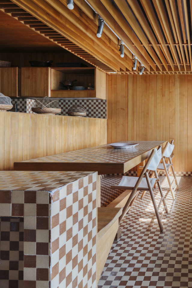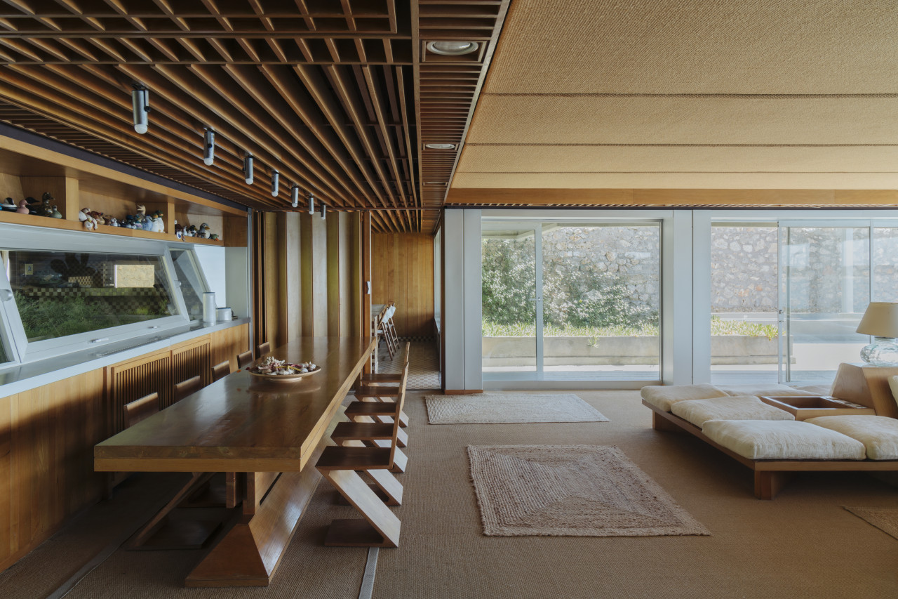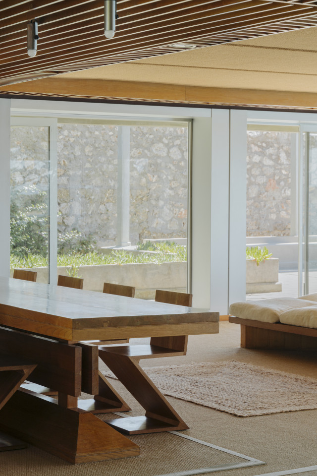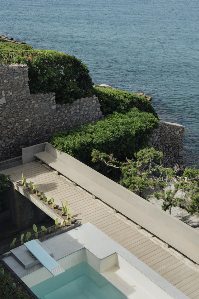 The villa’s architecture stands out through its elemental honesty—thick masonry walls, wooden ceiling beams, and handmade terracotta flooring speak to a legacy of vernacular building techniques. Light enters through small, carefully placed windows, creating chiaroscuro effects that lend drama and intimacy to each room.