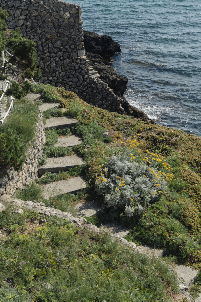 Interiors are composed like still lifes, with built-in stone benches, vaulted ceilings, and staircases carved directly into the structure. The space unfolds in quiet sequences, offering a narrative flow from one atmospheric room to another. Arched niches and shallow thresholds frame natural views, while open fireplaces and rustic detailing ground the home in historical continuity.