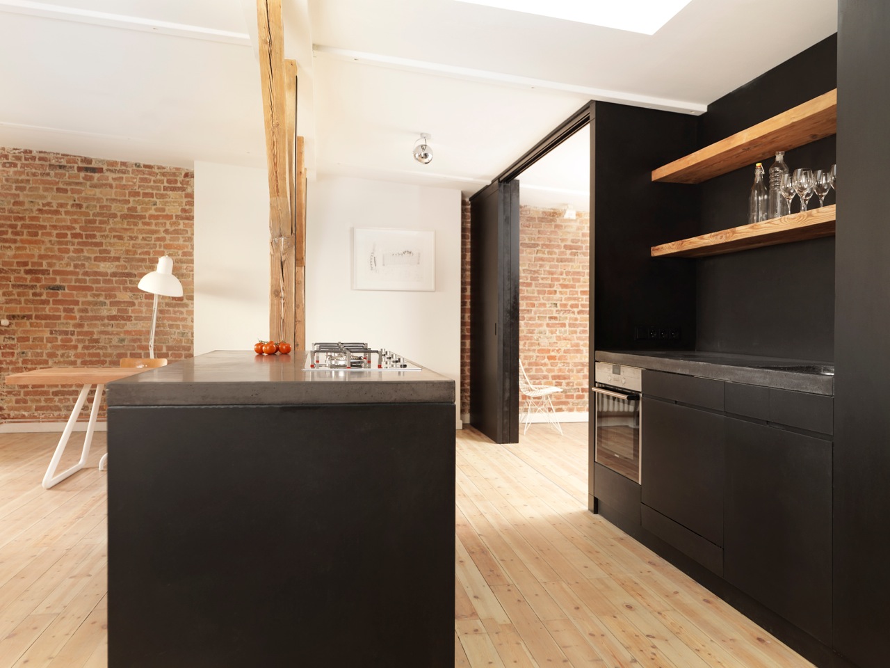 I have renovated the loft with the help of an architect I know since early school days. We wanted to create an open, minimalistic space with a modern design that gives you a warm and cozy feeling at the same time. Thats why me mixed materials like the handmade concrete countertop in the kitchen and the wooden shelfs, made out of over 100 year old wooden beams, which we preserved from the old roof construction. We alThis stylishly designed modern apartment offers a spacious and inviting atmosphere. Located on the sunny side of Görlitzer Park, the loft enjoys abundant natural light and, being on the top floor, provides spectacular panoramic views of the city.The loft has been thoughtfully renovated in collaboration with an architect I have known since my early school days. Our goal was to create an open, minimalist space that balances modern aesthetics with warmth and comfort. To achieve this, we combined contrasting materials—such as a handmade concrete countertop in the kitchen and wooden shelves crafted from over 100-year-old beams salvaged from the original roof structure. The dining table was also custom-made from the same reclaimed wood, adding a touch of history to the contemporary setting.