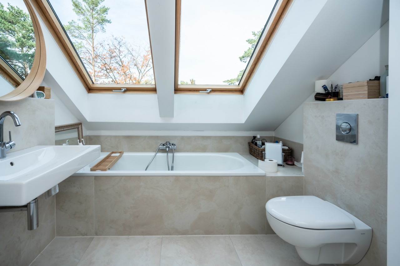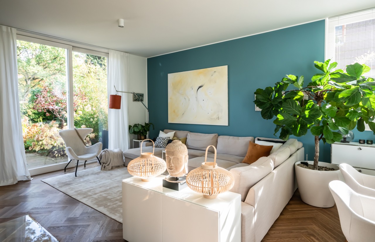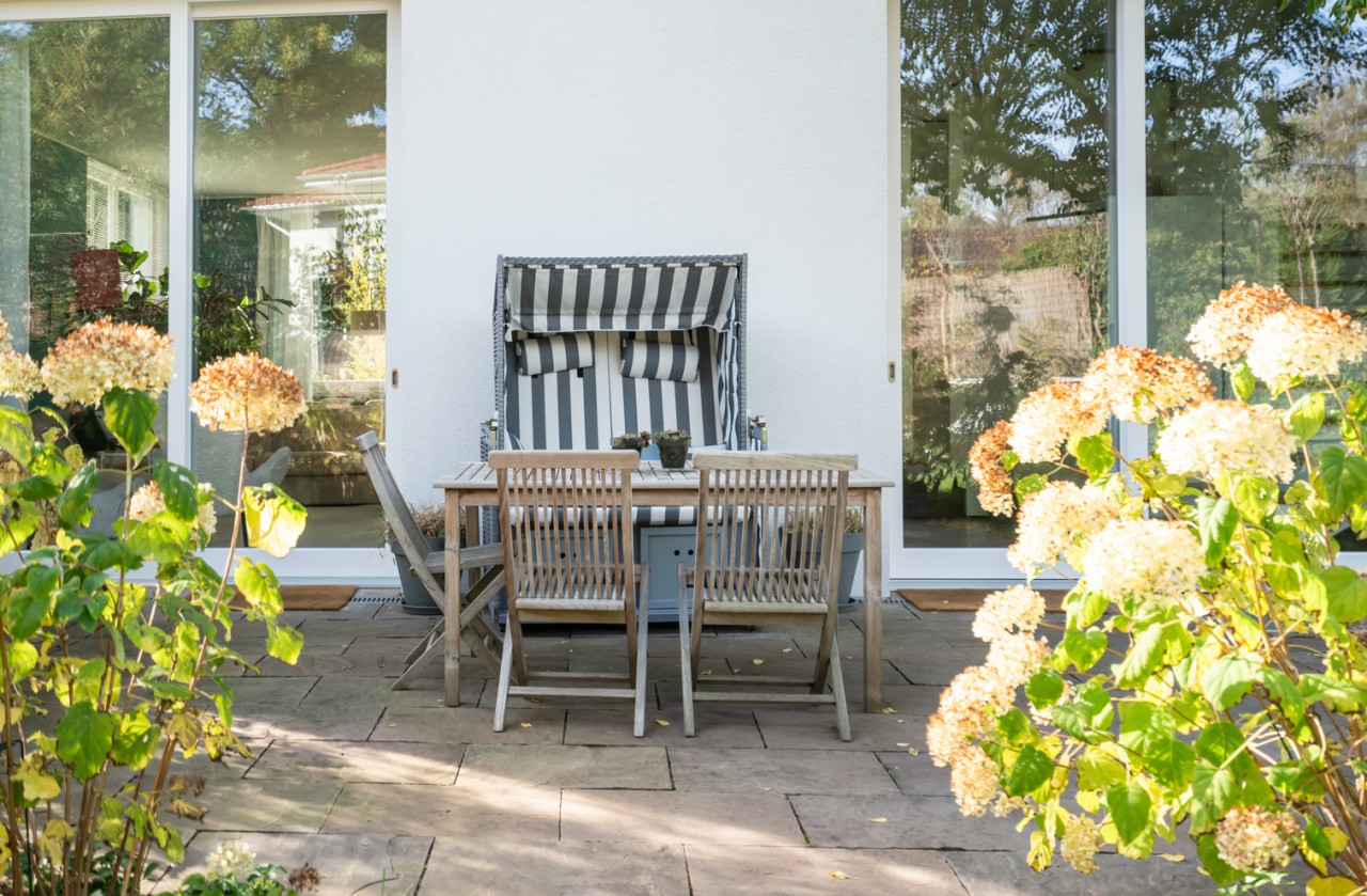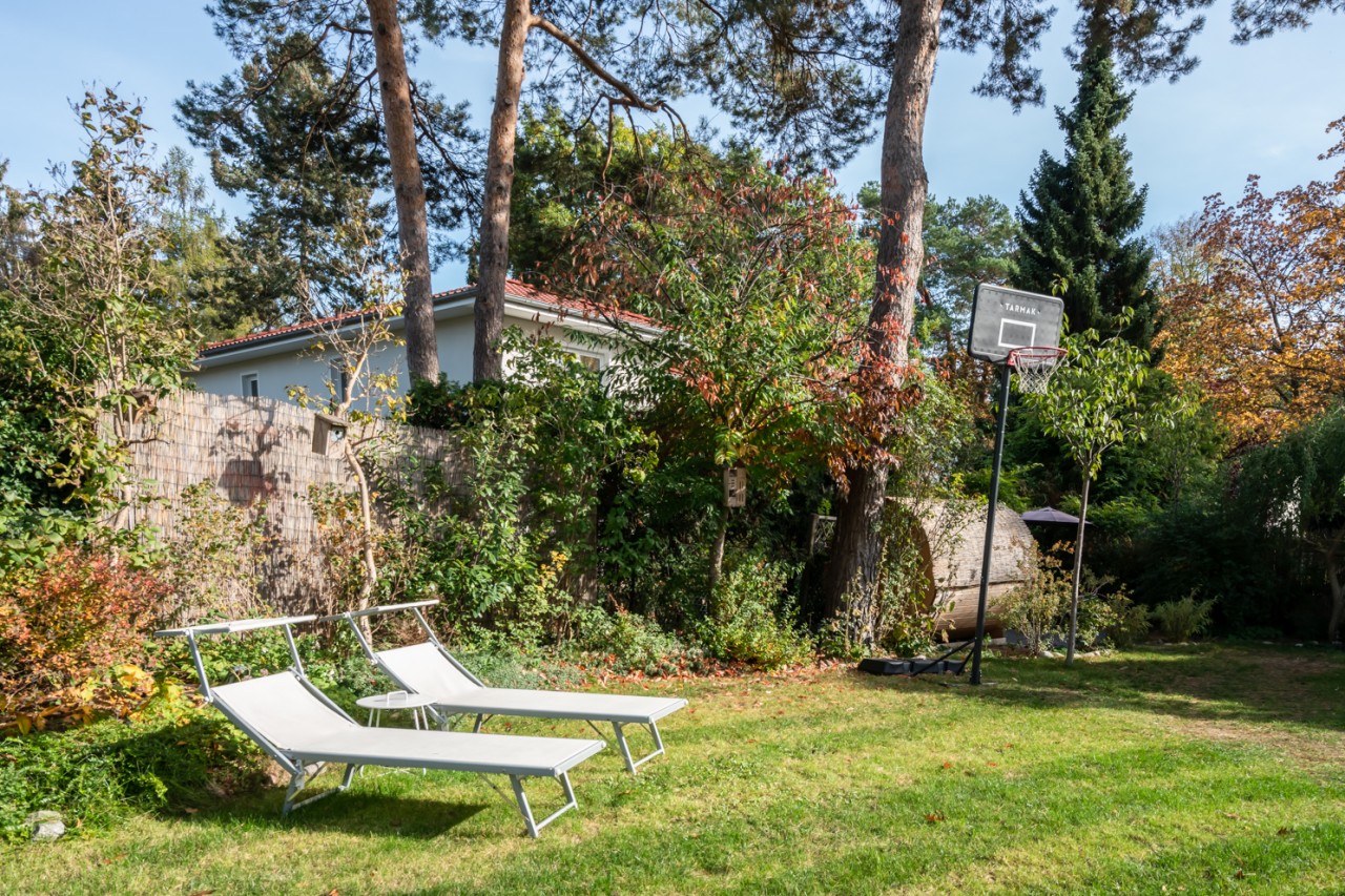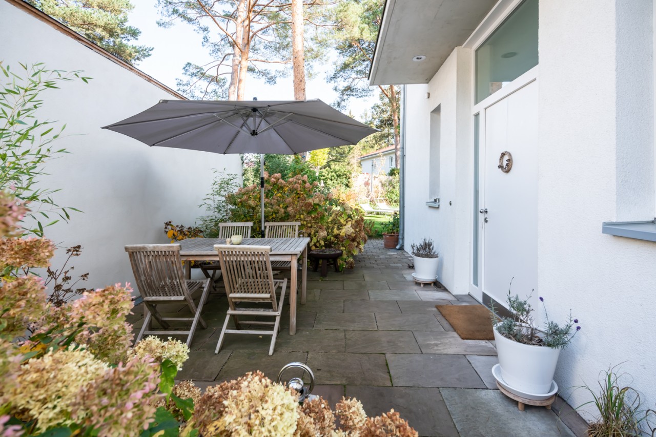The large garden with 550m2 offers diverse motifs with two separate terraces, corners and little walls for varied and different garden scenes.