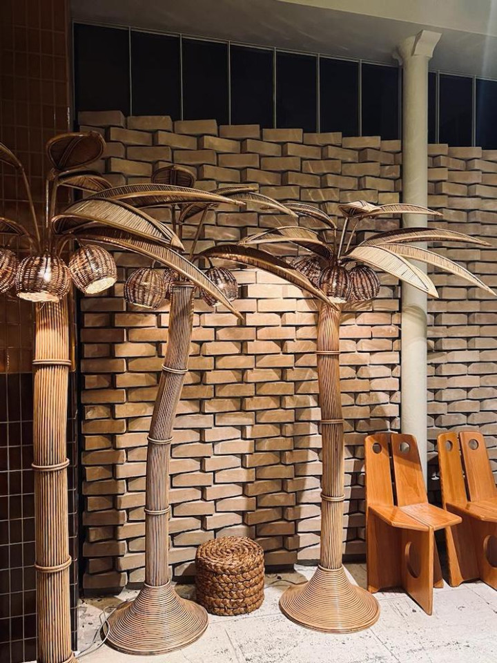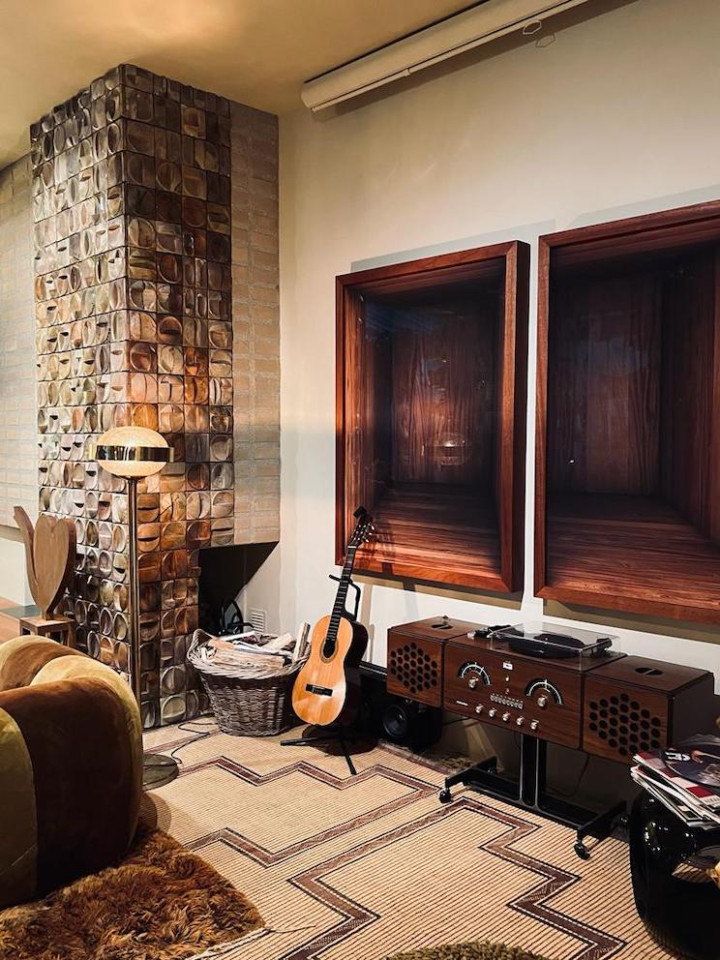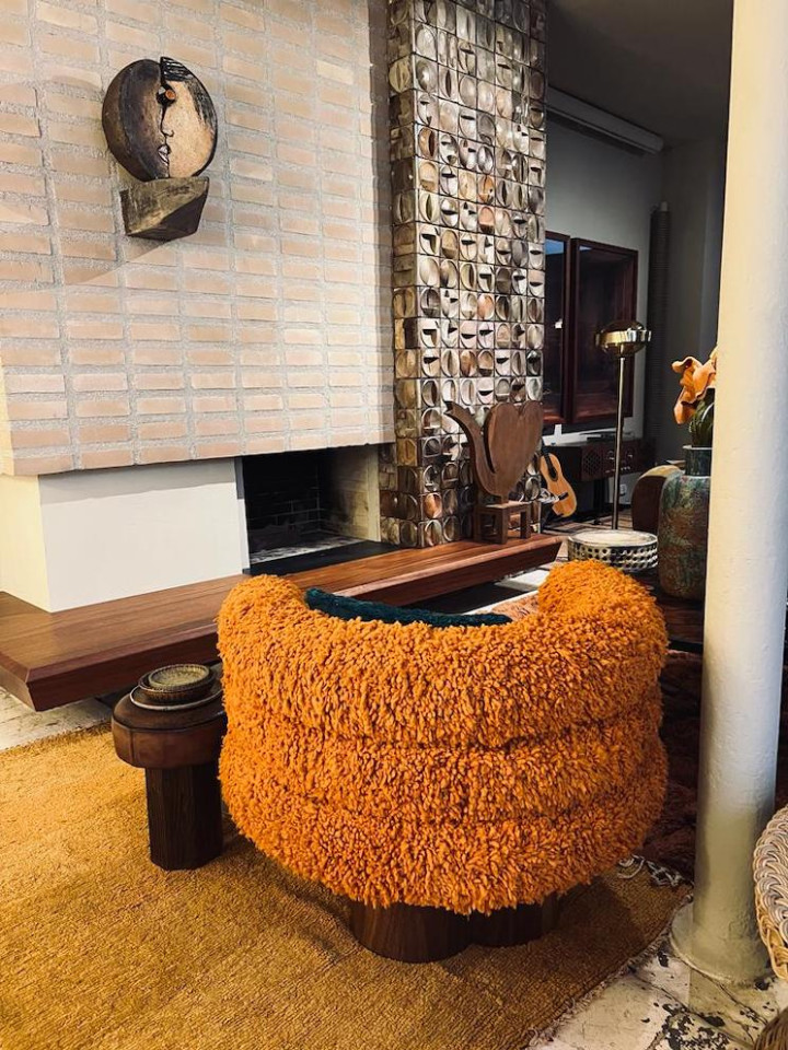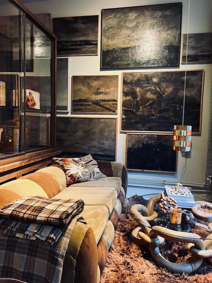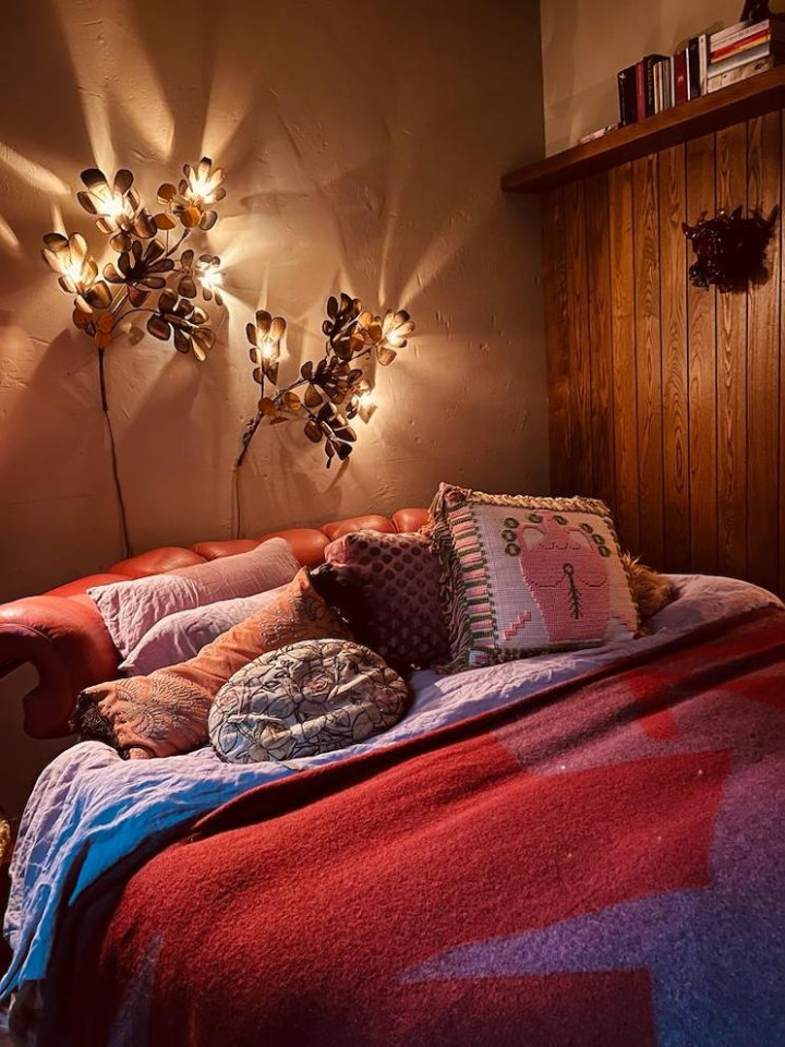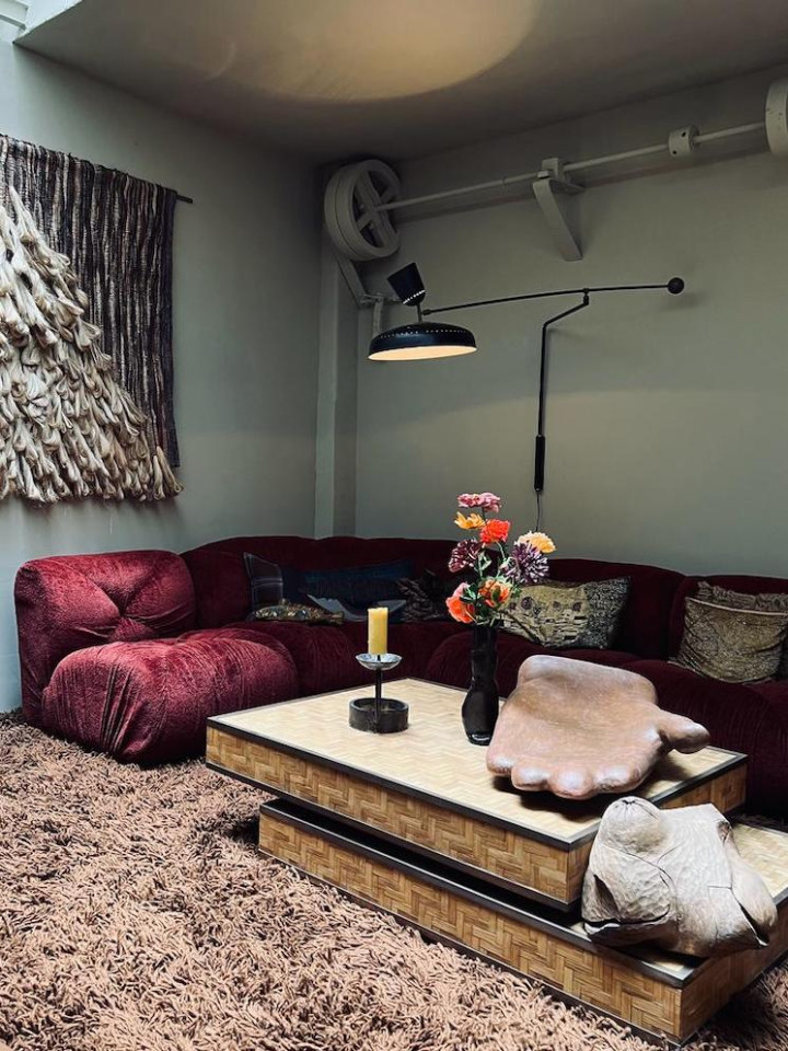 Step into this exquisitely artistic residence where every corner speaks to an eclectic taste and a flair for sophisticated interior decor. The living areas feature plush, golden and red velvet sofas set against a backdrop of unique and decorative wall elements such as intricate tapestries and modern art pieces. Wooden pallet tables, vintage furnishings, and lush houseplants infuse a cozy, yet stylish vibe. Ambient lighting from orange lamps and palm tree lamps complements the rich, velvet textures and the wooden accents to create inviting spaces perfect for relaxation or entertaining guests.
