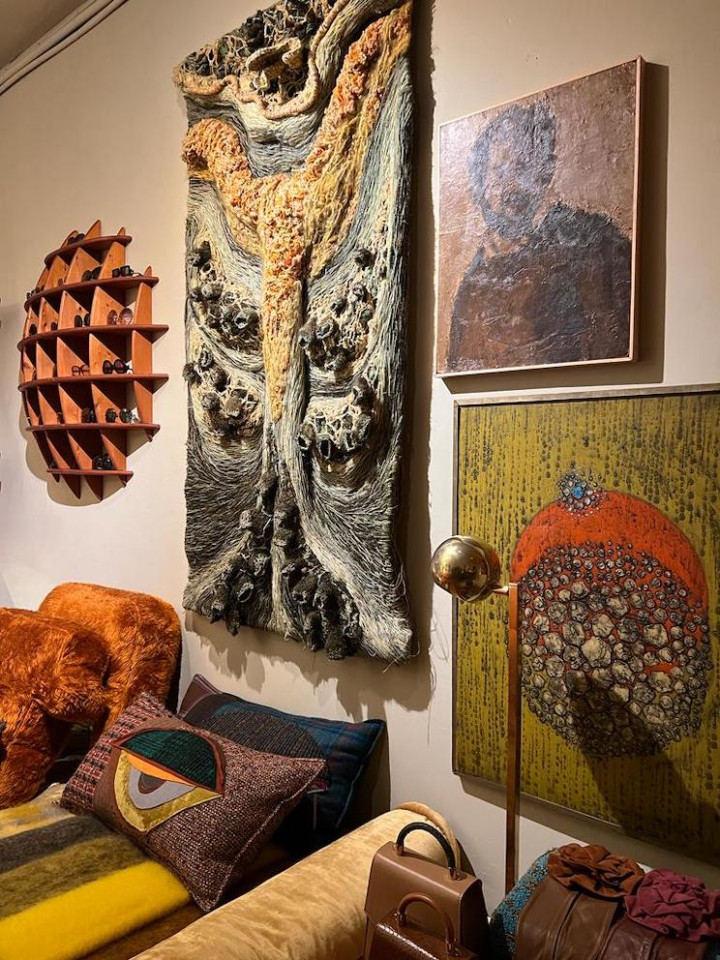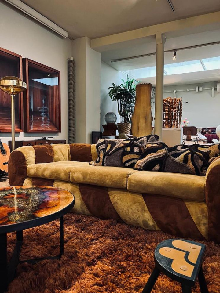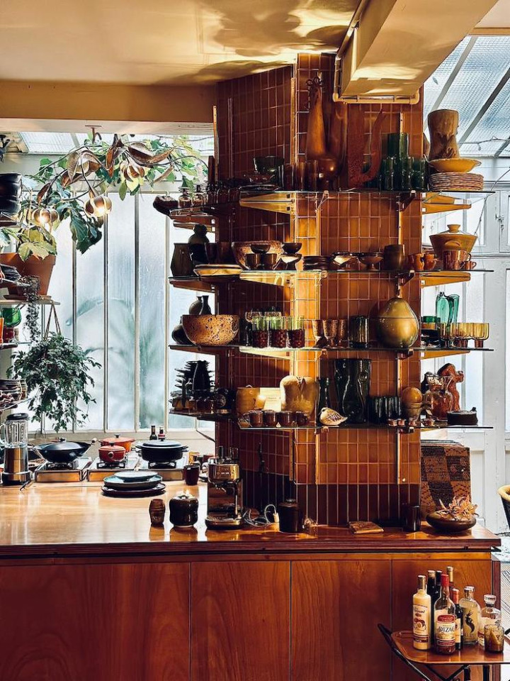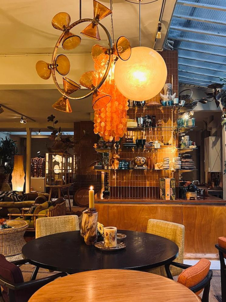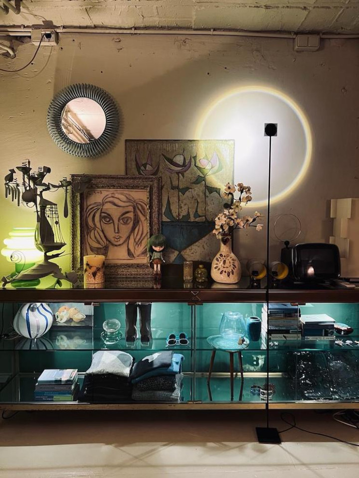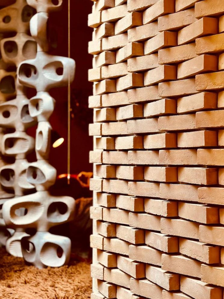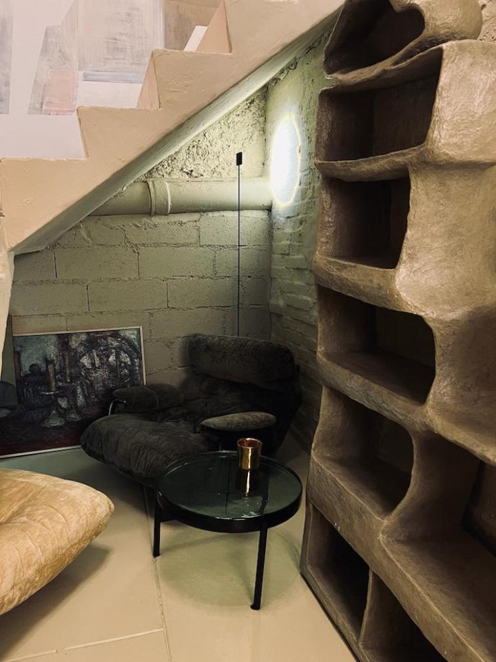 Step into this exquisitely artistic residence where every corner speaks to an eclectic taste and a flair for sophisticated interior decor. The living areas feature plush, golden and red velvet sofas set against a backdrop of unique and decorative wall elements such as intricate tapestries and modern art pieces. Wooden pallet tables, vintage furnishings, and lush houseplants infuse a cozy, yet stylish vibe. Ambient lighting from orange lamps and palm tree lamps complements the rich, velvet textures and the wooden accents to create inviting spaces perfect for relaxation or entertaining guests.