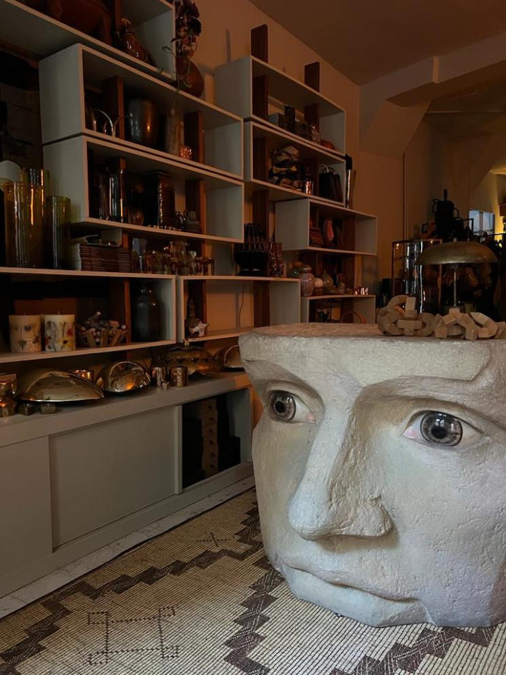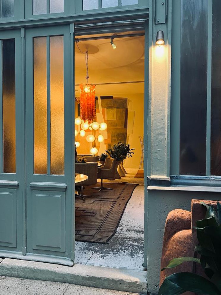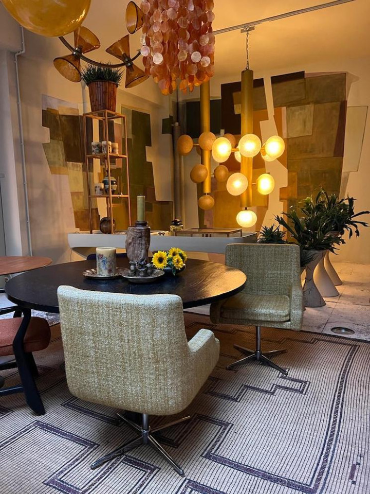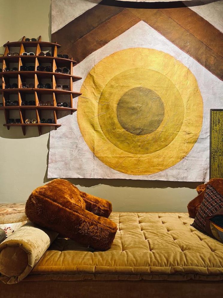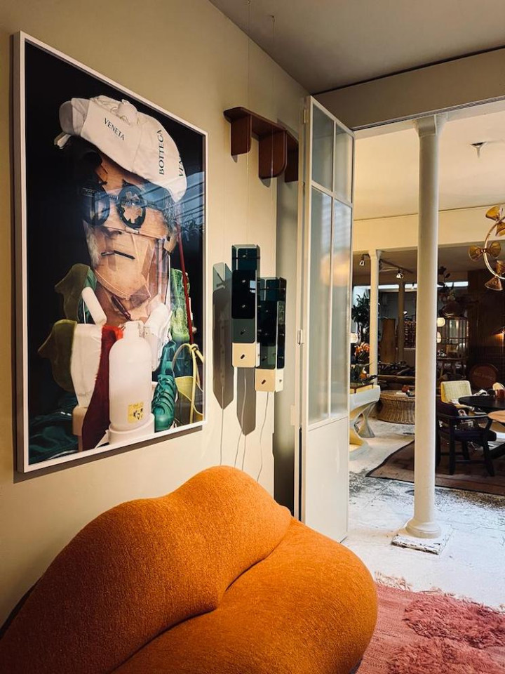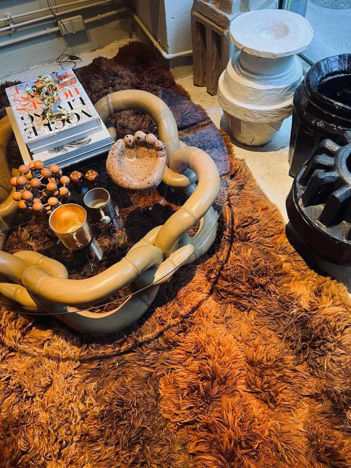 Step into this exquisitely artistic residence where every corner speaks to an eclectic taste and a flair for sophisticated interior decor. The living areas feature plush, golden and red velvet sofas set against a backdrop of unique and decorative wall elements such as intricate tapestries and modern art pieces. Wooden pallet tables, vintage furnishings, and lush houseplants infuse a cozy, yet stylish vibe. Ambient lighting from orange lamps and palm tree lamps complements the rich, velvet textures and the wooden accents to create inviting spaces perfect for relaxation or entertaining guests.