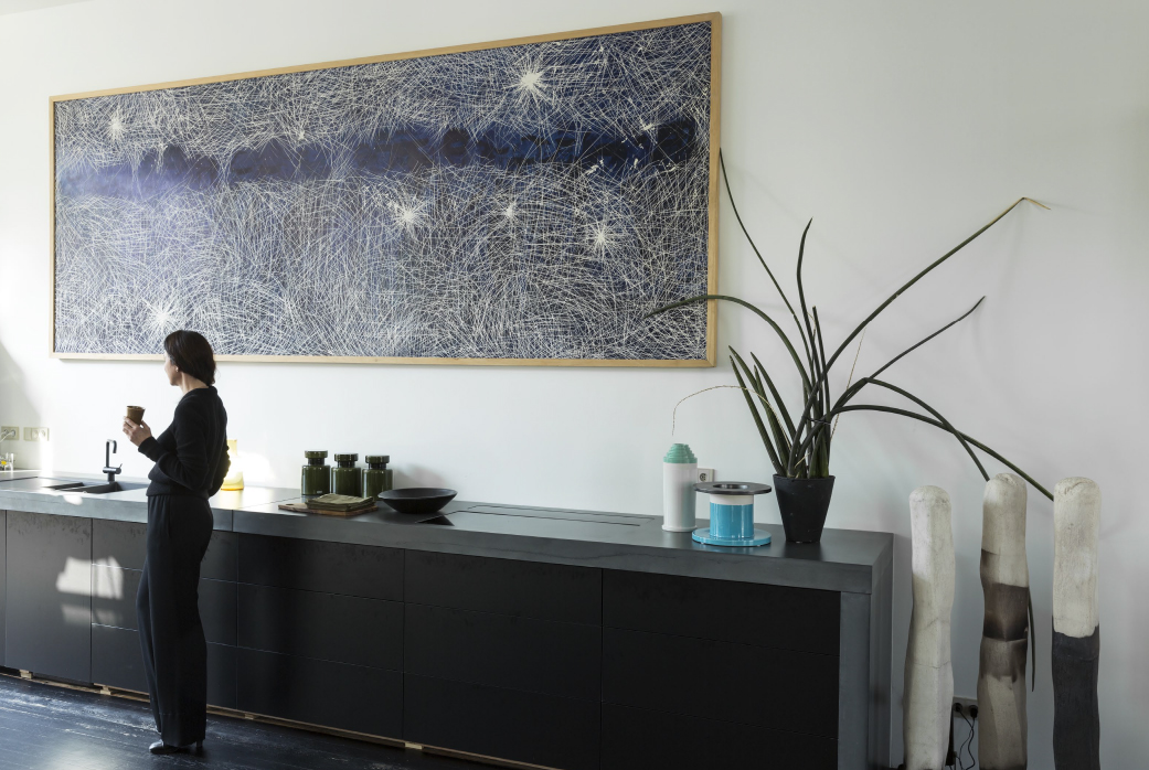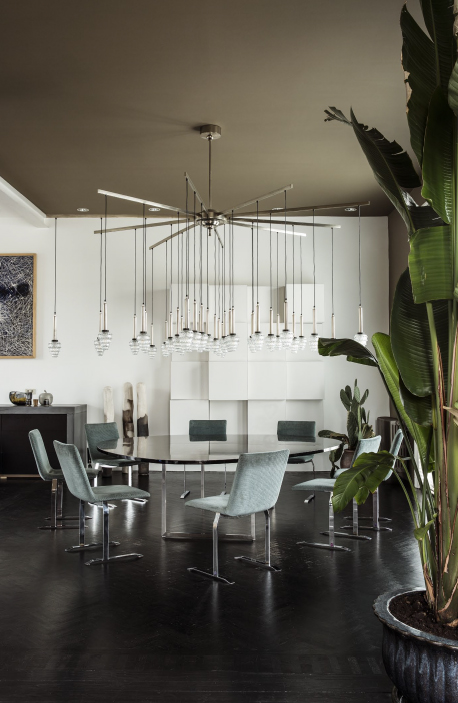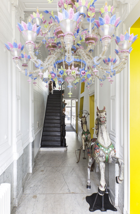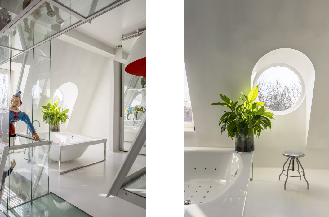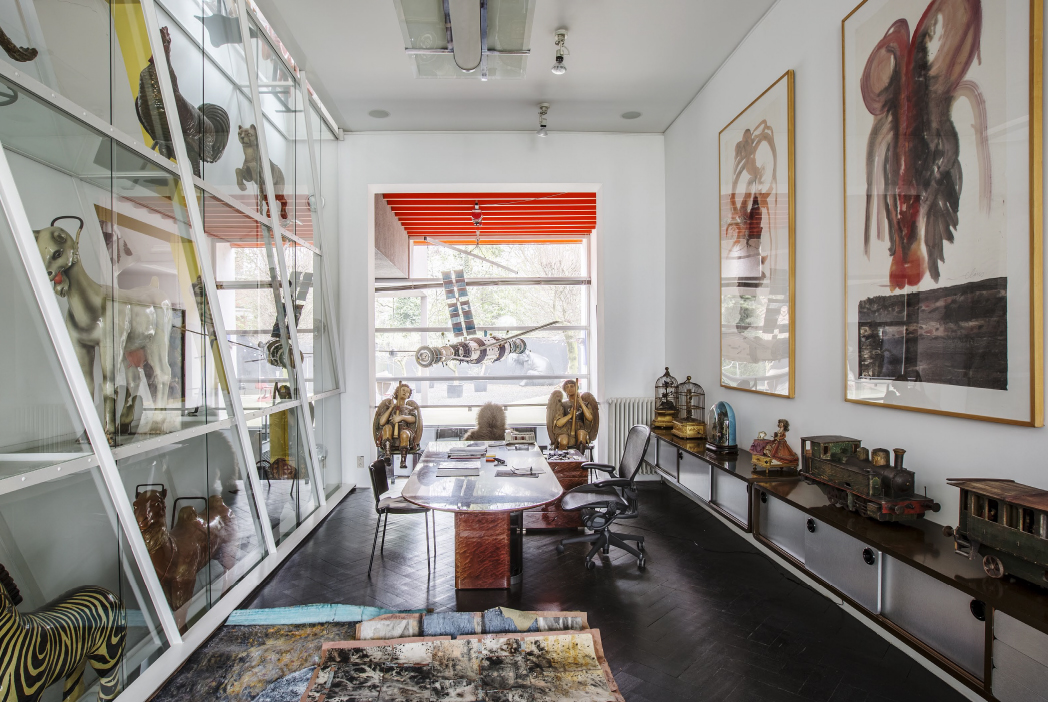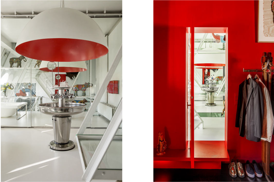 This home also offers a serene retreat with its modern bathroom interiors that spotlight bright light, minimalistic design, and thoughtful placements of plants and unique decorations, fostering a sense of serenity and cleanliness. An opulent interior hallway dazzles with a floral glass chandelier and whimsical carousel horses, adding a touch of fantasy and nostalgia. For the creative and introspective, an art-filled office space provides a reprieve with eclectic sculptures and expressive paintings surrounding an efficient work area. The seamless flow towards a serene garden through modern glass doors allows bright natural light to envelop the space, creating an airy and open atmosphere that encourages relaxation and contemplation.