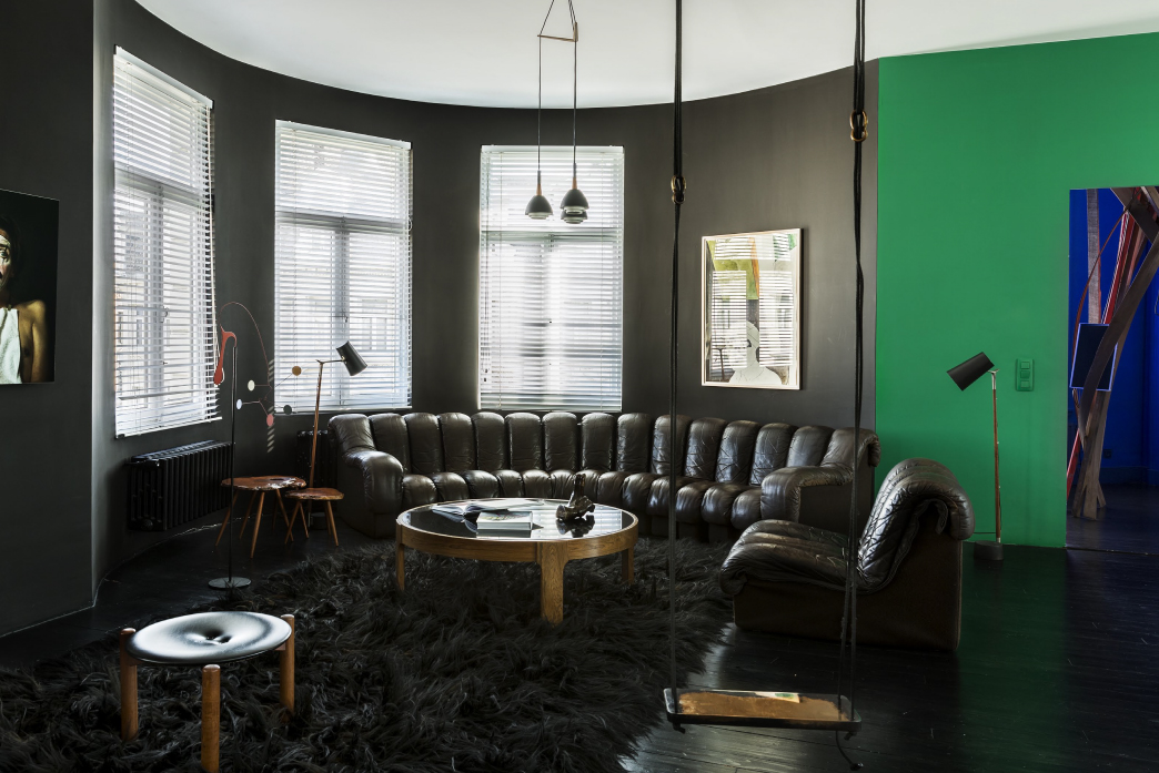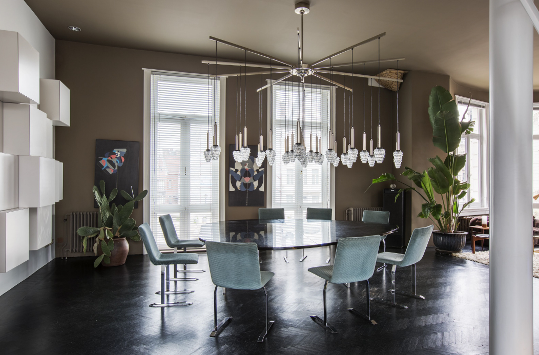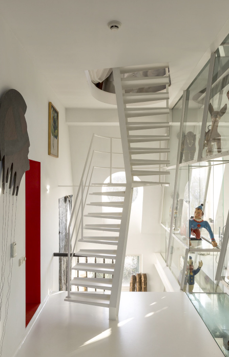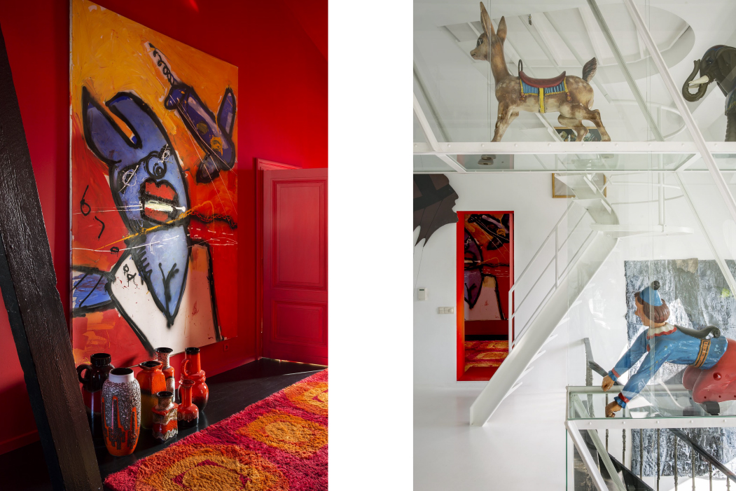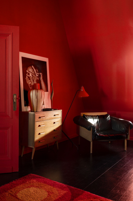 Experience a harmonious blend of historic charm and contemporary sophistication in this meticulously designed residence. As you step inside, your eyes are immediately drawn to the striking modern interiors, brilliantly highlighted by a large red pendant lamp that casts a warm, inviting glow against the vivid red entryway adorned with coats and shoes. Each space within the home serves as a canvas, displaying bold, vibrant artwork and a dynamic red and white decor that makes every corner come alive. The living areas are uniquely crafted, featuring a black leather sofa and vibrant green accent wall in the living room, and a stylish dining room set with teal chairs, a black glossy table, and sophisticated chandelier lighting to enhance your gatherings.