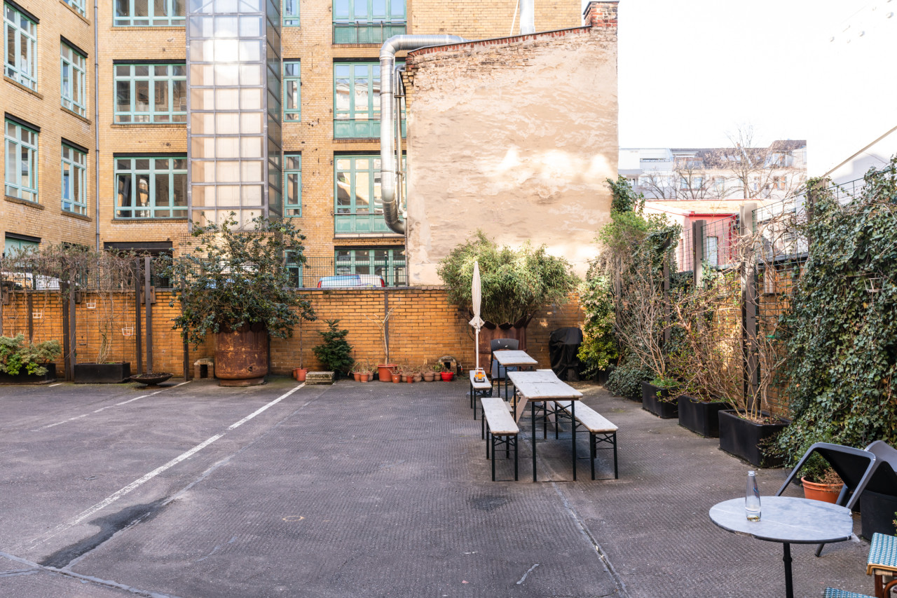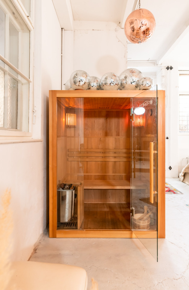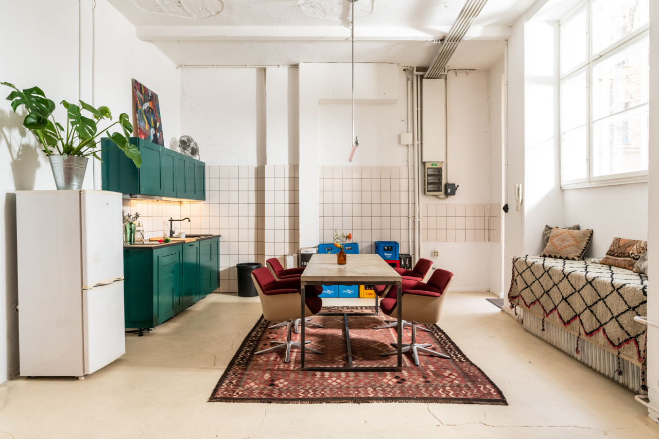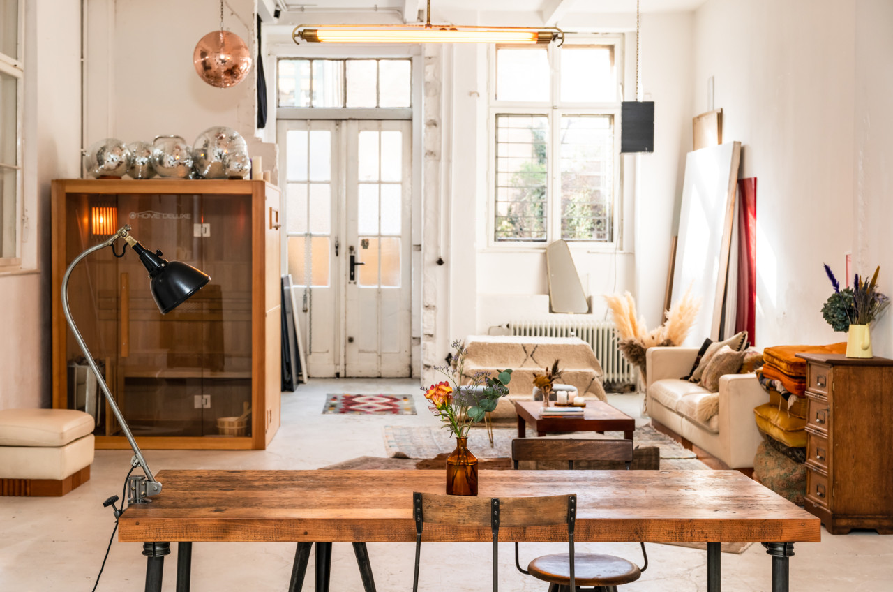 This spacious studio has 90m2, a kitchen, a bathroom, a sauna and a big backyard. Complemented with moroccan rugs, Rowac chairs, a dinner table, a beige leather sofa, Midgard lamps and 6 dark red Friso Kramer chairs, this studio is lush! To top it up, fog machines, disco balls and numerous decorative objects are available.