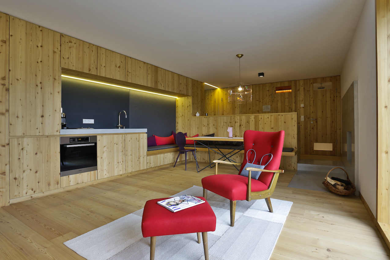 The vacation homes Aufberg 1110 and Aufberg 1113, each with two independent apartments, are a place of strength in the midst of artistic architecture. Outside as well as inside the natural materials harmonize, as nature itself exemplifies.