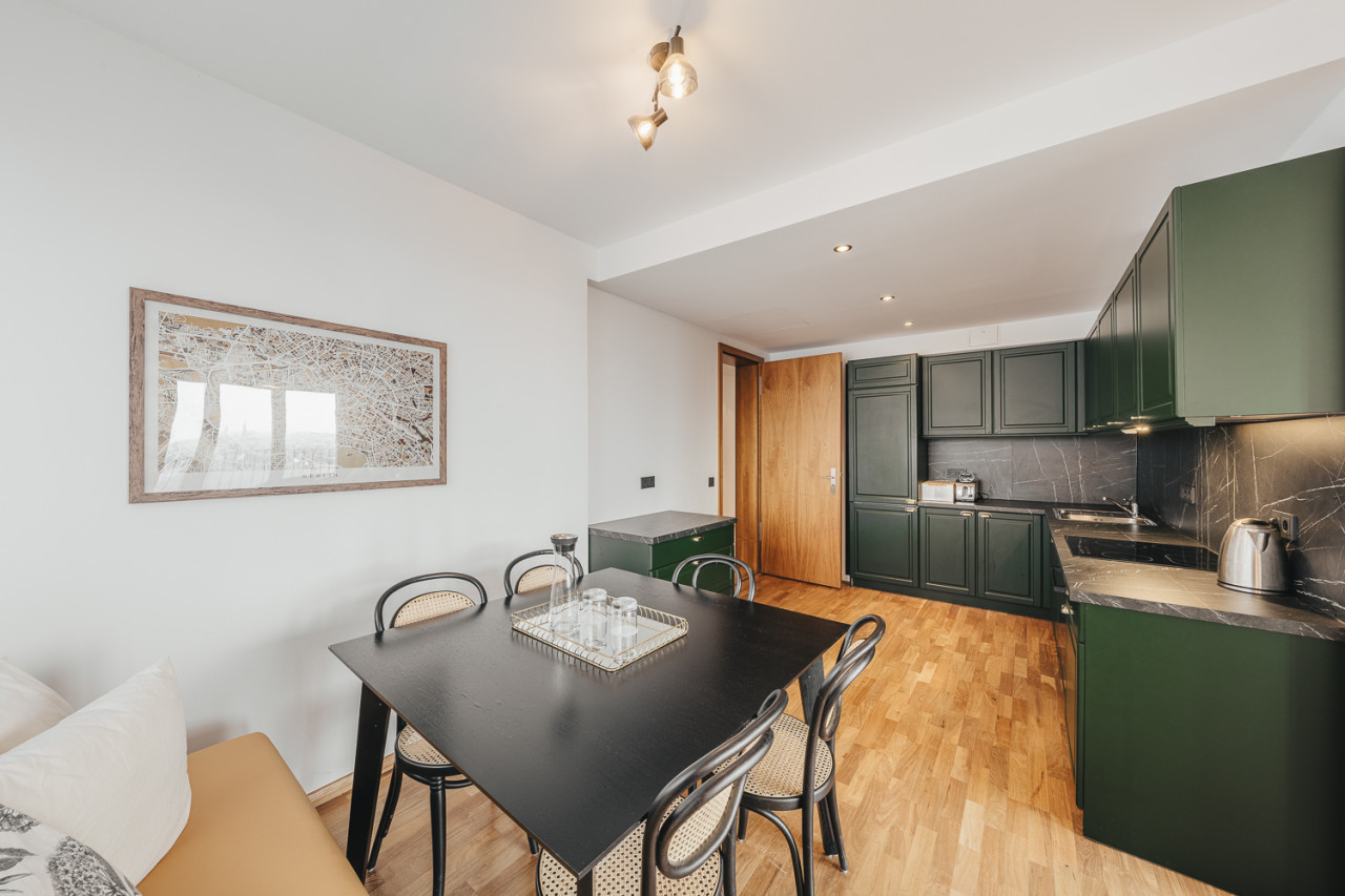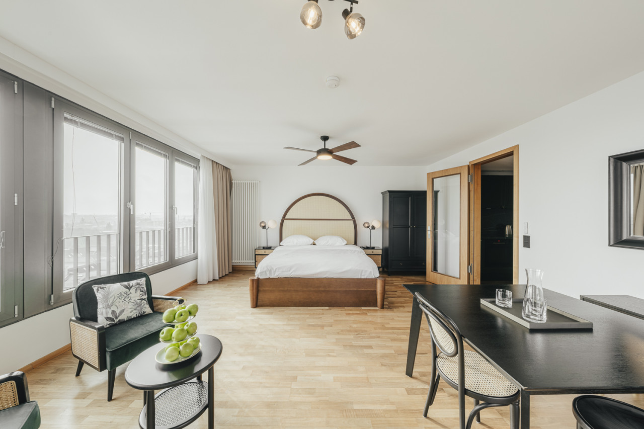 - Spacious Layout: Two classic bedrooms and a fully equipped office with a sofa bed, which can function as a third bedroom.