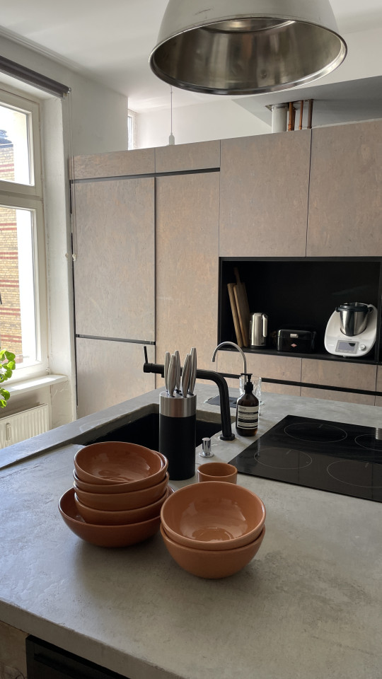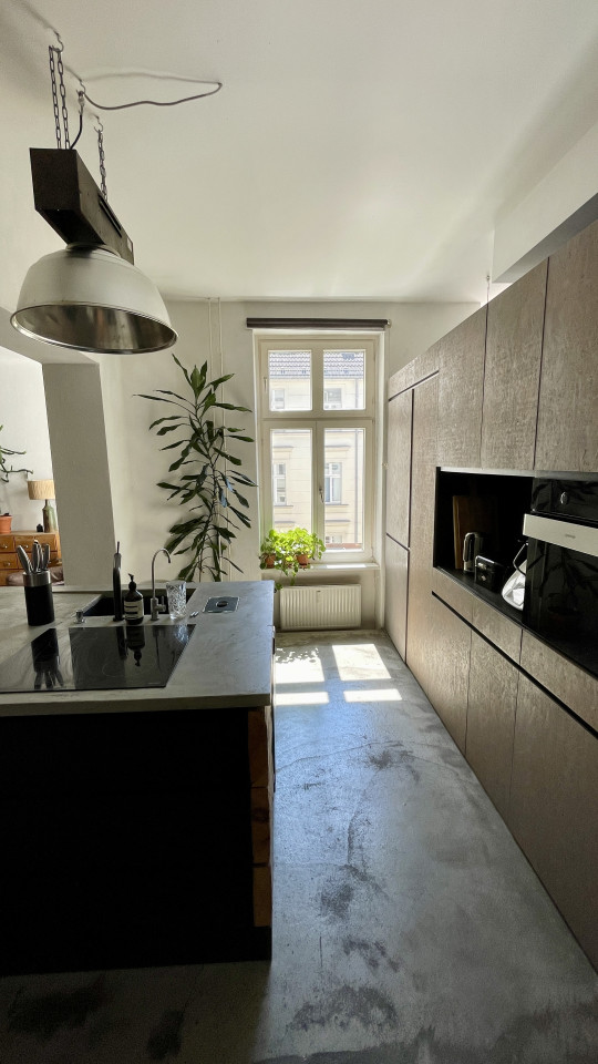 Renovated Altbauloft in Kreuzberg on the Landwehrkanal. Located in a very quiet street in the front building with balcony. Open kitchen with cooking island, modern concrete bathroom with rain shower, old floorboards and custom made furniture.