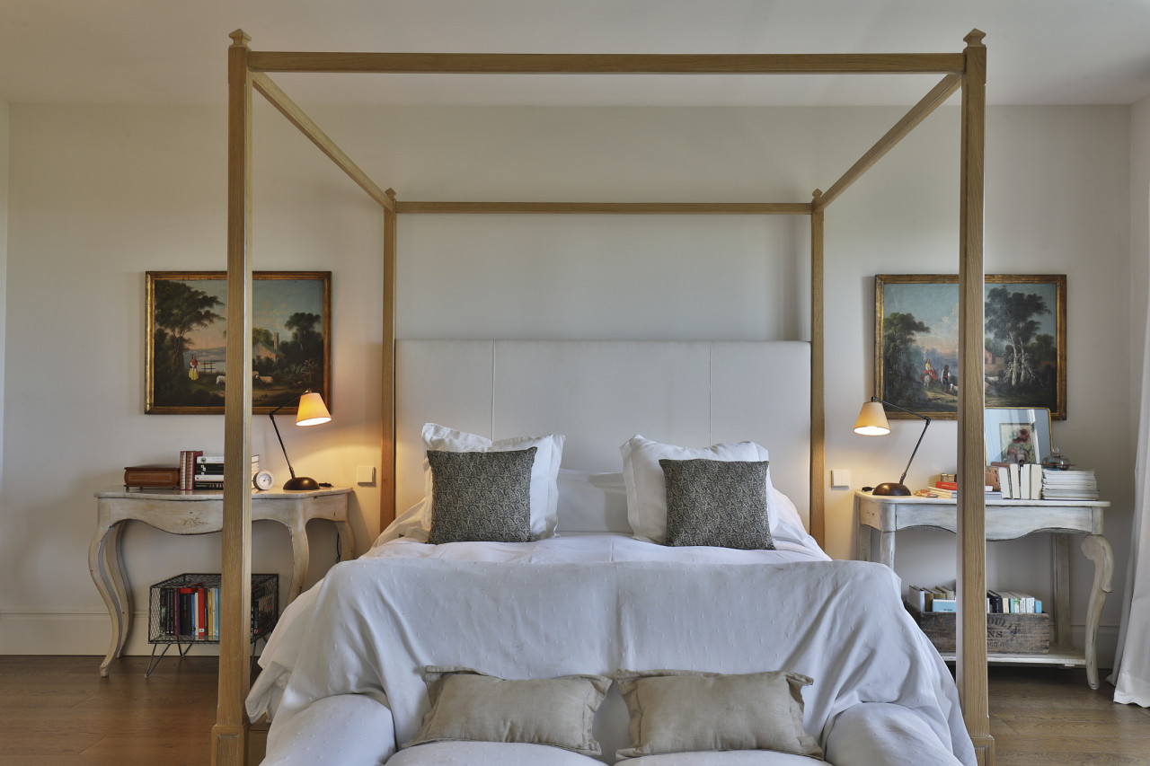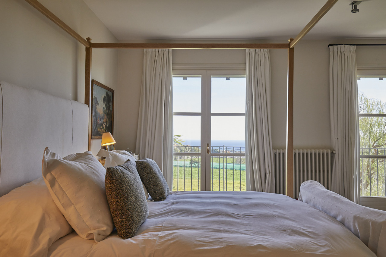 The bedrooms feel serene and romantic, especially the principal suite with its four-poster bed, antique-inspired bedside tables, and large windows that overlook the sea. Light curtains diffuse the daylight, giving the rooms a gentle, dreamy quality. Adjacent spaces, such as a refined home office lined with bookshelves or a lounge area with layered textiles, offer additional looks and moods for shoots requiring intellectual, intimate, or contemplative settings.