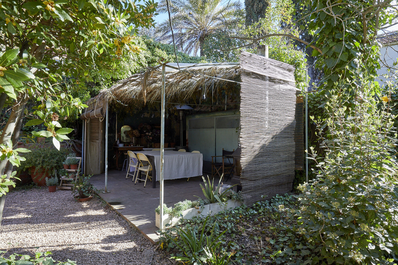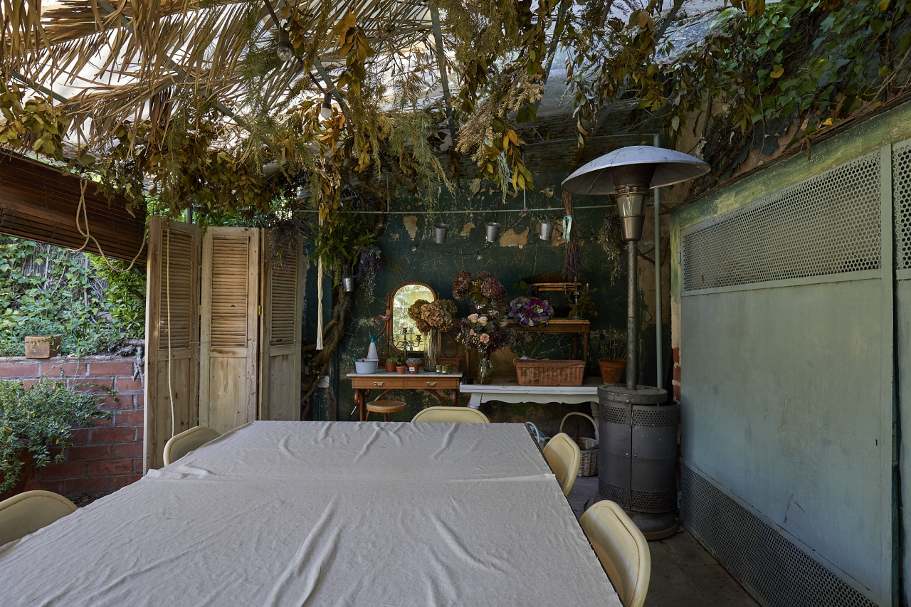 Throughout the home, unique creative nooks add authenticity—shelves filled with books and objects, a charming work desk set against white brick, and handmade furniture pieces that communicate a lived-in, artistic feel. Outdoors, Casa Emma continues to shine with lush greenery, mature trees, and Mediterranean landscaping. The enchanting rustic dining porch, adorned with hanging plants and weathered textures, provides a magical greenhouse-like setting perfect for intimate gatherings, still-life scenes, or romantic editorials. The garden wraps around the property with shaded paths, open lawns, and a private pool bordered by vegetation, offering a relaxed and summery atmosphere for fashion or lifestyle shoots.