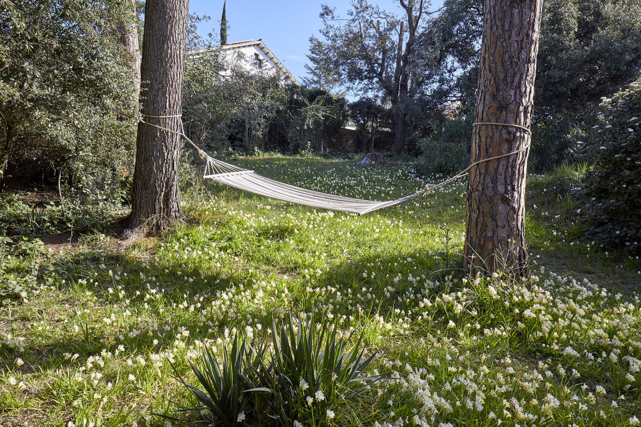 Casa Emma is an eclectic Mediterranean home in Sant Cugat del Vallès that blends warmth, character, and artistic charm in every corner. The interior is filled with natural light, thanks to the large traditional windows and open layout that connect effortlessly to the surrounding garden. Bedrooms feel calm and airy, styled in soft whites with rustic details and garden views that create an inviting, serene atmosphere—ideal for lifestyle, wellness, and morning light productions. Personal touches like handcrafted lamps, textured headboards, and curated wall art give the rooms a subtle creative personality without overwhelming their simplicity.