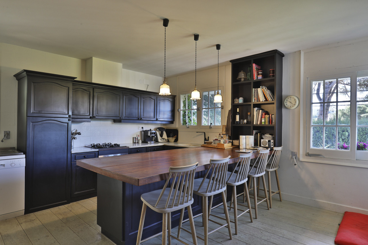 The living areas bring together vintage influences and contemporary comfort, offering an open, spacious layout perfect for shooting multiple scenes. Deep blue sofas, natural fabrics, and warm wood accents set a relaxed bohemian mood, while the striking dark feature wall surrounding the fireplace adds cinematic contrast for editorial-style shots. The space flows naturally into the dining area and kitchen, where deep-toned cabinetry, a large wooden island, and pendant lighting offer a cozy yet sophisticated backdrop for culinary, family, or lifestyle content.