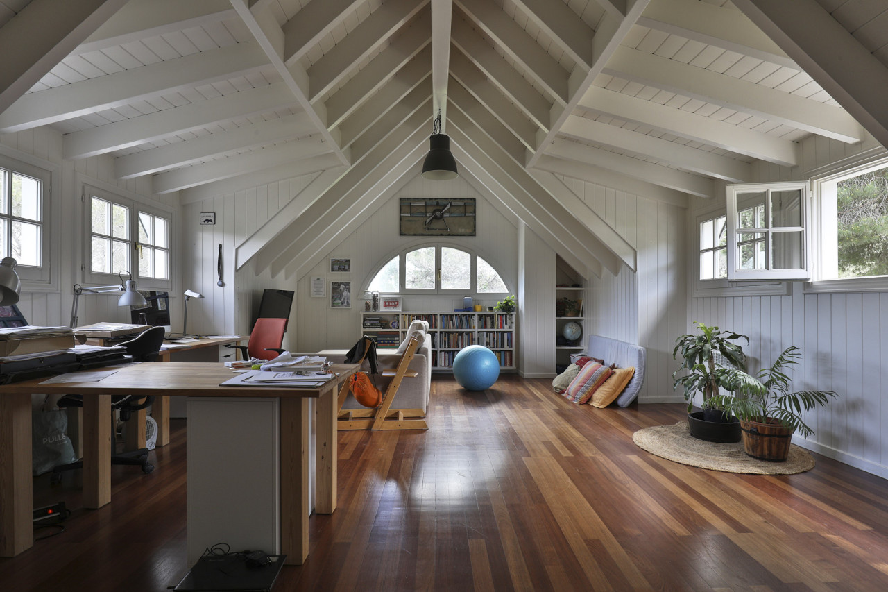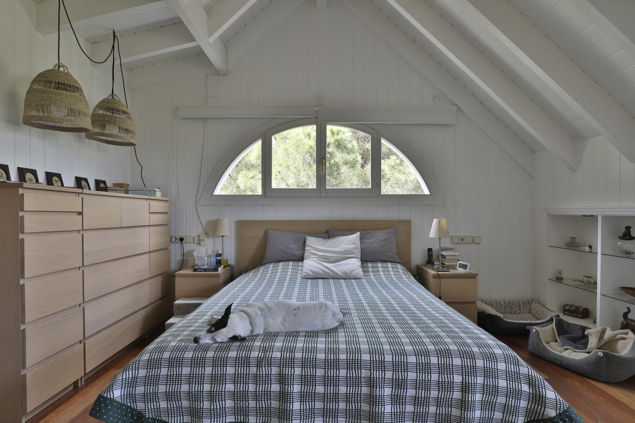 The upper levels reveal vaulted, A-frame ceilings that turn bedrooms and studio spaces into airy, photogenic backdrops. The main bedroom pairs neutral tones with handcrafted lighting and a signature half-moon window that overlooks the treetops. Another standout is the expansive attic studio: an open, loft-like area filled with desks, books, cushions, and plants, perfect for creative work, wellness shoots, children’s scenes, or anything that benefits from a warm and inspiring environment.