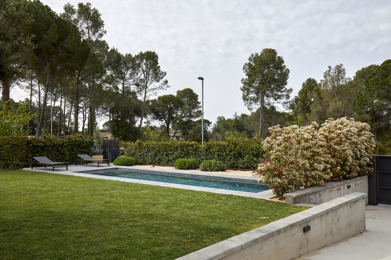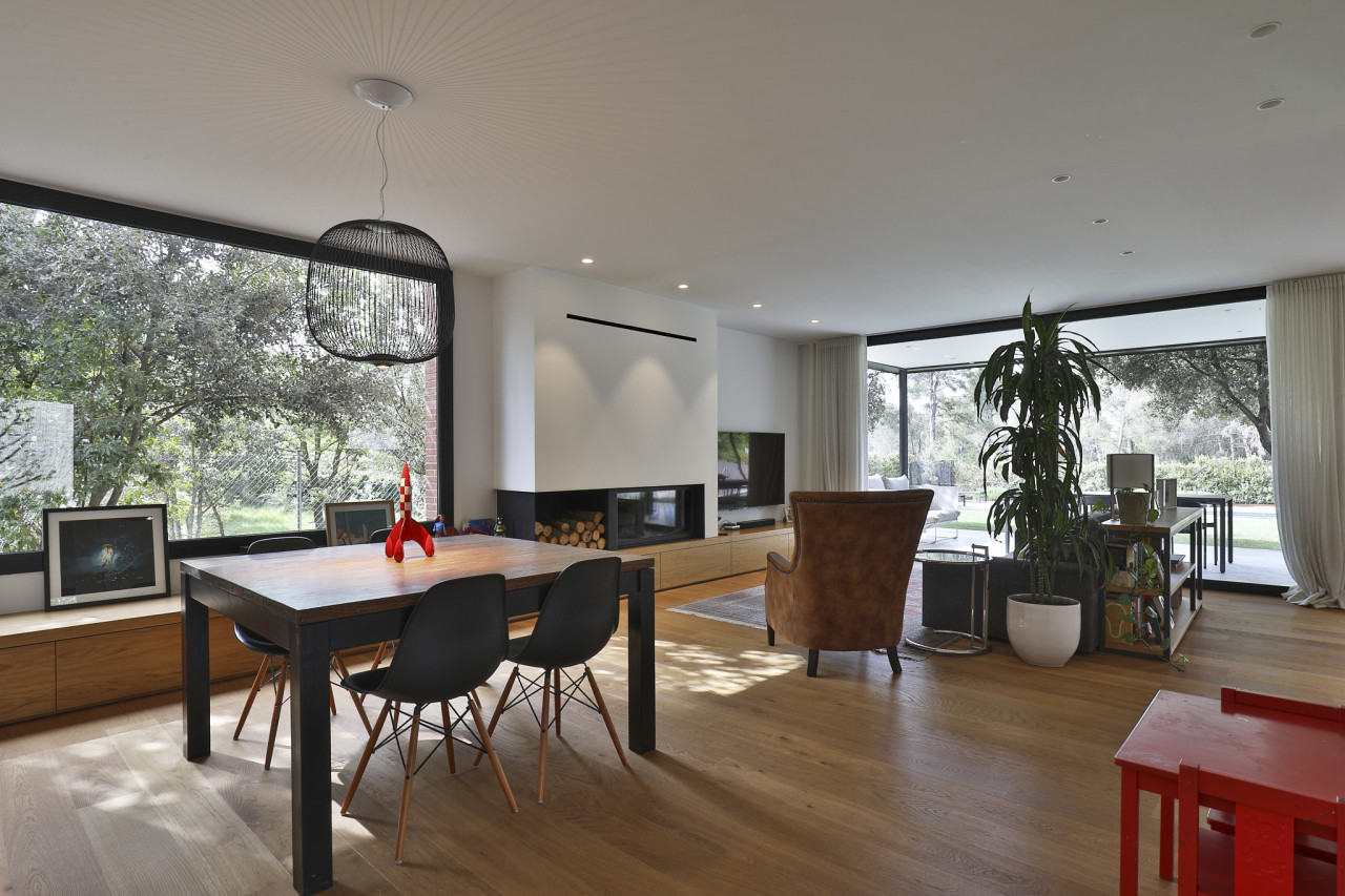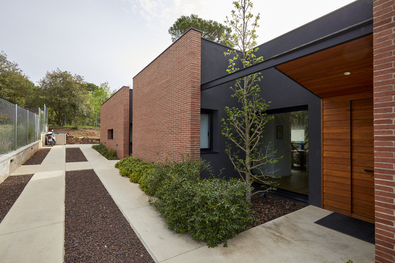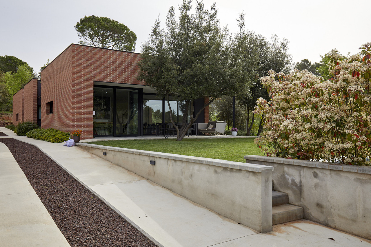 Casa Herbert is a strikingly modern residence in Matadepera, designed with clean architectural lines, expansive glazing, and a seamless connection to its natural surroundings. The home’s bold geometry—expressed through its brick façades, deep black framing, and warm wooden accents—creates a visually impactful backdrop that feels both contemporary and inviting. Floor-to-ceiling windows wrap around the main living areas, allowing views of the lush garden and pool to pour inside, while natural light softens the sharp structural forms and highlights the carefully crafted interior details.