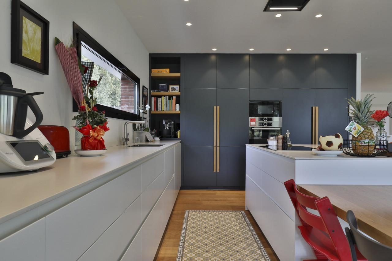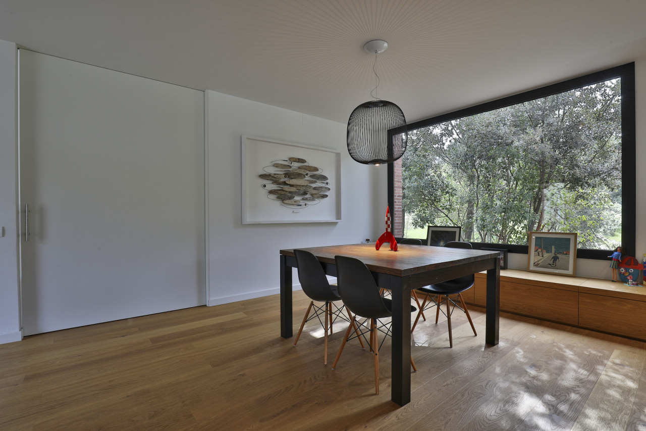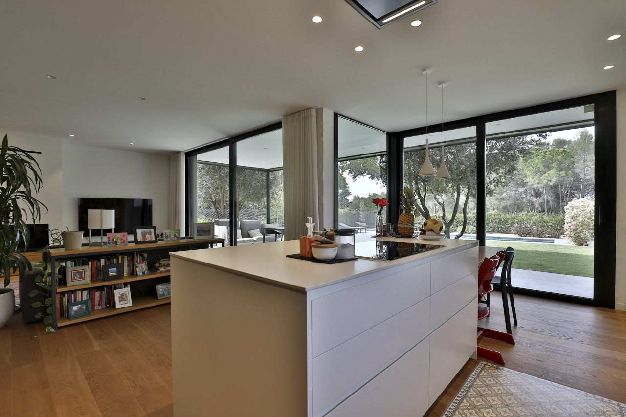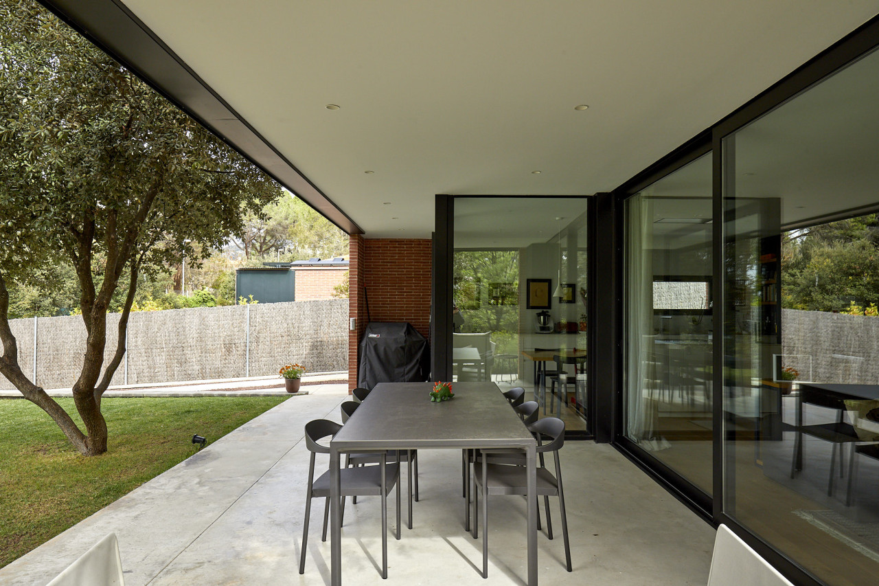 Casa Herbert is a strikingly modern residence in Matadepera, designed with clean architectural lines, expansive glazing, and a seamless connection to its natural surroundings. The home’s bold geometry—expressed through its brick façades, deep black framing, and warm wooden accents—creates a visually impactful backdrop that feels both contemporary and inviting. Floor-to-ceiling windows wrap around the main living areas, allowing views of the lush garden and pool to pour inside, while natural light softens the sharp structural forms and highlights the carefully crafted interior details.