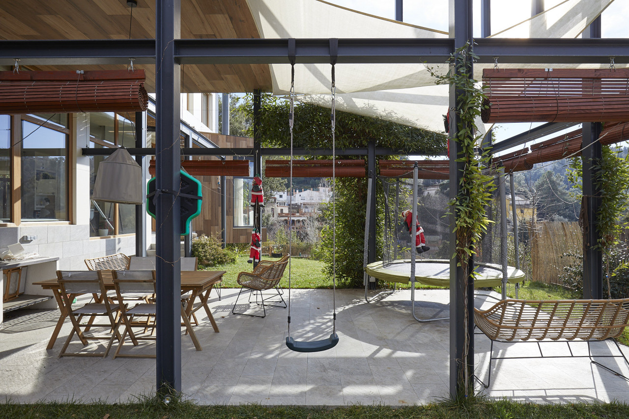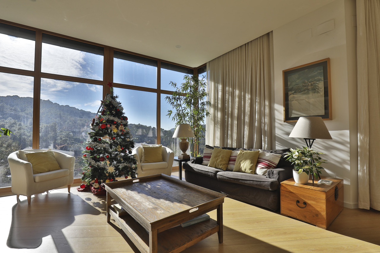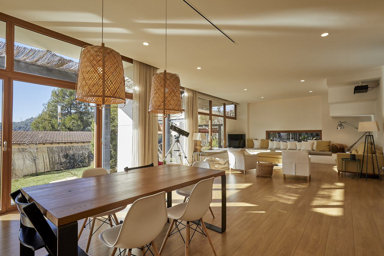 Casa Hugo is a warm, contemporary family home that blends Scandinavian calm with Mediterranean light, offering an inviting atmosphere ideal for lifestyle shoots, brand productions, or editorial features. The open-plan layout is filled with natural daylight thanks to expansive windows that frame mountain views and bring the outdoors into the living spaces. Soft neutral tones, natural woods, curated shelving and cosy textiles create a relaxed, lived-in aesthetic that still feels refined. The spacious kitchen, with its minimalist cabinetry, large island and pendant lighting, opens directly into generous living and dining areas that flow effortlessly toward the exterior. Throughout the home, thoughtful design details—like integrated bookshelves, large-format flooring, serene children’s rooms and a dual-shower bathroom—enhance its authenticity and usability. Exterior spaces maintain the same understated elegance, with warm timber cladding at the entrance and a large, bright multipurpose room overlooking the surrounding landscape. Casa Hugo is an ideal setting for productions seeking a comfortable, stylish, and naturally lit environment with a welcoming family feel.