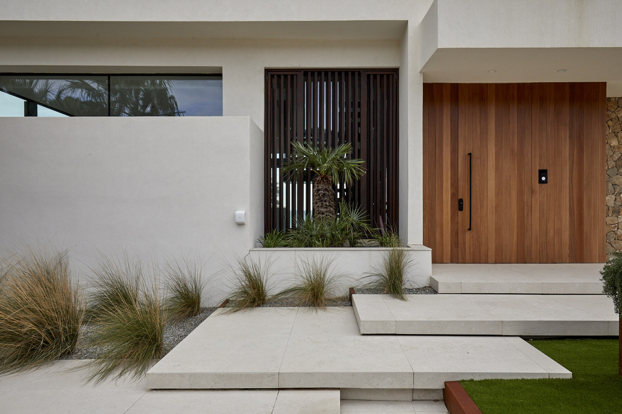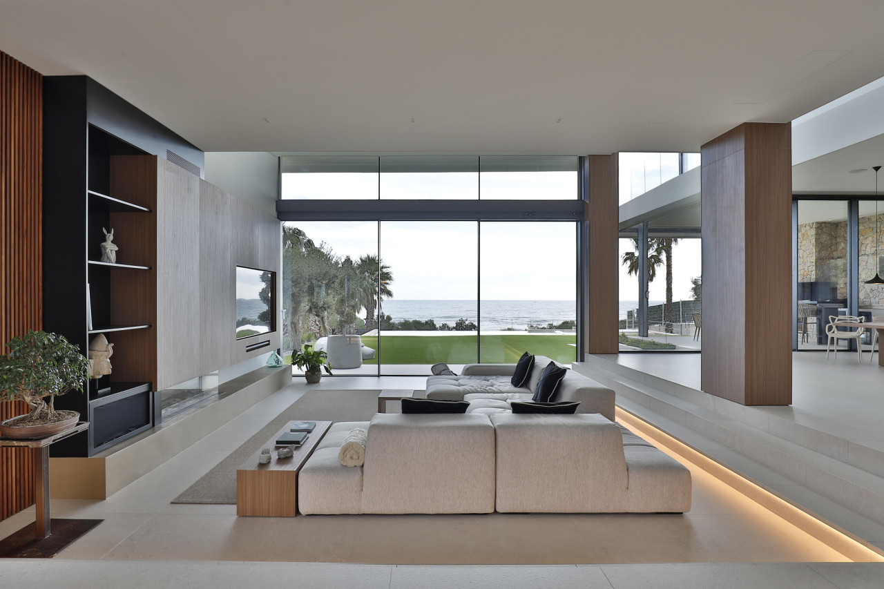 Casa Nuria is a contemporary Mediterranean villa defined by its seamless indoor–outdoor living, expansive volumes, and refined architectural detailing. The home opens with a dramatic double-height hall flooded with natural light from oversized skylights and floor-to-ceiling windows, creating an immediate sense of openness. Warm timber accents soften the crisp white architecture, while floating staircases and slender vertical balustrades add sculptural elegance. The living areas face uninterrupted sea views, framed by vast glass panes that blur the boundary between interior comfort and the coastal surroundings. Generous lounge spaces flow effortlessly toward an outdoor world of manicured lawns, serene palm-lined vistas, and a luxurious pool that appears to merge with the horizon.