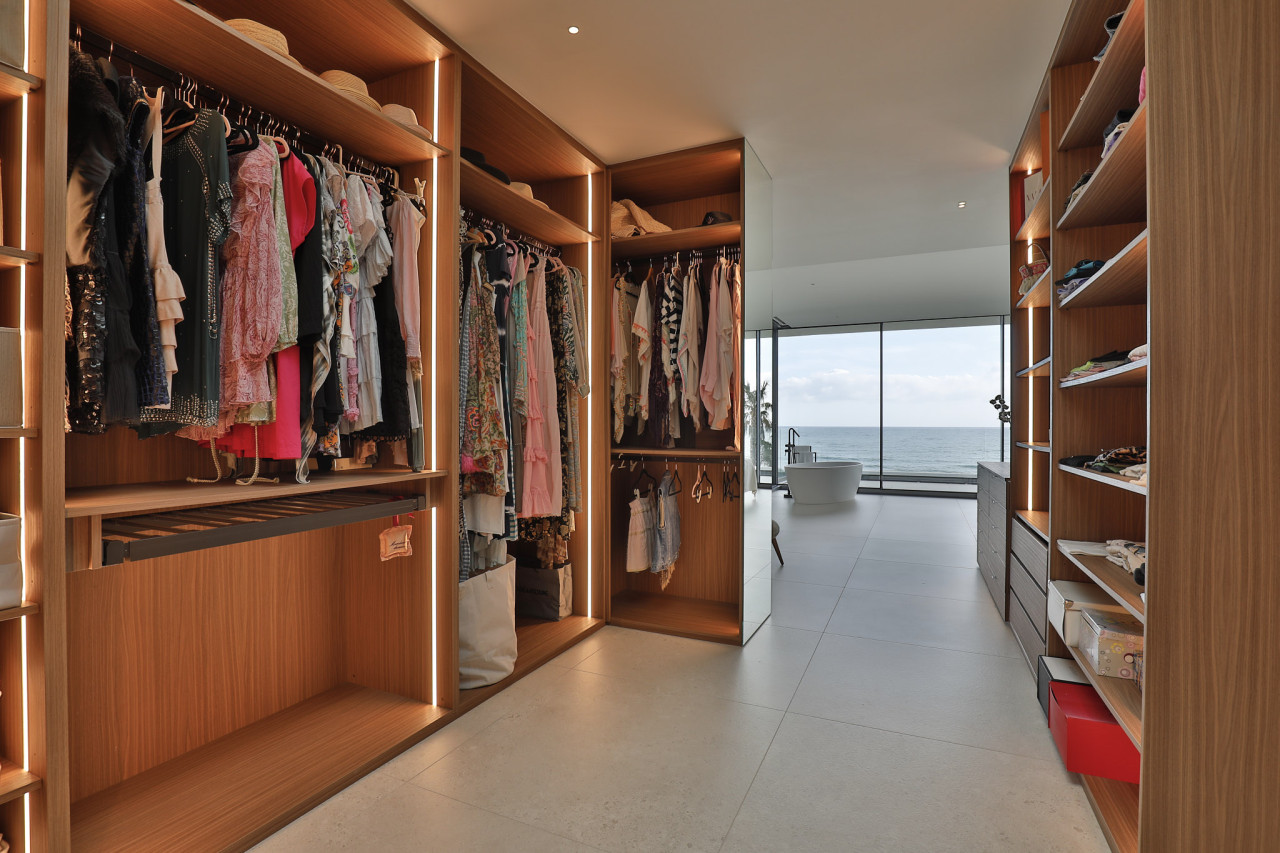 Throughout the home, minimalist design meets high-end finishes—clean stone flooring, subtle integrated lighting, and custom cabinetry crafted with precision. The dining and kitchen spaces embrace a modern aesthetic with sleek surfaces and refined furniture pieces positioned to take full advantage of the natural landscape. The outdoor terraces are designed for both relaxation and entertaining, offering shaded dining spots, stylish seating areas, and panoramic views over the Mediterranean. Even the walk-in wardrobe and bathroom areas maintain the villa’s signature sophistication, showcasing warm wood tones, tailored storage, and serene ocean backdrops. Every corner of Casa Nuria reflects a commitment to luxury, tranquility, and thoughtful design, making it an exceptional setting for photography, film, and exclusive productions.
