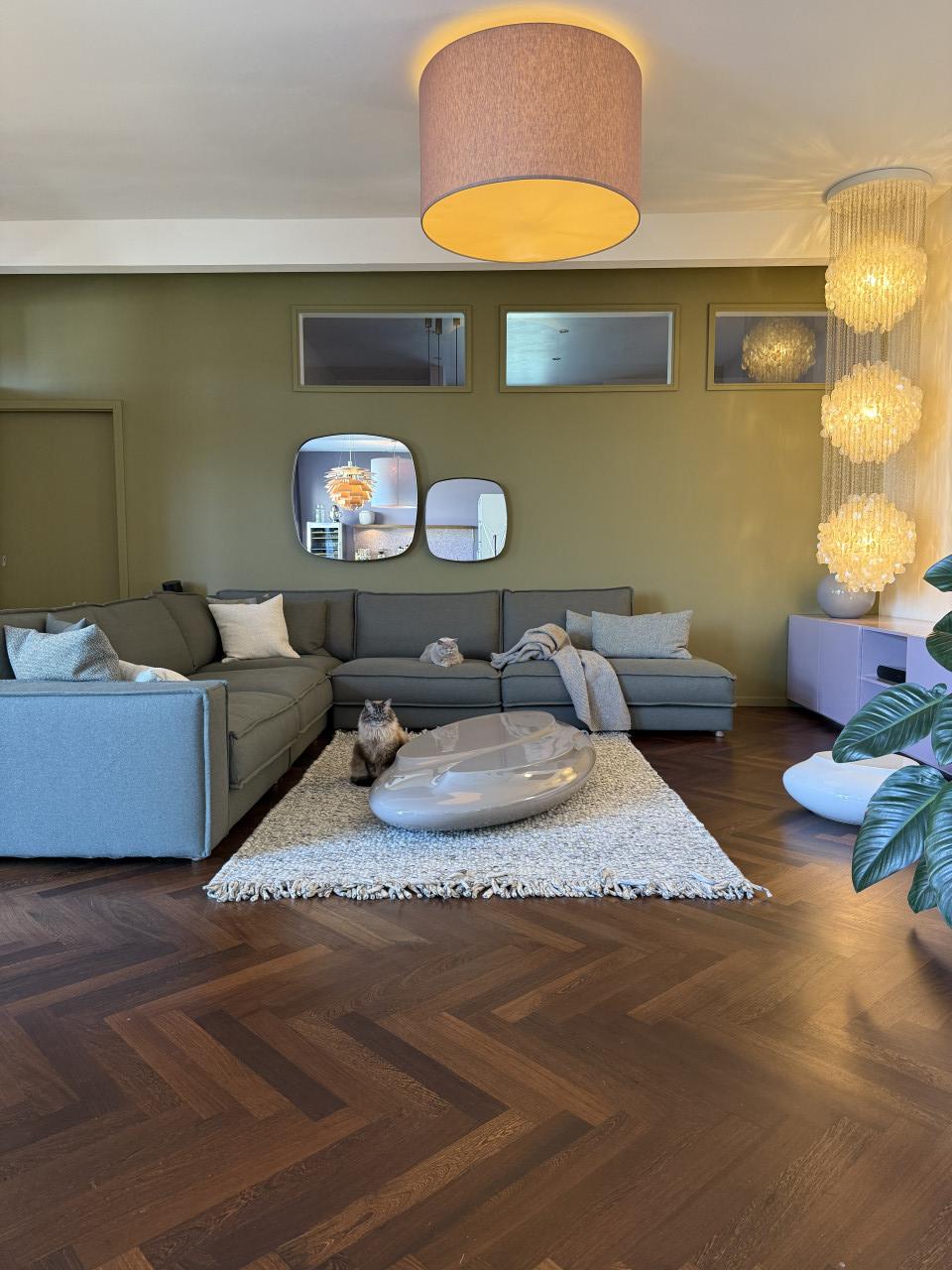 This former chocolate factory from 1927 has been transformed into a luxurious 135 m² modern loft with high ceilings and tasteful interior design. The space features large industrial-style windows, dark parquet wood flooring, designer lighting, two balconies, and a spacious living area with a stylish bathroom.