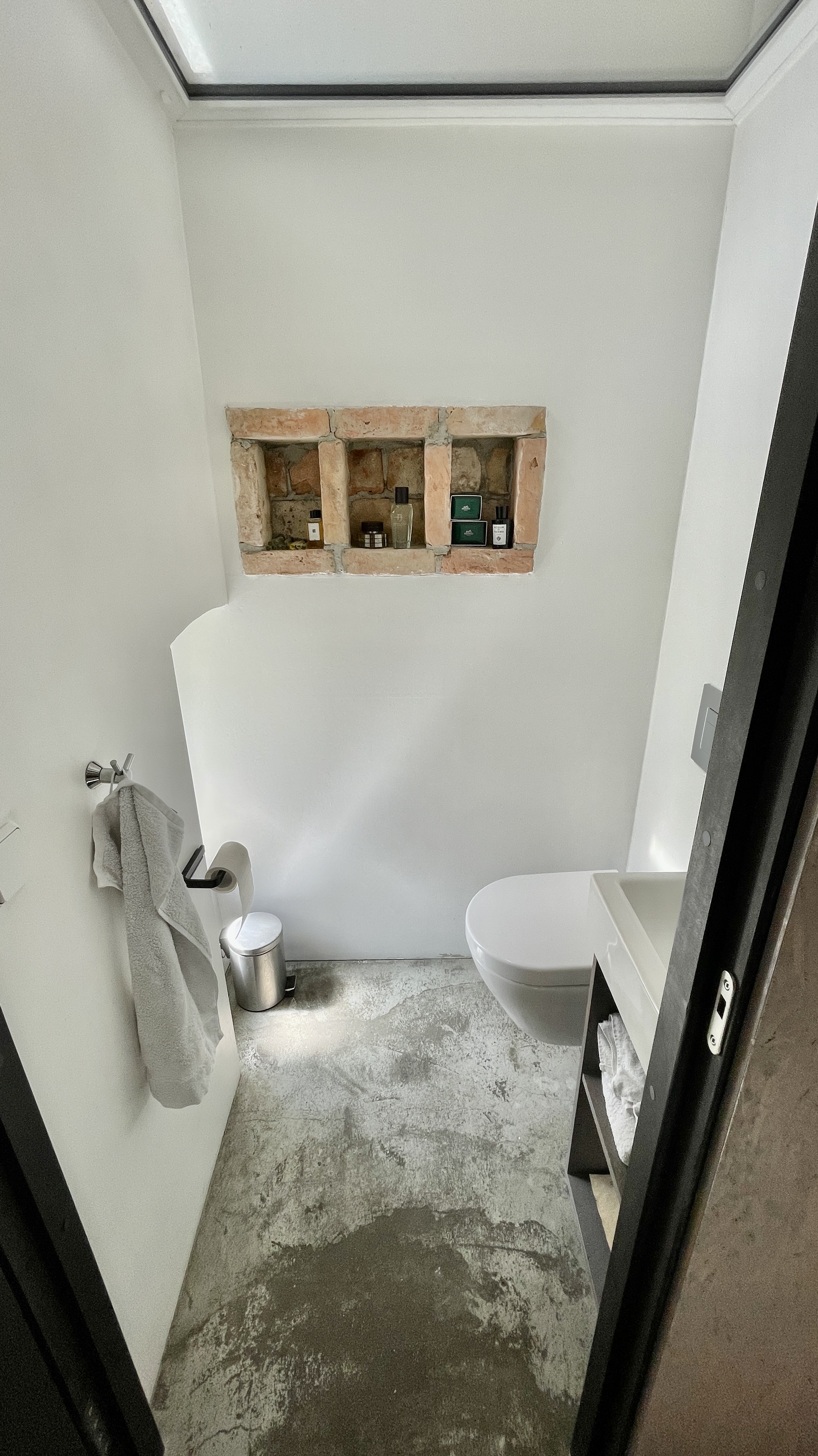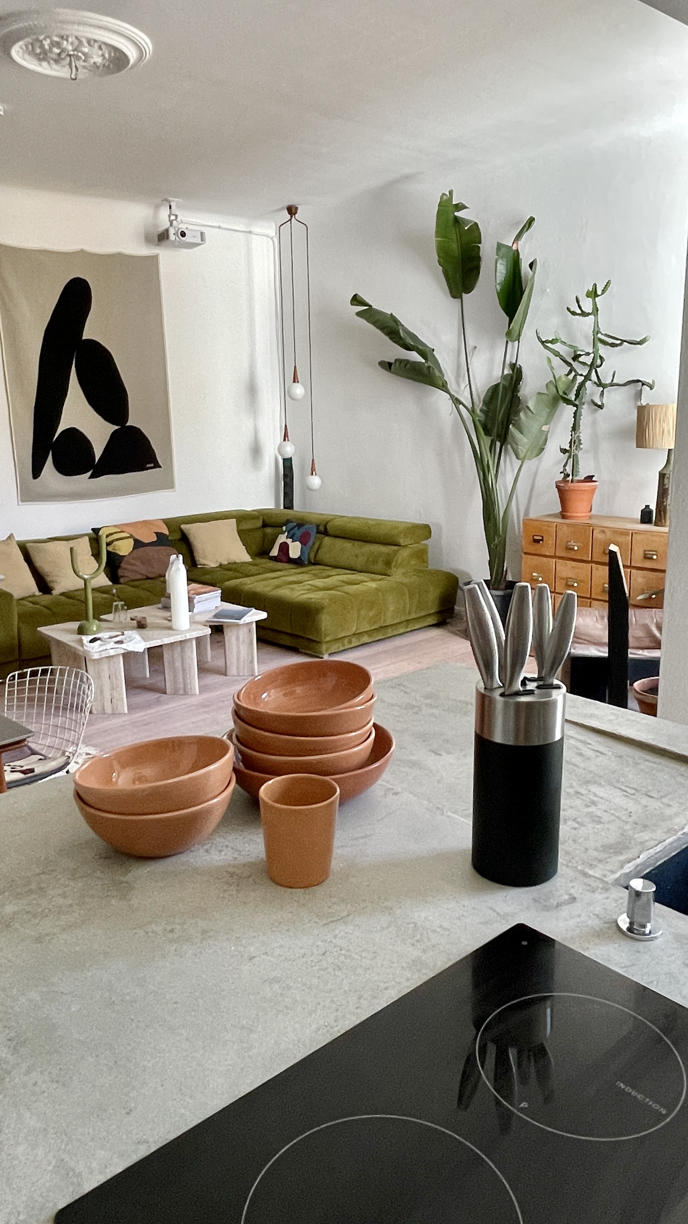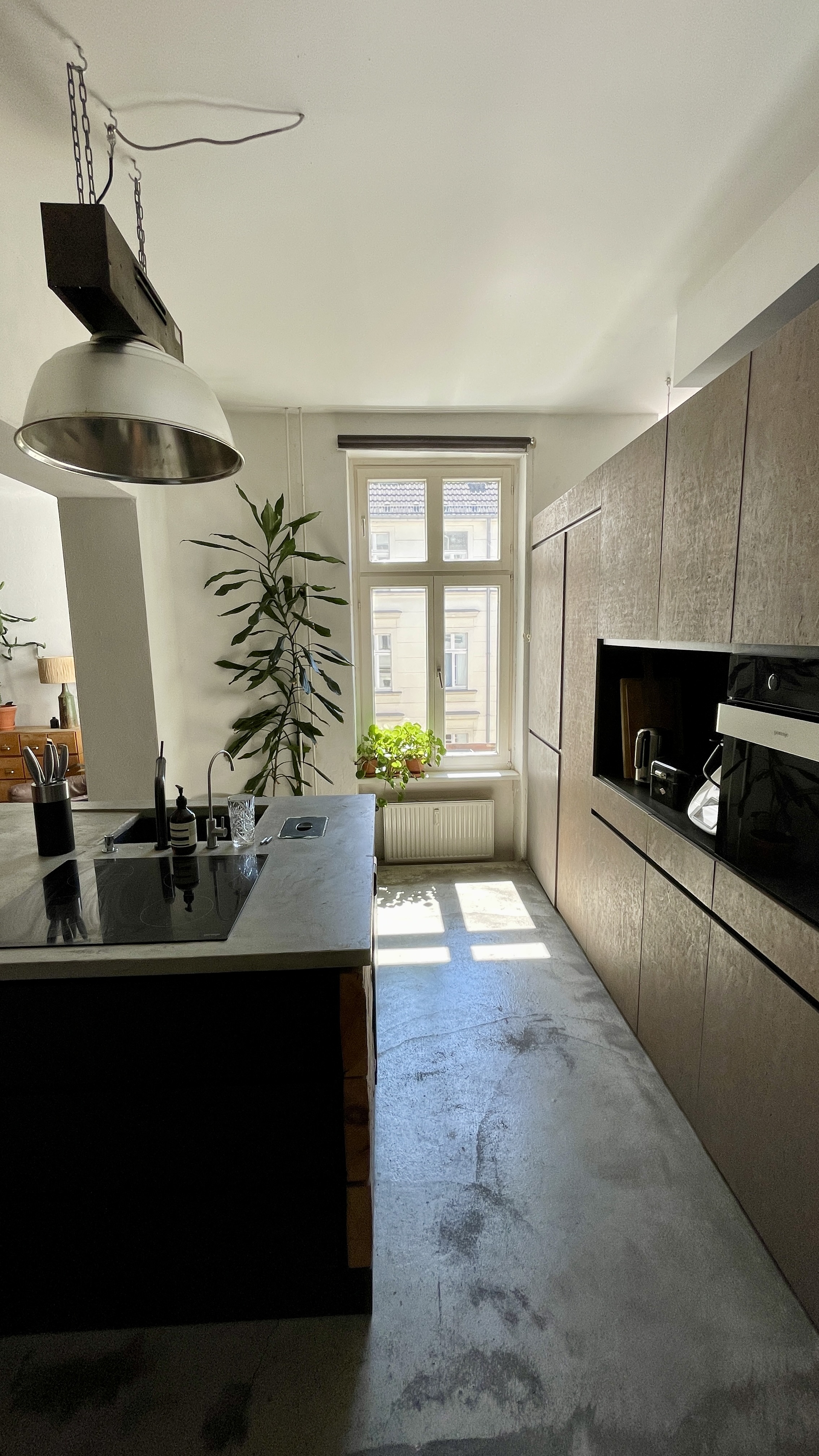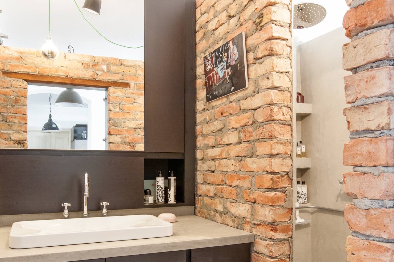 Nestled in the heart of the city, this contemporary apartment spans across multiple spacious rooms, each meticulously crafted to blend modern aesthetics with comfort. The living areas are designed with a seamless flow, featuring industrial-style bathrooms with sleek fixtures and brick walls, and a sunlit kitchen equipped with a concrete island and state-of-the-art appliances. Comfortable, yet stylish furnishings like a plush green sofa and terracotta bowls add a touch of warmth and sophistication to the space.