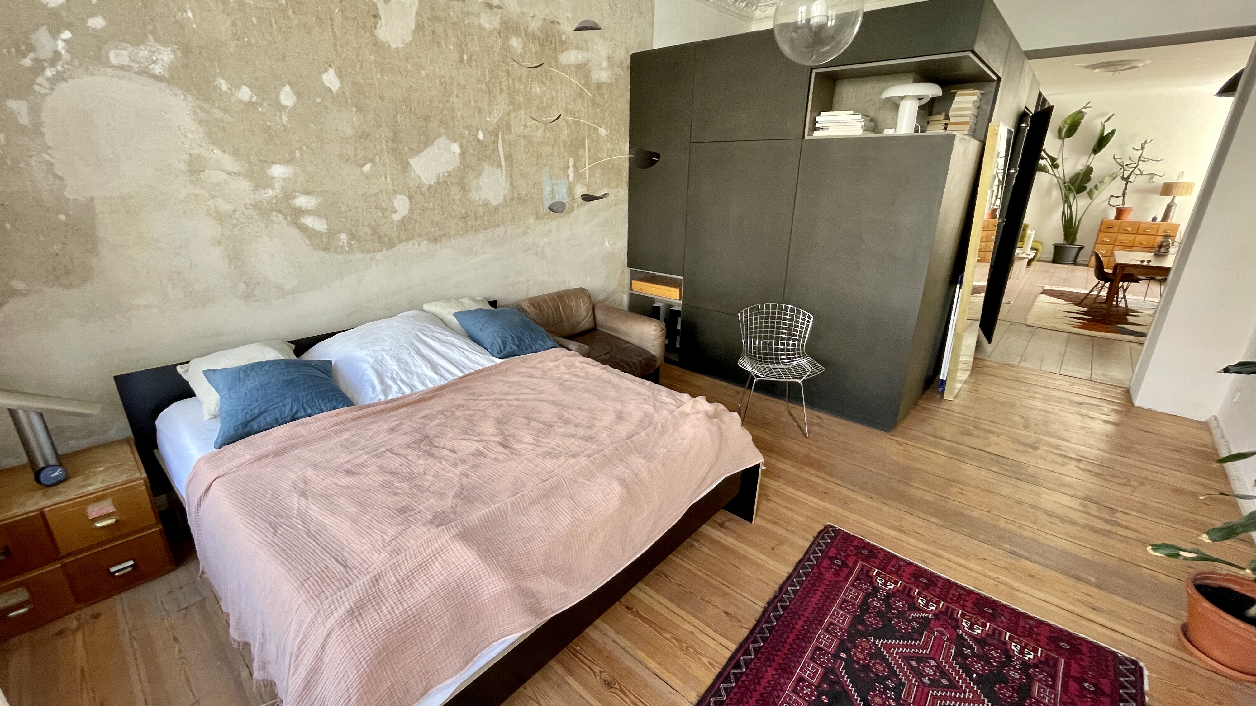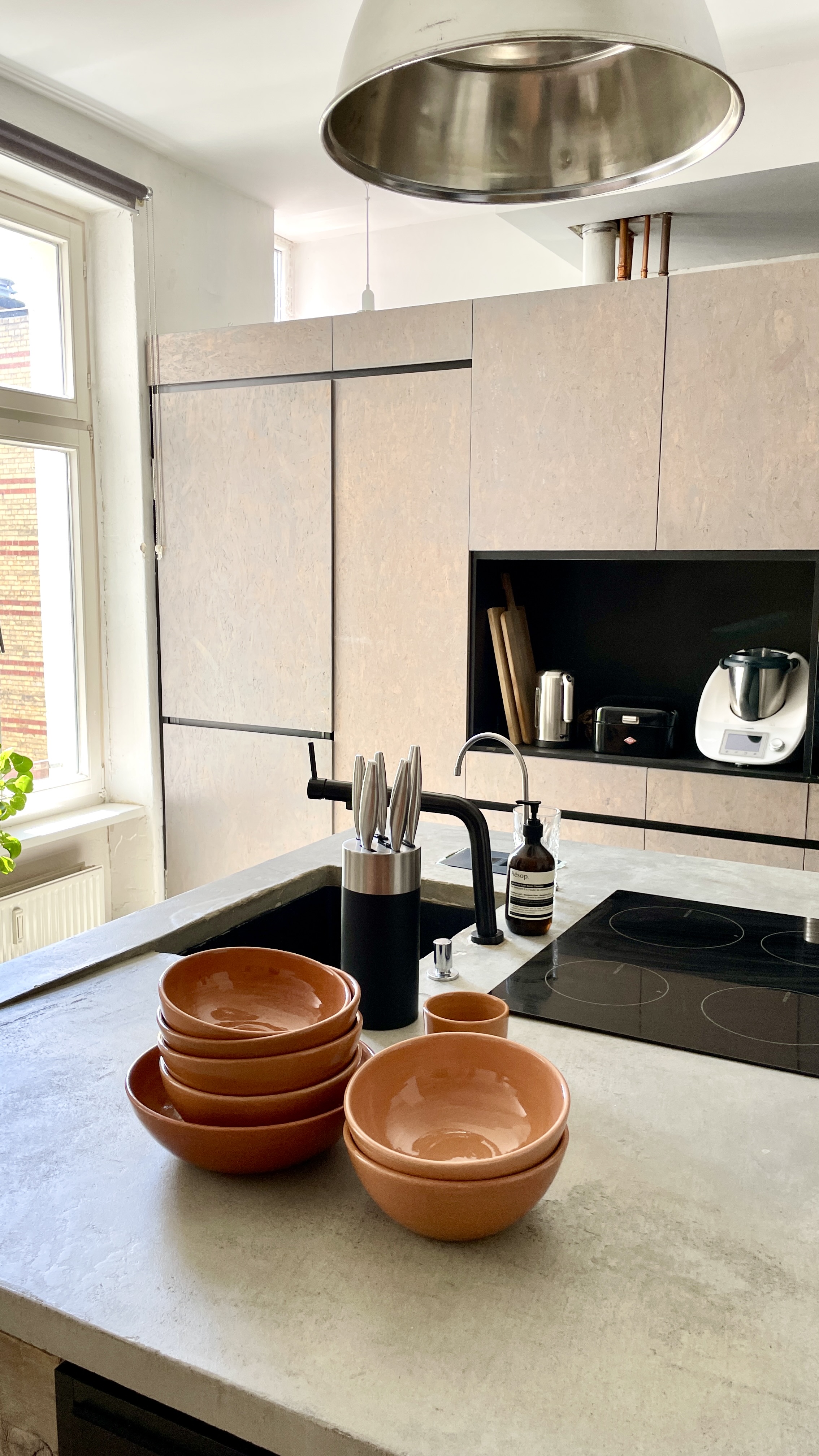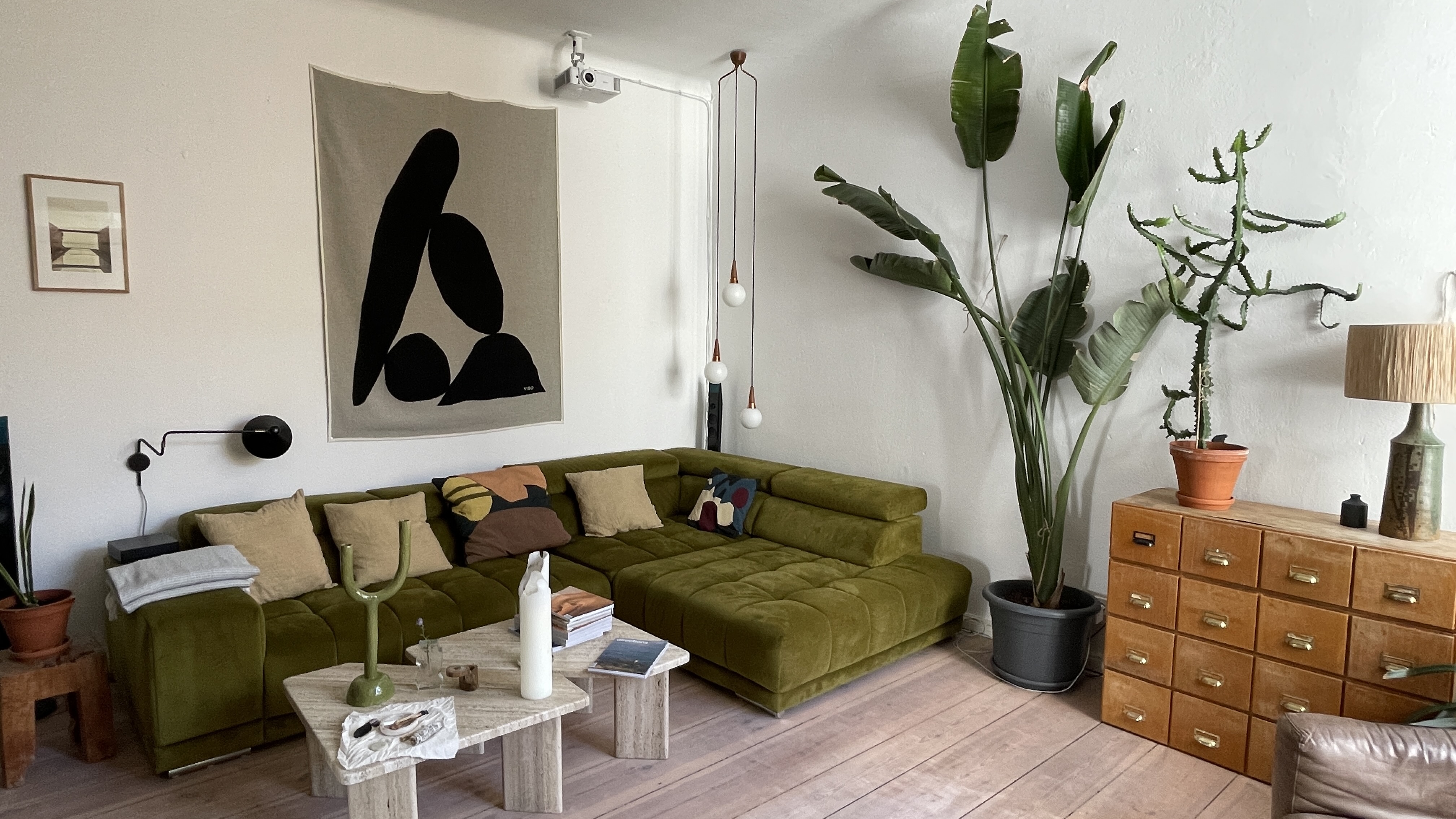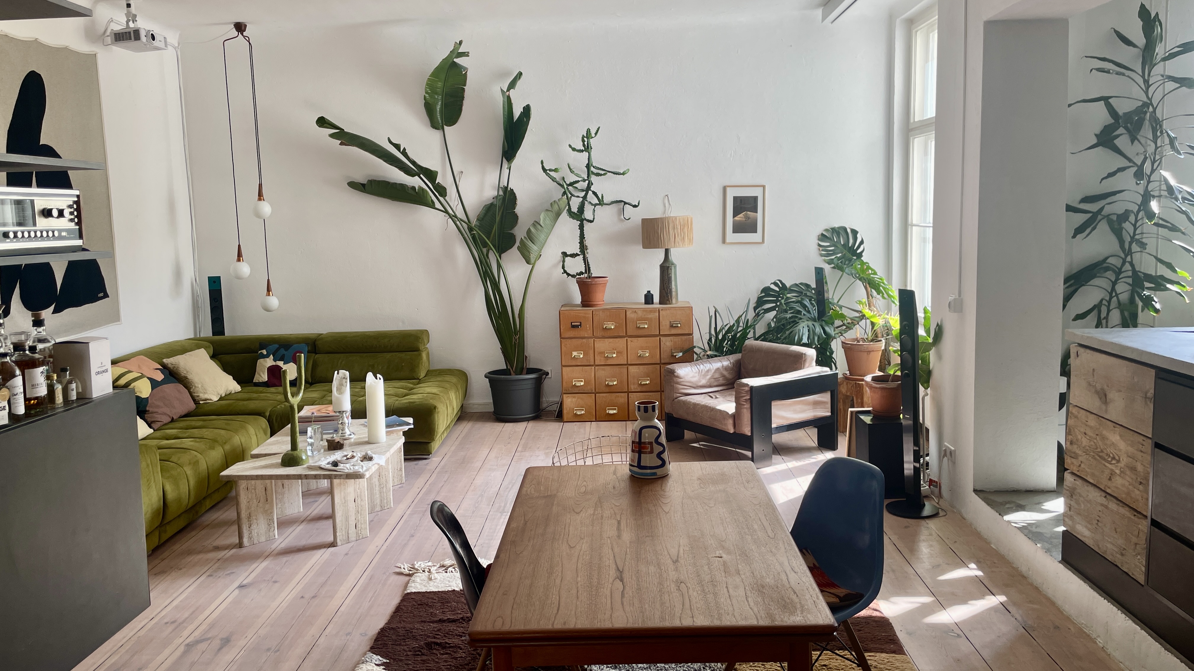 Nestled in the heart of the city, this contemporary apartment spans across multiple spacious rooms, each meticulously crafted to blend modern aesthetics with comfort. The living areas are designed with a seamless flow, featuring industrial-style bathrooms with sleek fixtures and brick walls, and a sunlit kitchen equipped with a concrete island and state-of-the-art appliances. Comfortable, yet stylish furnishings like a plush green sofa and terracotta bowls add a touch of warmth and sophistication to the space.