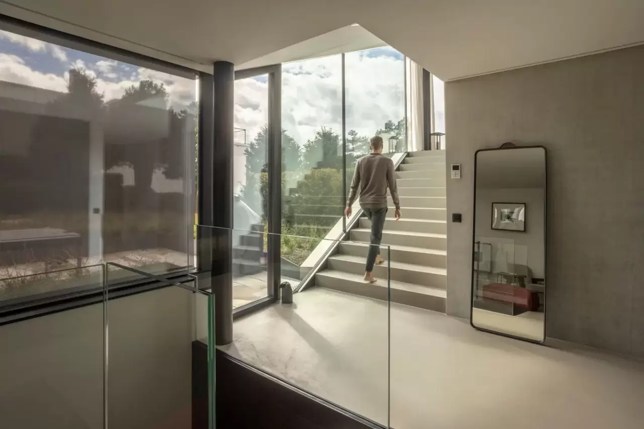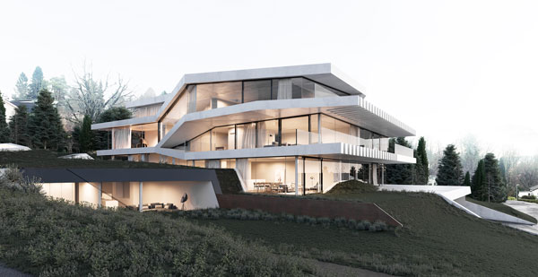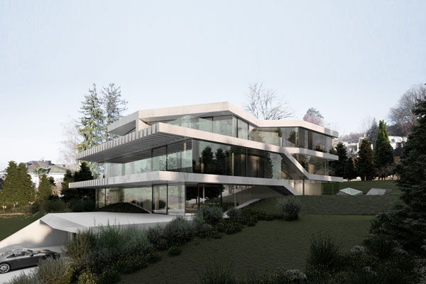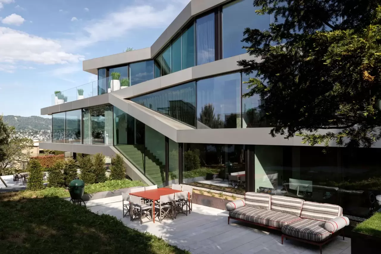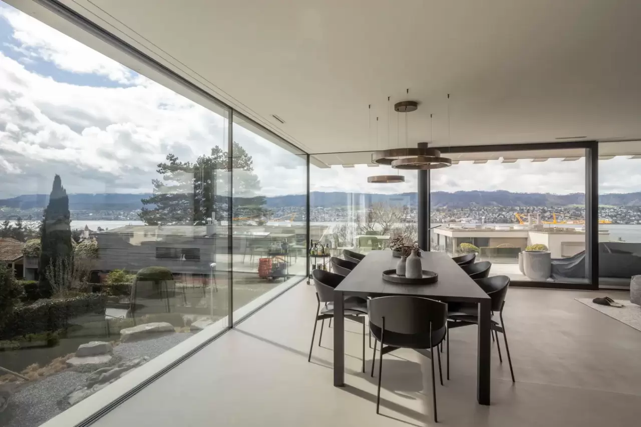 The apartment is located in Küsnacht (Zurich), Switzerland. The apartment has roughly 260sqm of living area. The apartment has a minimalistic design, concrete floor, and designer furniture. From the living room there is a 180 degree lake view.