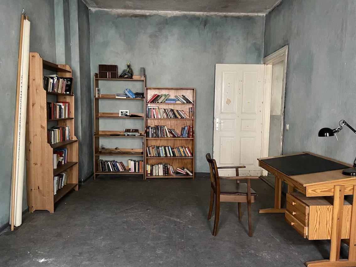 This office room with blue-turquoise patinated walls looks like it has fallen out of time. In this motif, a mad scientist or a sympathetic dreamer could embark on space or time travel.