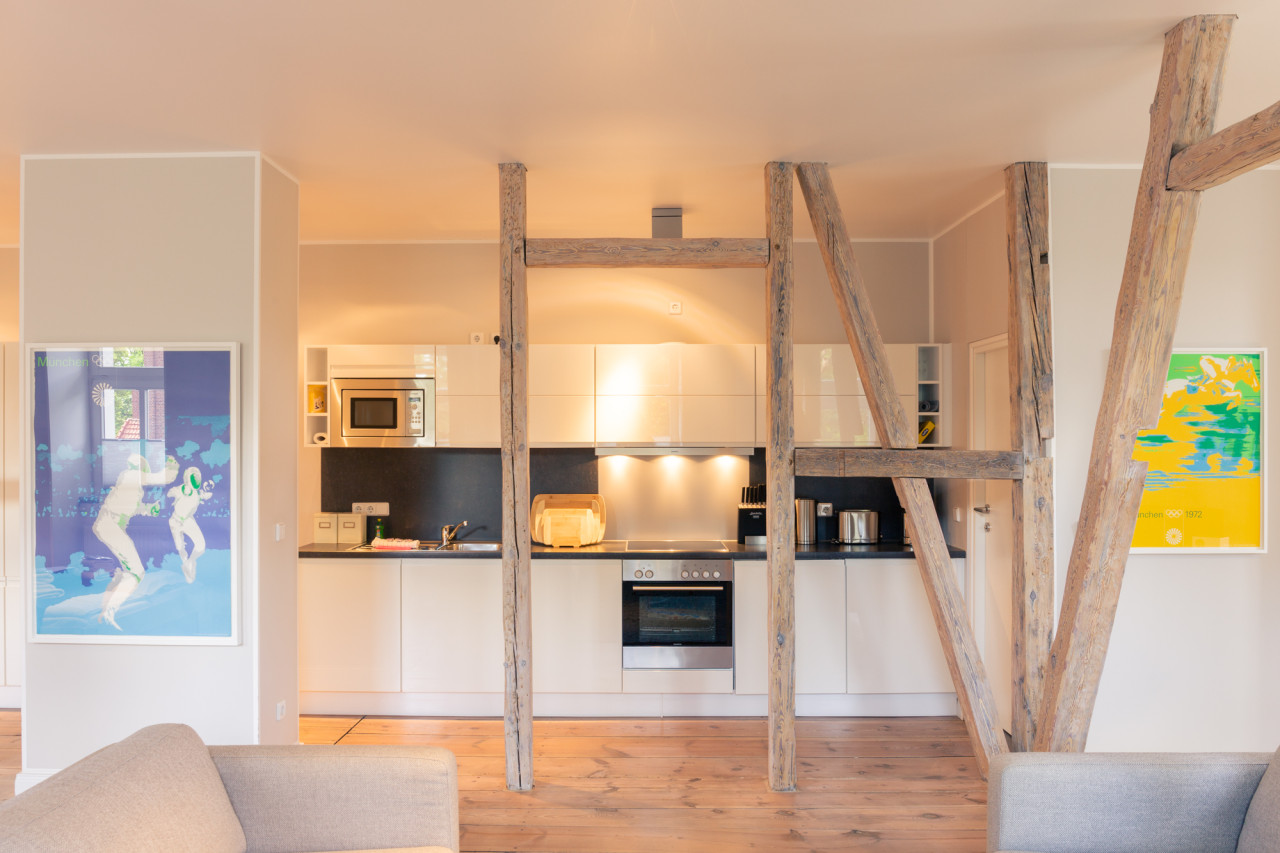 Meticulously renovated with great attention to detail, they provide the perfect setting for carefully selected, well-placed interiors, creating a timeless aesthetic. Design pieces from brands and ateliers like VON WILMOWSKY, Caspar Huckfeldt, NUTSANDWOODS, and Loft Kolasiński are paired with historical treasures such as original posters from the 1972 Munich Olympics.