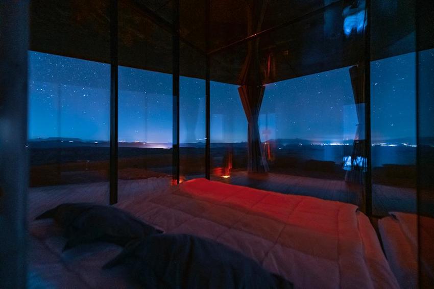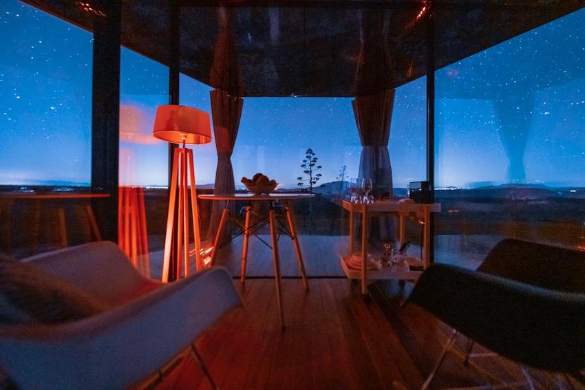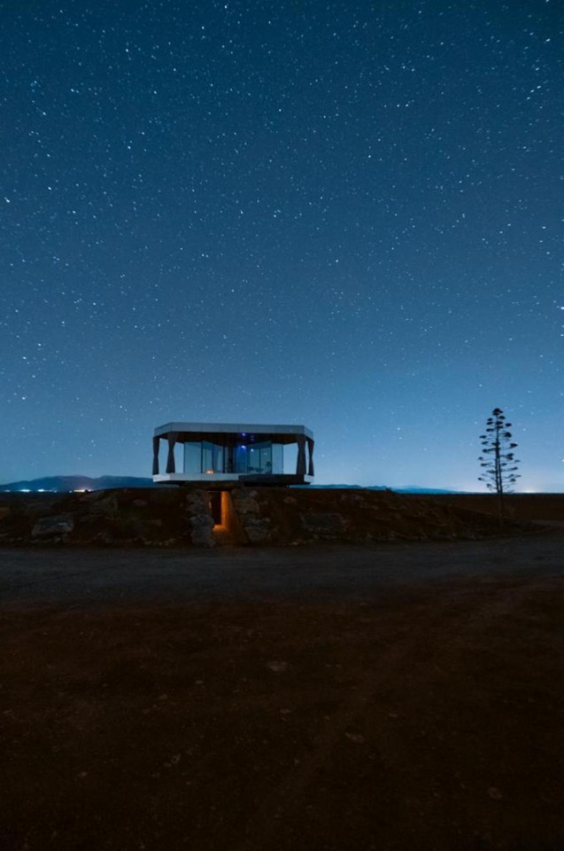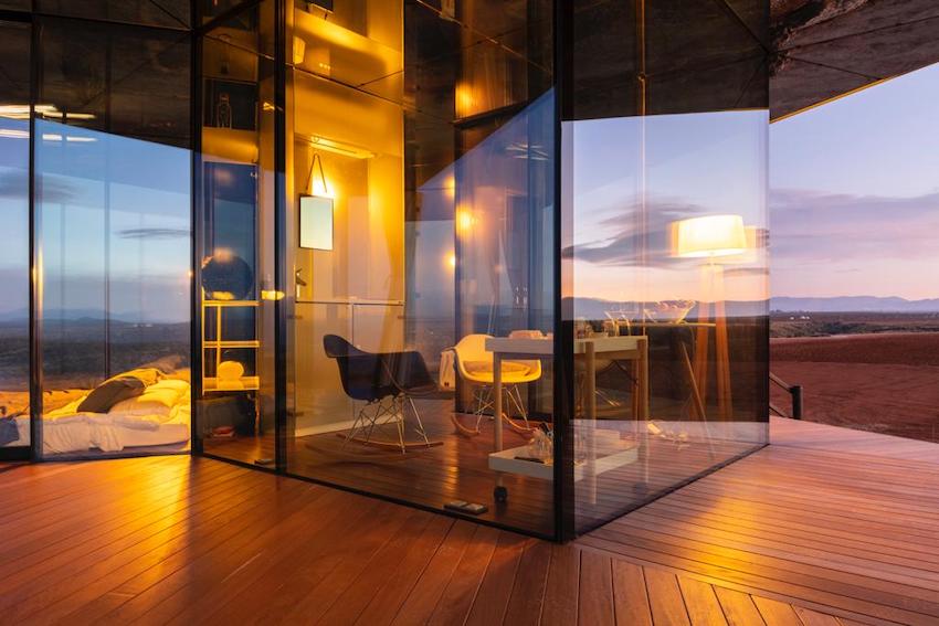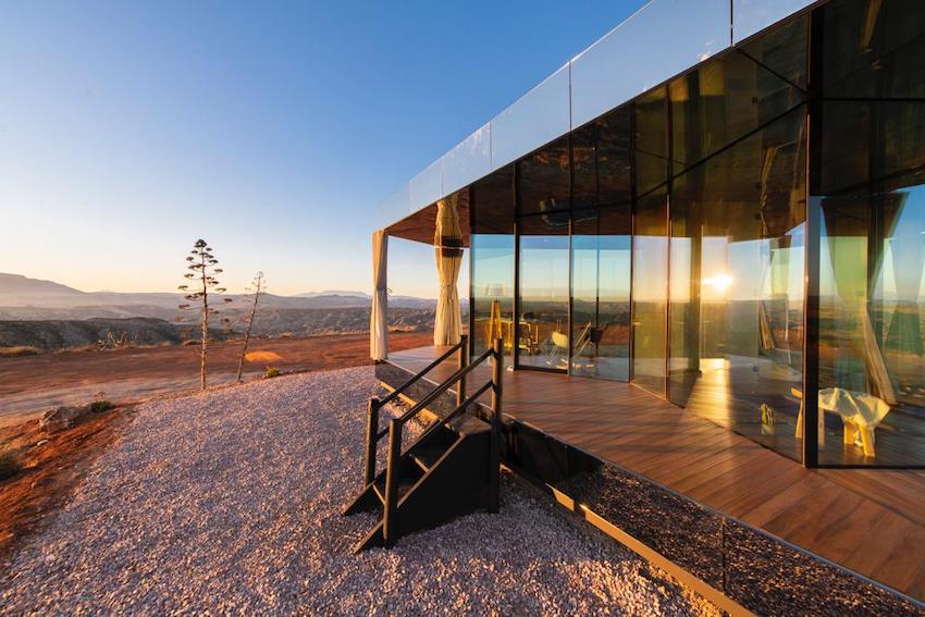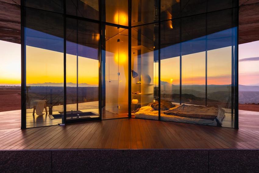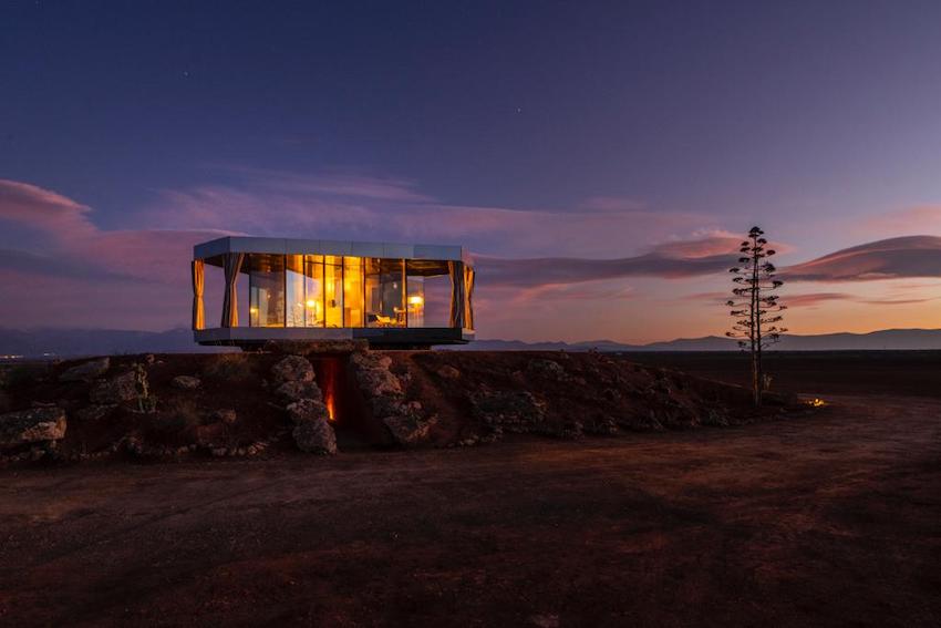 A fully glazed and self-sufficient design house, capable of withstanding the large temperature variations that can reach up to 30º in a single day thanks to its thermal glass that does not allow the cold or heat to pass through, offering a comfortable place from which to enjoy the impressive views of the desert and the stars.