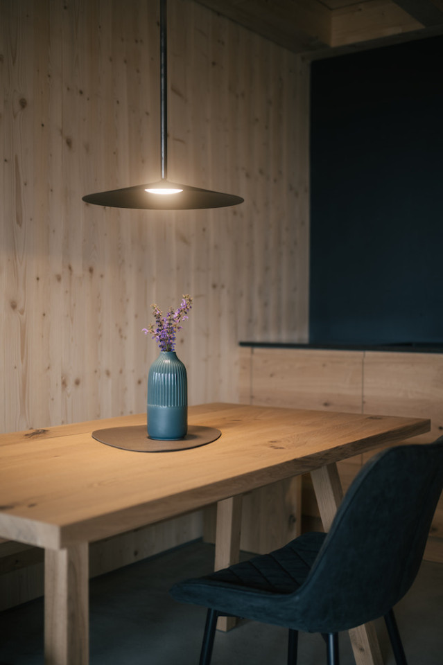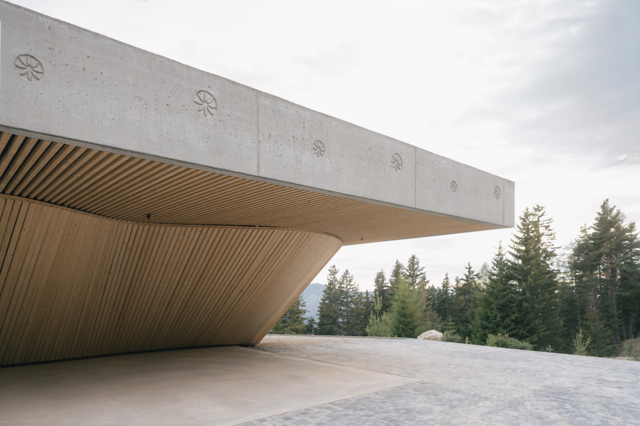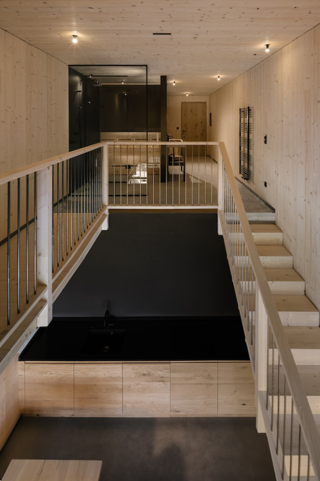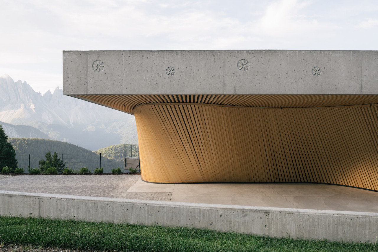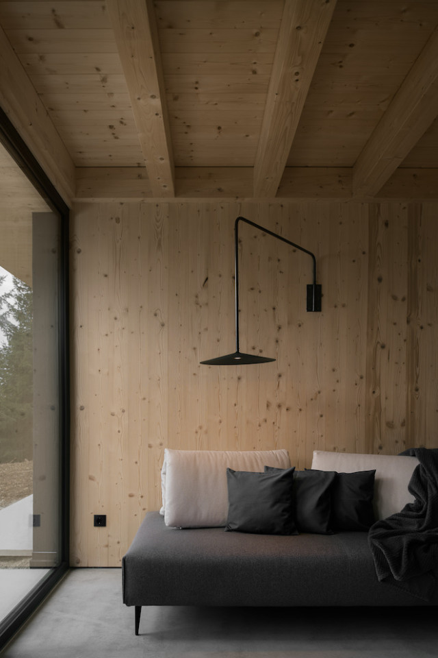 This thread also continues in the interiors. Clad with natural spruce, individual loop-like elements resurface on the walls. The stone-grey cement floor is reminiscent of the rugged mountains that surround the hotel, and contrasts with the soft textiles and fabrics that give the house a certain rusticity.