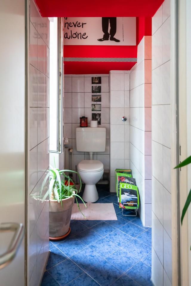 As soon as you enter you are mesmerised by the beautiful colours that compound this room, under the staircase a white open kitchen and a red wooden piano and antique furnishings, blue, brown and olive green, garnish the room.