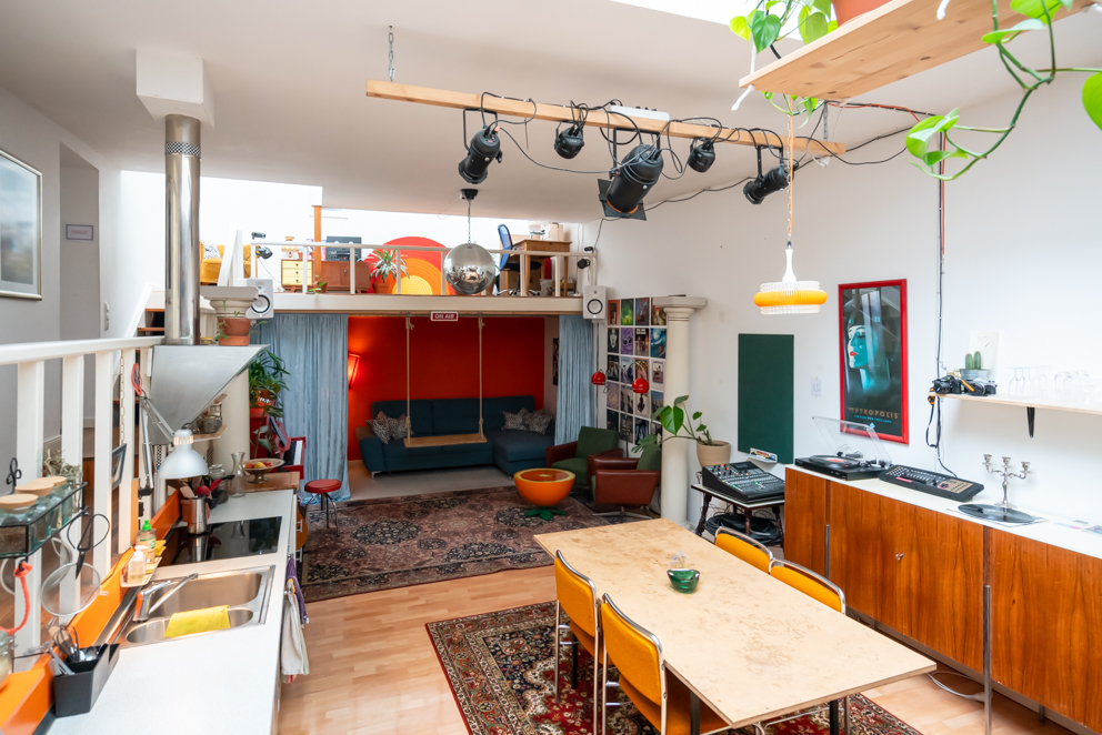 There is a terrace and in all rooms earthy coloured carpets under your feet, lots of plants, funky lamps and unique pieces of artwork scattered around the house. A table that resembles an orange, a greek pillar, a swing and a big disco ball that hangs above your head. Add the lights and you will be left in total state of wonderment.