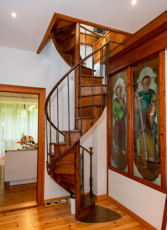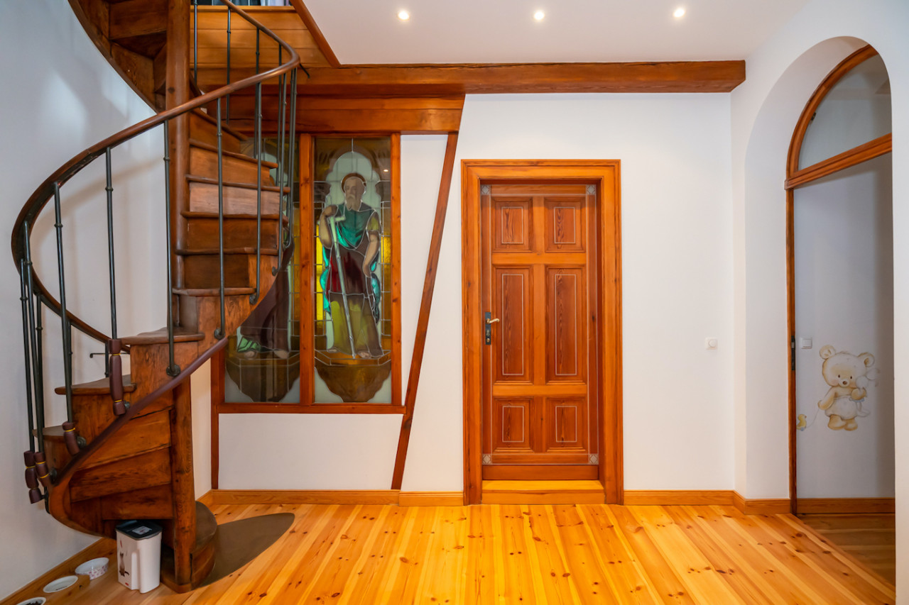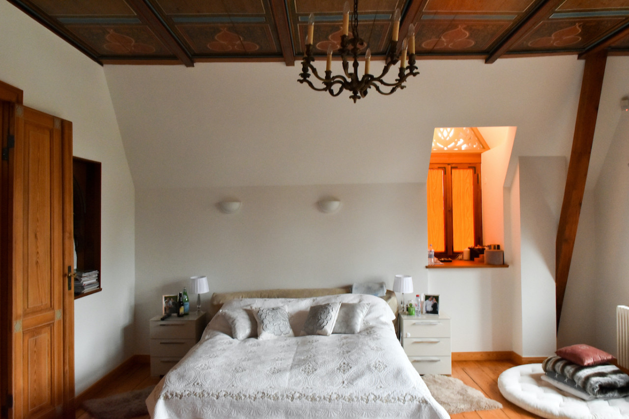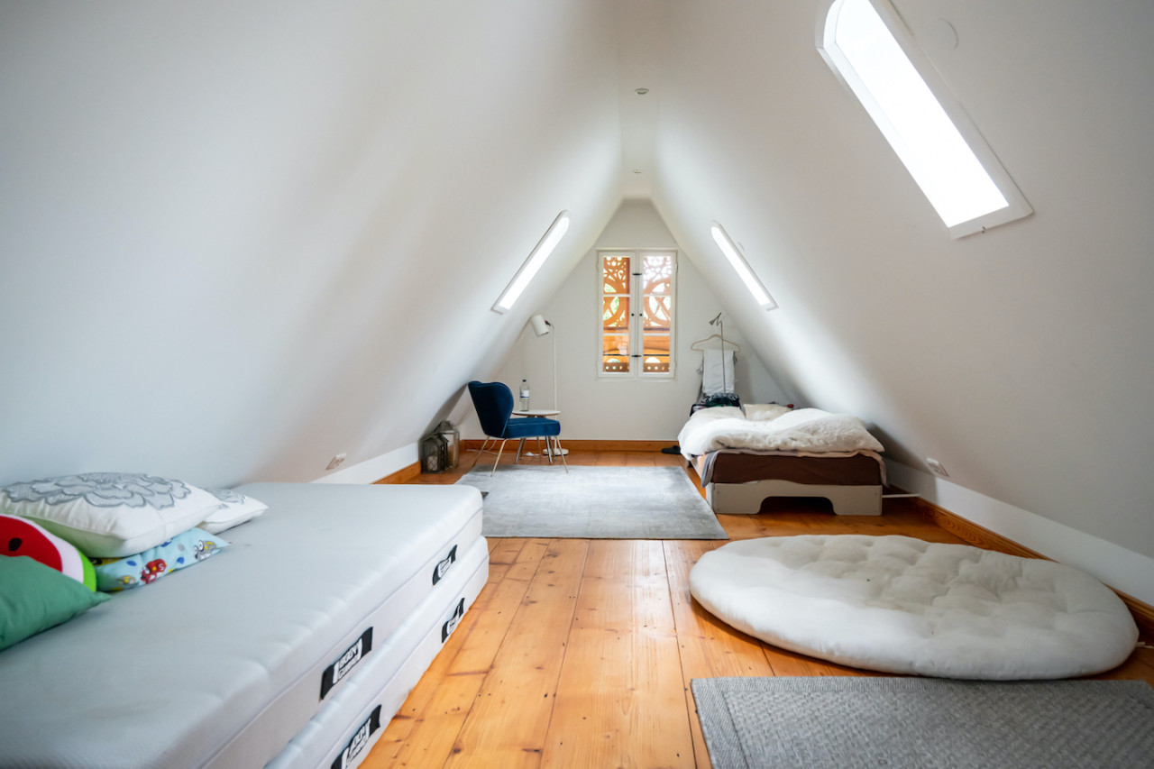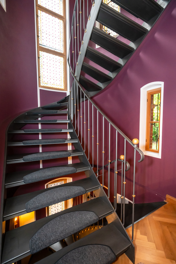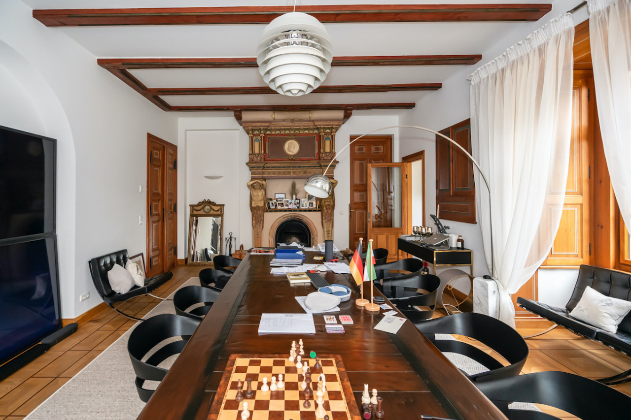 Inside, sweeping staircases—spiraling beneath grand stained glass windows and opulent chandeliers—connect a series of principal rooms curated with an eye for historical detail and modern comfort. Attic bedrooms with arched windows and exposed beams invite tranquil rest and atmospheric moments, while richly appointed living rooms—with classical fireplaces, carved mantelpieces, and a grand piano—suggest gatherings layered with character. Flexible spaces range from stately home offices with vintage-modern symmetry to creative children’s rooms and bright, carefully composed kitchens and dining areas. Architectural lighting, reflective surfaces, and curated furnishings imbue every space with an editorial edge, ensuring each room is photogenic, layered, and immersive for productions demanding authenticity and visual richness.