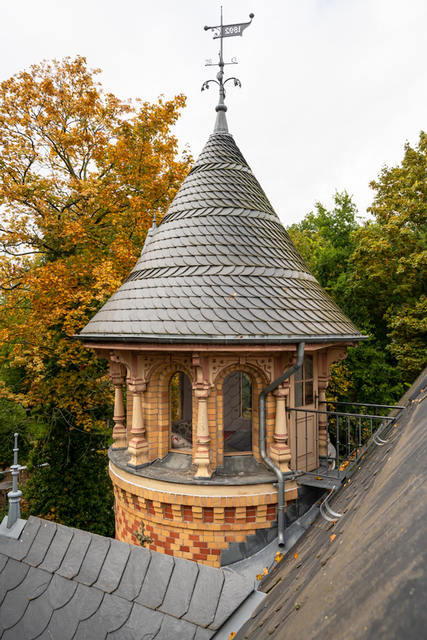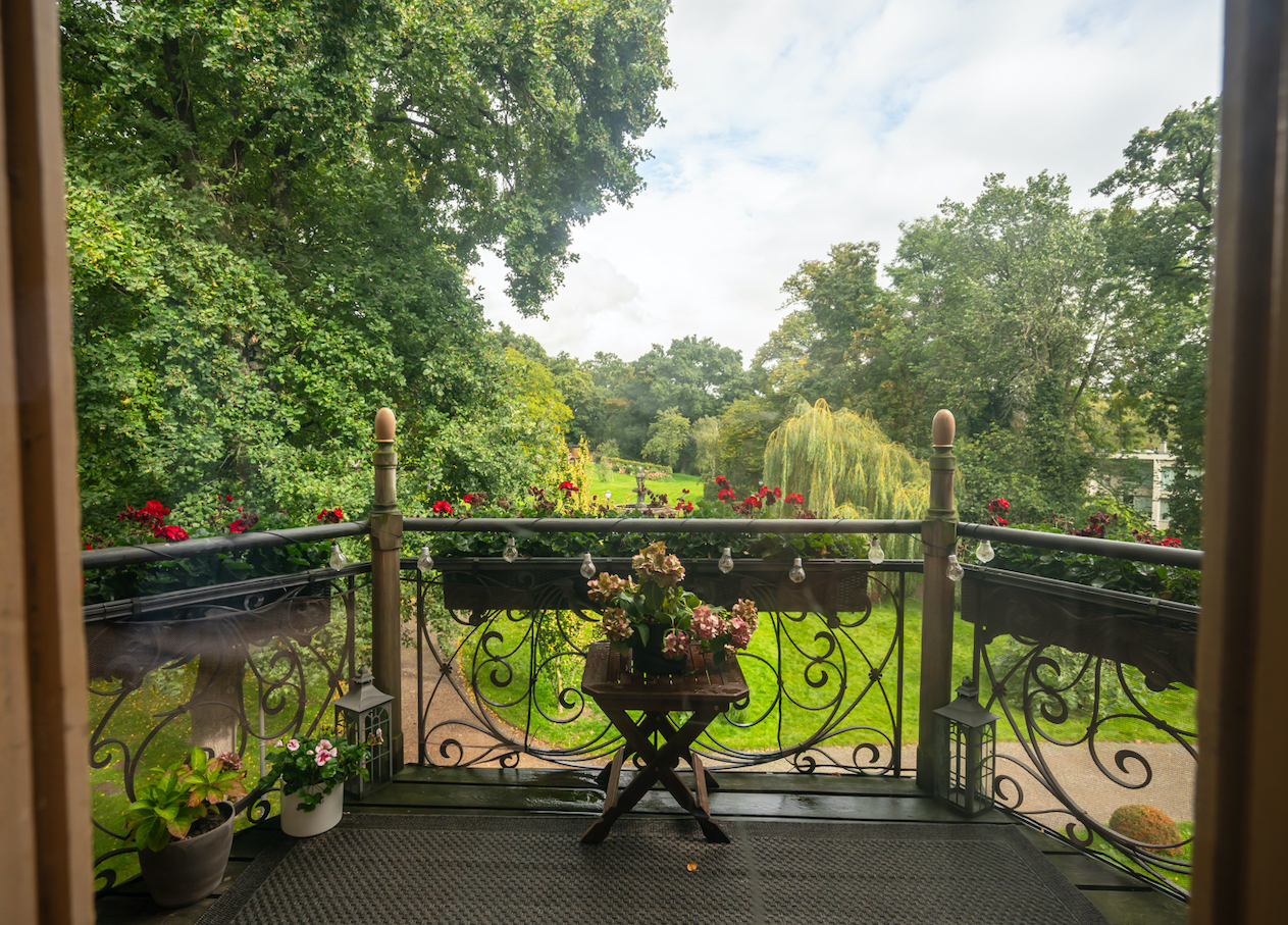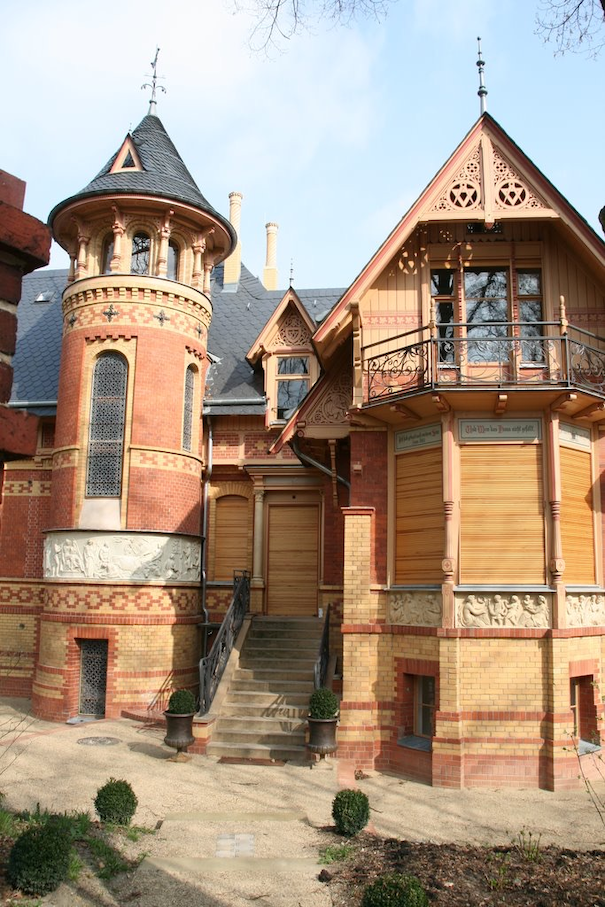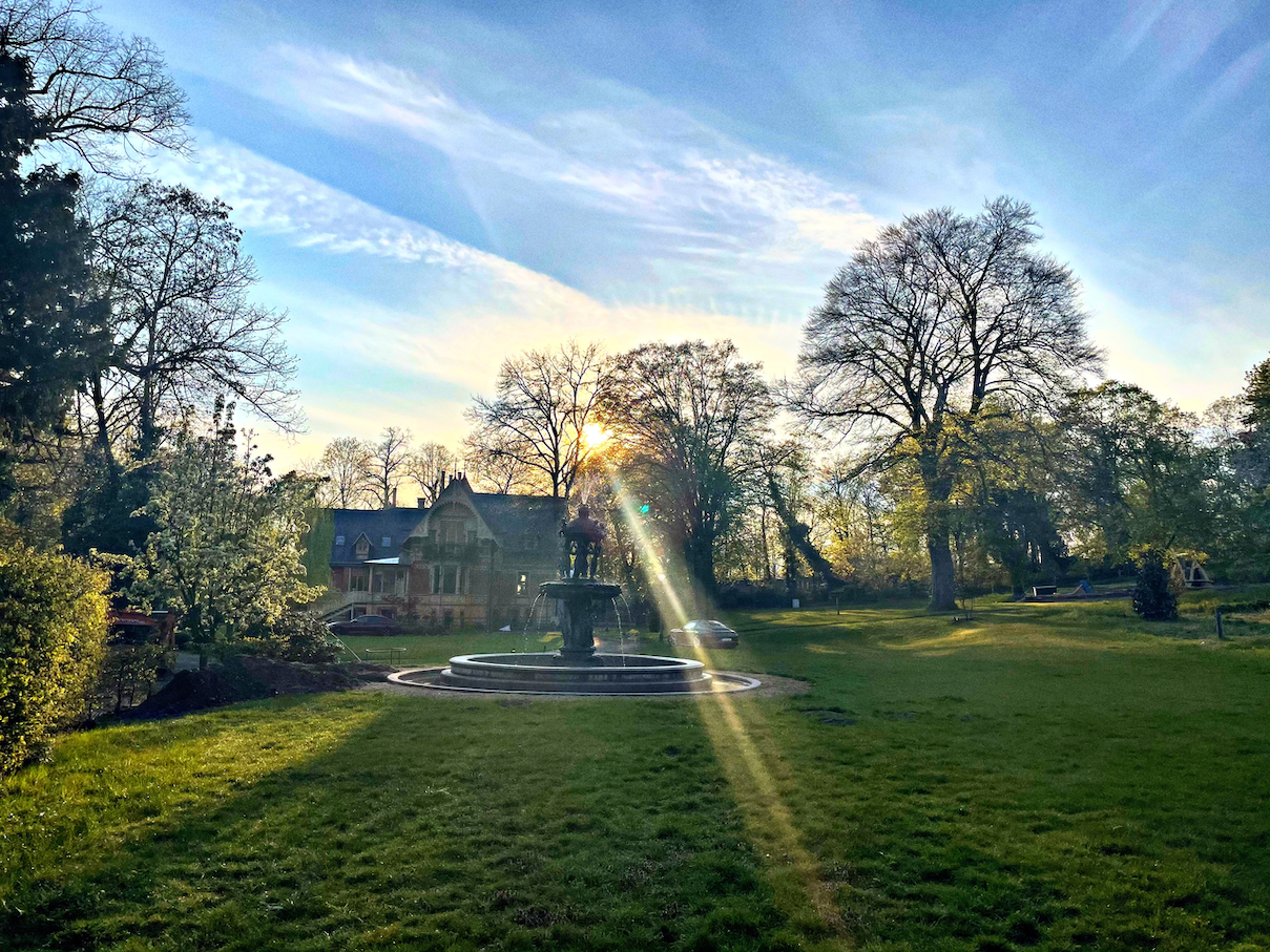 • A cinematic historic residence, visualized in rich brick and ornately carved wood, rises elegantly amidst lush, leafy gardens and mature trees. Turrets crowned by slate roofs and a distinctive weathervane punctuate the sky, while rhythmic red chimneys and mosaic-tiled accents lend a theatrical silhouette. Approached via a stately gated entrance, the grounds unfold through sun- and rain-dappled pathways, decorative sculptures, and a flowing fountain, offering layered vignettes and a sense of narrative drama—ideal for visual storytelling, editorial shoots, or immersive brand experiences.