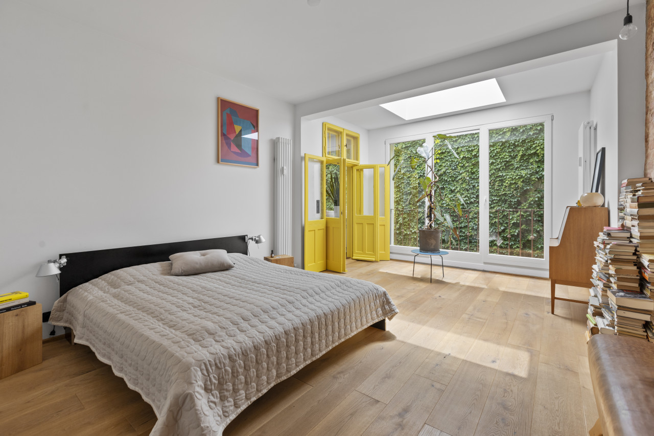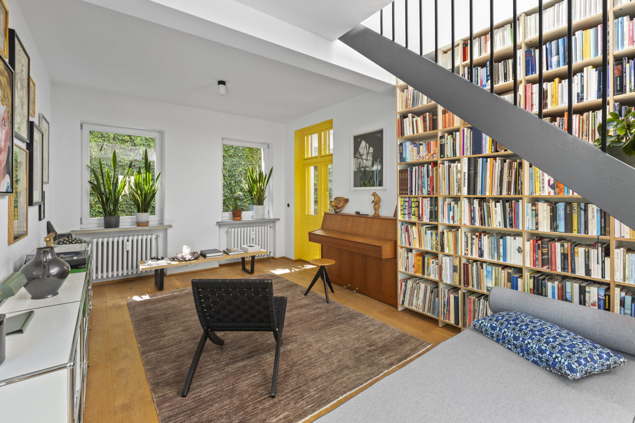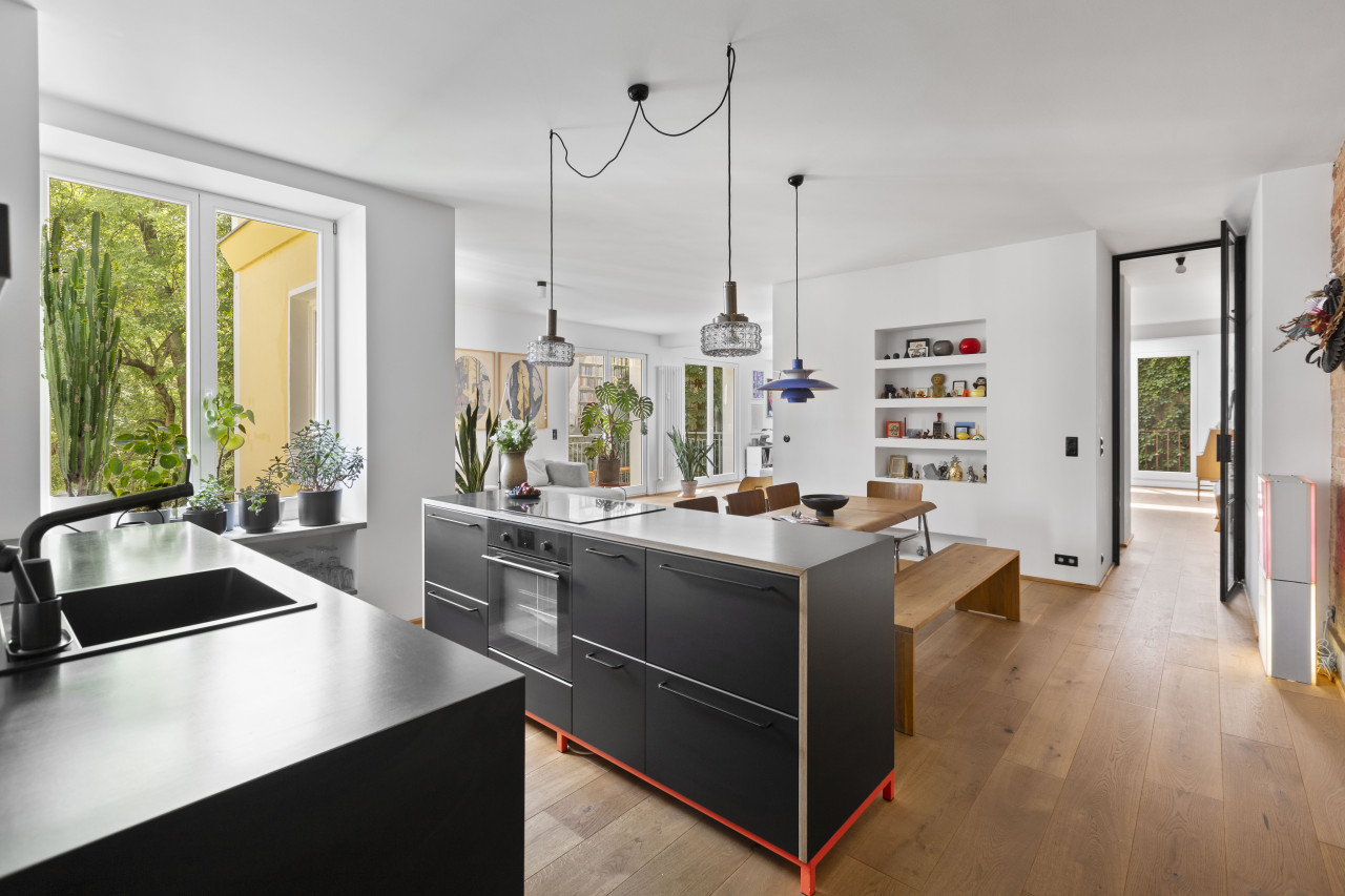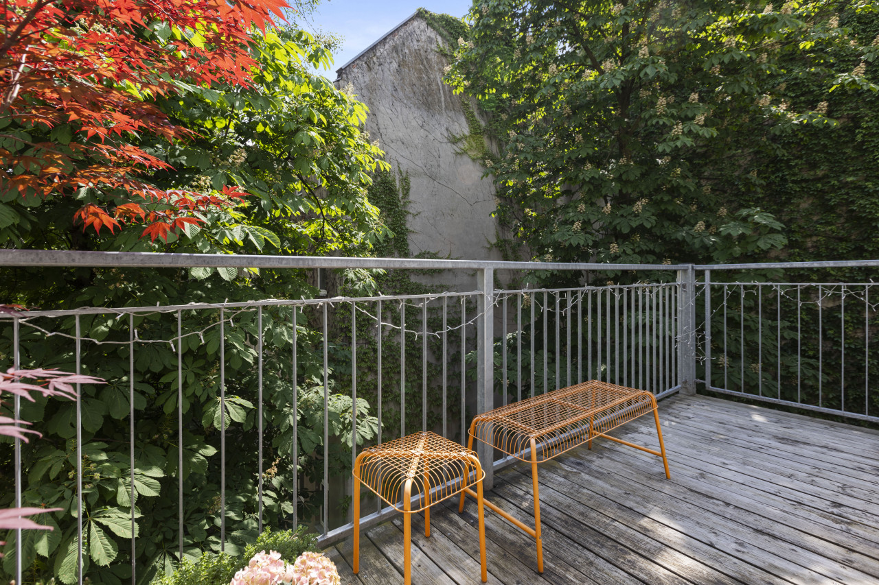 The apartment is located in the side wing of a historic building and impresses with its unique floor plan, created through a custom-designed renovation. High ceilings emphasize the open loft character and create a spacious feeling. Above the apartment, there is a large terrace offering a variety of possible uses. The adjacent studio is accessible separately both via the terrace and the staircase.