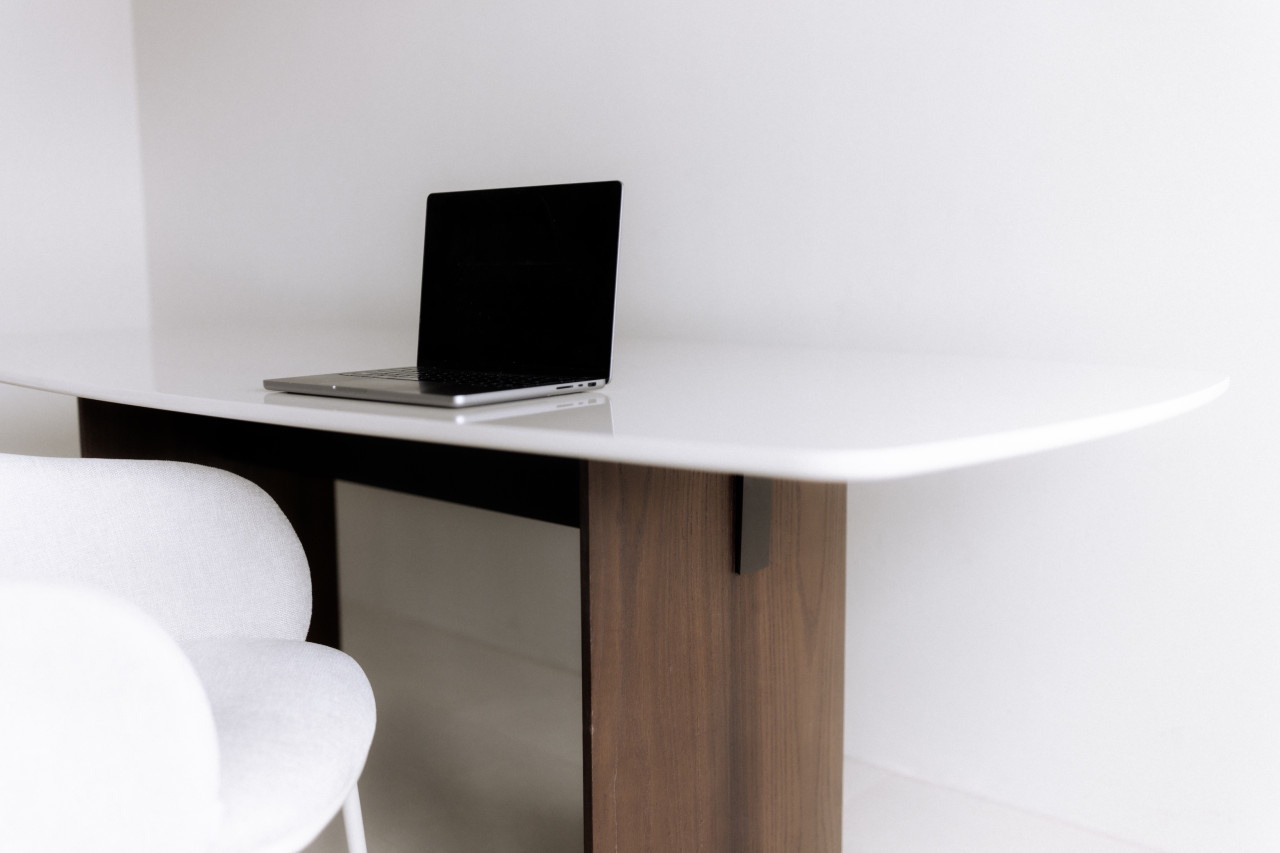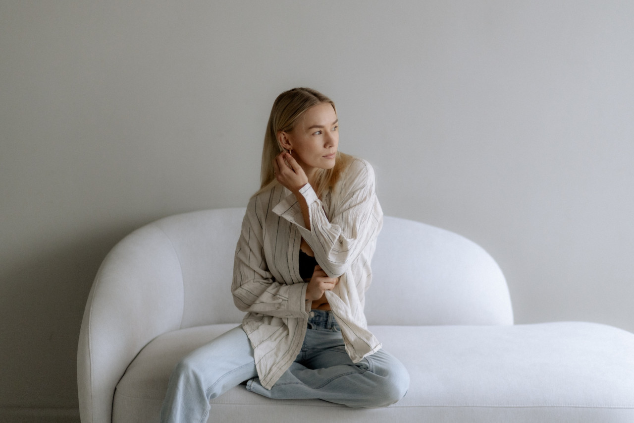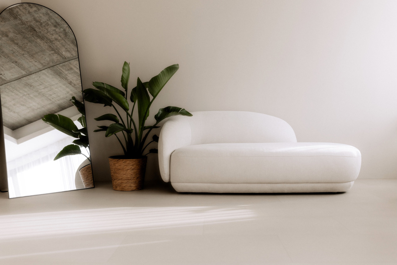 The first is a minimalist daylight studio (64 sqm), equipped with electric backdrop systems, a clean shooting wall, and a signature brown lime-washed arch wall. A curated selection of furniture — including a small white sofa, a white table, and several chairs — is included in the rental price and can be used flexibly for different setups.