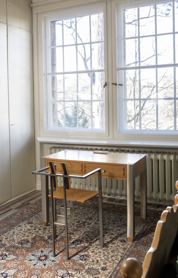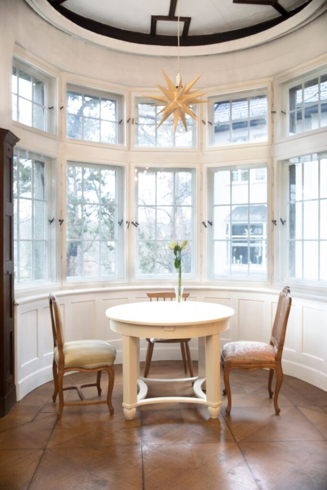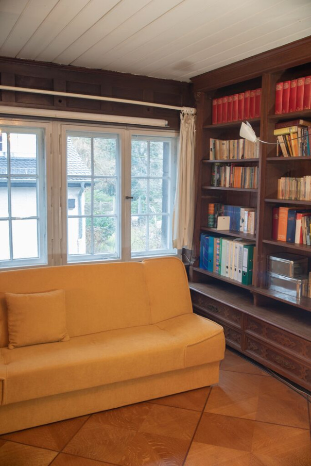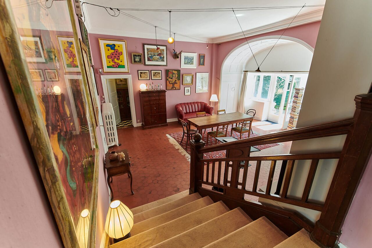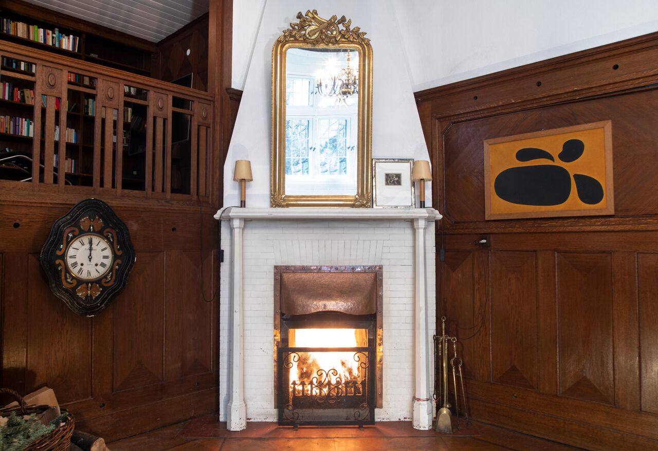 Boasting a terrace and tall, vintage double windows that frame the picturesque view outside of meadows and trees. Inside, the villa's interior is equally enchanting, with its fireplace, preserved historic wood paneling, parquet floors, a grand piano, a well-stocked library, and lofty ceilings. The property has retained its historical charm, making it an ideal choice for photo shoots or events that demand a distinctive and sophisticated setting.