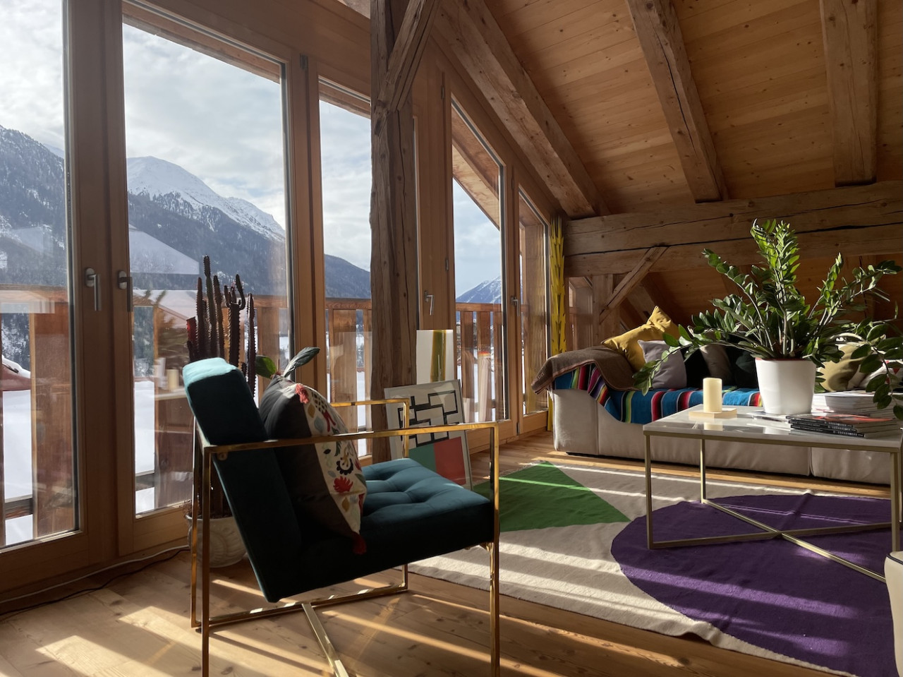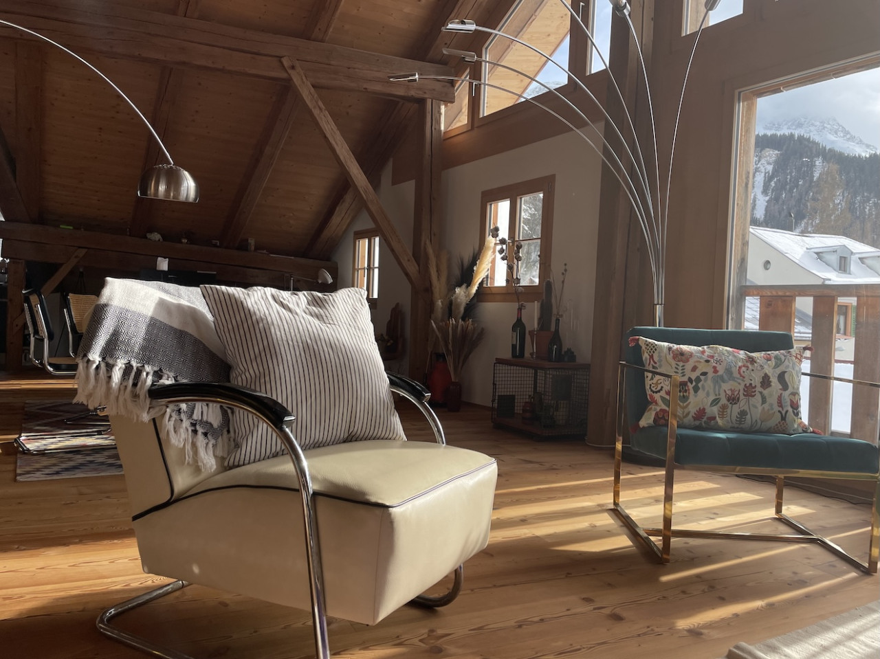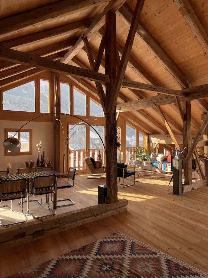 The interior is marked by exposed timber beams, high ceilings, and large windows that bring in soft alpine daylight. Natural materials — wood, stone and muted surfaces — give the space a grounded, authentic character, while the open layout allows for flexible setups and countless angles.