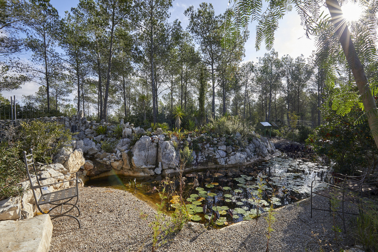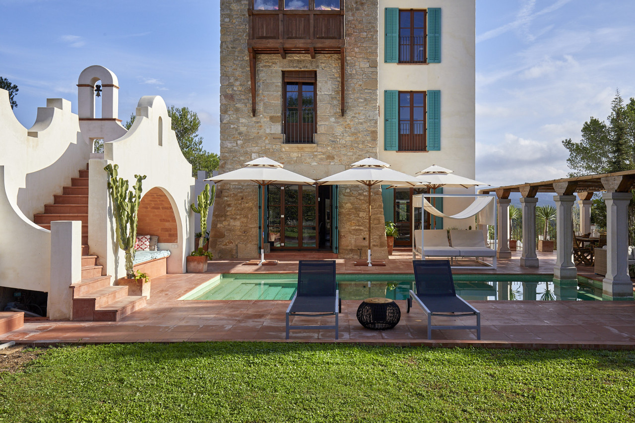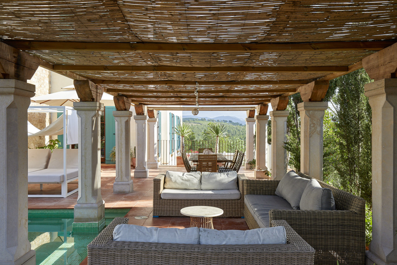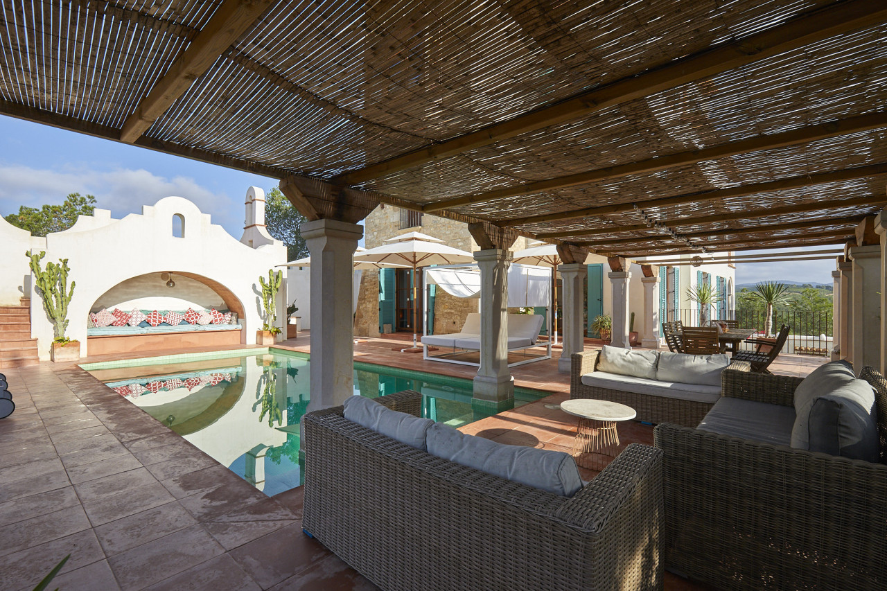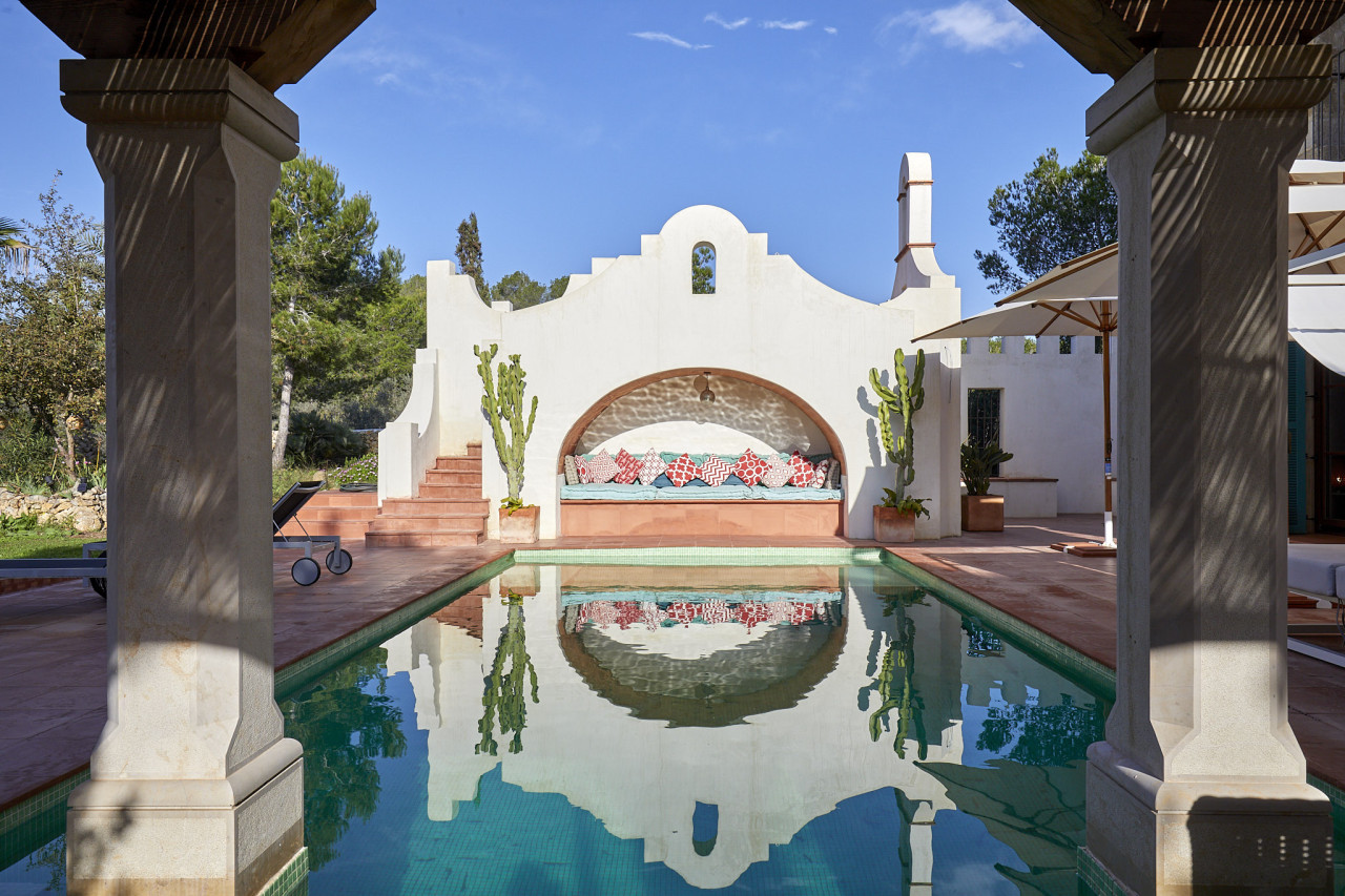 Outside, the property centres around a long turquoise pool framed by cactus-lined staircases, arched alcoves, and built-in lounge seating — a unique setting that merges Mediterranean charm with subtle desert inspiration. Beyond the pool area lies expansive countryside with uninterrupted views over forests and rolling hills, ideal for car shoots, lifestyle content, or establishing wide shots.
